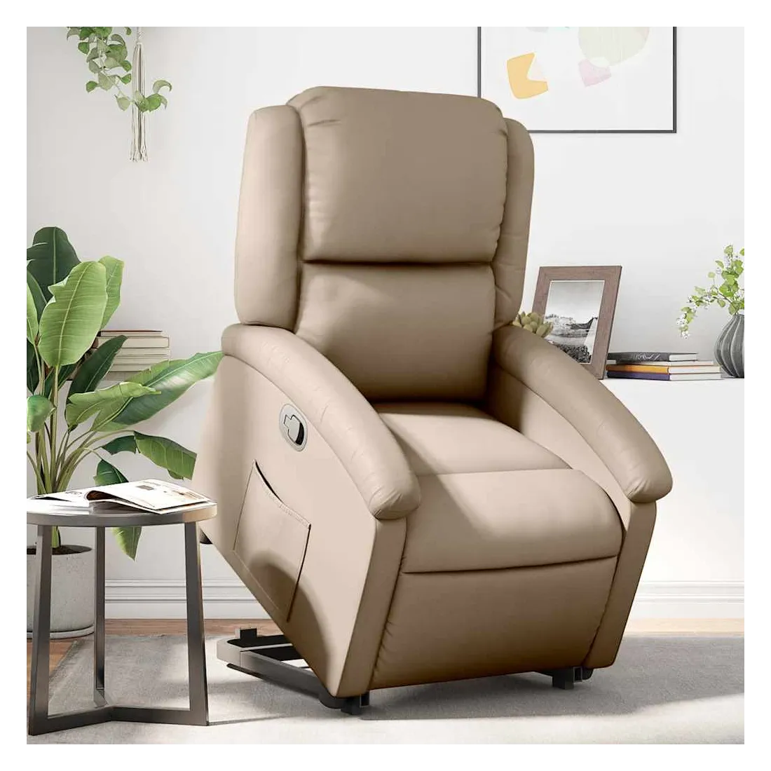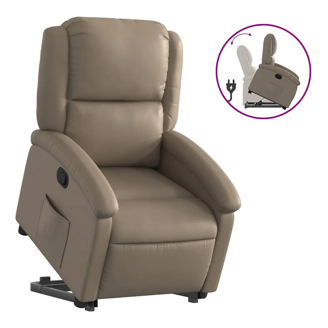 Asseyez-vous et détendez-vous dans ce fauteuil inclinable très confortable ! Fonction de levage électrique : ce fauteuil inclinable pour personnes âgées est équipé d'un moteur électrique pour la fonction de levage. Grâce à la fonction qui pousse toute la chaise vers le haut, vous pouvez facilement vous tenir debout sans stresser votre dos et vos genoux en appuyant simplement sur le bouton.Fonction d'inclinaison manuelle : ce fauteuil inclinable est doté d'une poignée du côté droit. Vous pouvez régler manuellement le repose-pieds et le dossier dans n'importe quelle position selon votre confort en tirant simplement sur la poignée. Cette fonction permet une inclinaison maximale de 135 degrés. De plus, le dossier peut revenir rapidement à sa position d'origine en tirant simplement sur la poignée.Expérience de siège confortable : le siège, le dossier et les larges accoudoirs rembourrés épais recouverts de similicuir procurent une sensation confortable, vous faisant vous sentir enlacé lorsque vous êtes assis. Le similicuir est un matériau très résistant. Il est résistant aux taches, ce qui le rend facile à nettoyer avec un chiffon humide. La surface lisse donne également un aspect luxueux et la beauté du cuir véritable.Poche latérale pratique : ce fauteuil est doté d'une poche latérale pour vous permettre de garder vos objets essentiels à portée de main.Cadre solide et stable : le cadre en bois et en métal offre une structure solide et une grande stabilité. Ce fauteuil inclinable est confortable et durable.