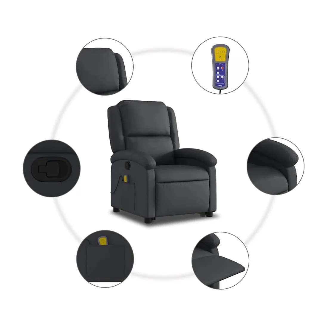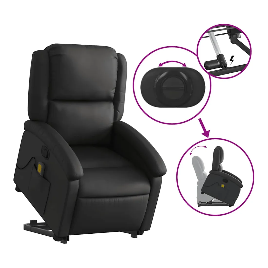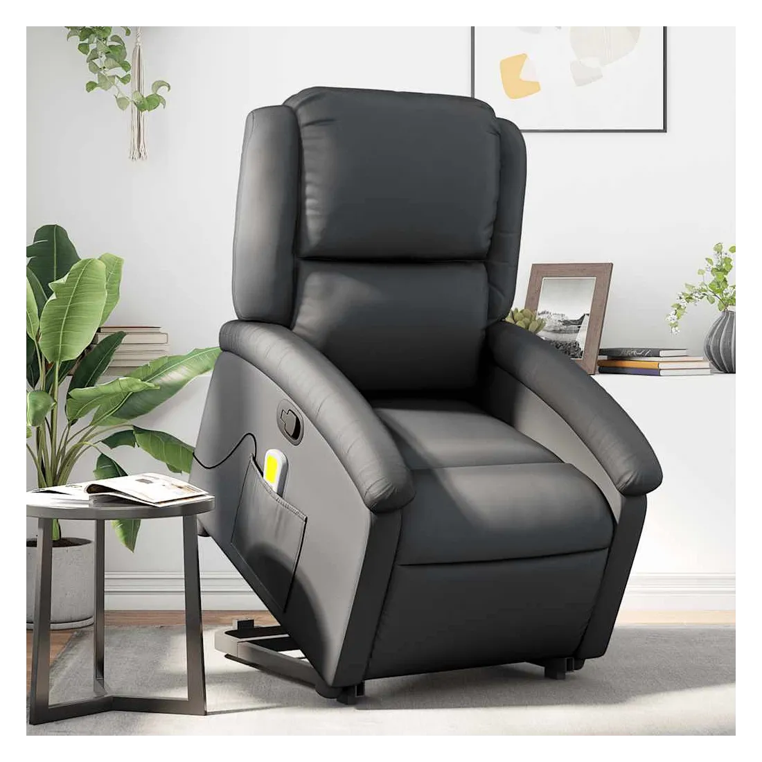 Asseyez-vous et détendez-vous dans ce fauteuil inclinable de massage très confortable ! Fonction de levage électrique : ce fauteuil inclinable pour personnes âgées est équipé d'un moteur électrique pour la fonction de levage. Grâce à la fonction qui pousse toute la chaise vers le haut, vous pouvez facilement vous tenir debout sans stresser votre dos et vos genoux en appuyant simplement sur le bouton.Fonction d'inclinaison manuelle : ce fauteuil inclinable est doté d'une poignée du côté droit. Vous pouvez régler manuellement le repose-pieds et le dossier dans n'importe quelle position selon votre confort en tirant simplement sur la poignée. Cette fonction permet une inclinaison maximale de 135 degrés. De plus, le dossier peut revenir rapidement à sa position d'origine en tirant simplement sur la poignée.Fonction de vibration : les 6 points de massage vous permettent de faire l'expérience d'un massage mieux ciblé. De plus, la télécommande incluse vous permet de choisir différents programmes de massage. La fonction de massage est alimentée par le connecteur USB qui nécessite une source d'alimentation USB certifiée de 5 V (non fournie).Expérience de siège confortable : le siège, le dossier et les larges accoudoirs rembourrés épais recouverts de cuir véritable procurent une sensation confortable et chaleureuse, vous faisant vous sentir enlacé lorsque vous êtes assis. Le cuir véritable est un matériau naturellement intemporel. Il peut durer toute une vie avec des soins et un entretien appropriés. La surface lisse lui donne également un aspect élégant tout en garantissant un confort optimal. Poche latérale pratique : ce fauteuil est doté d'une poche latérale pour ranger votre télécommande ou garder vos objets essentiels à portée de main.Cadre solide et stable : le cadre en bois et en métal offre une structure solide et une grande stabilité. Ce fauteuil inclinable est confortable et durable.