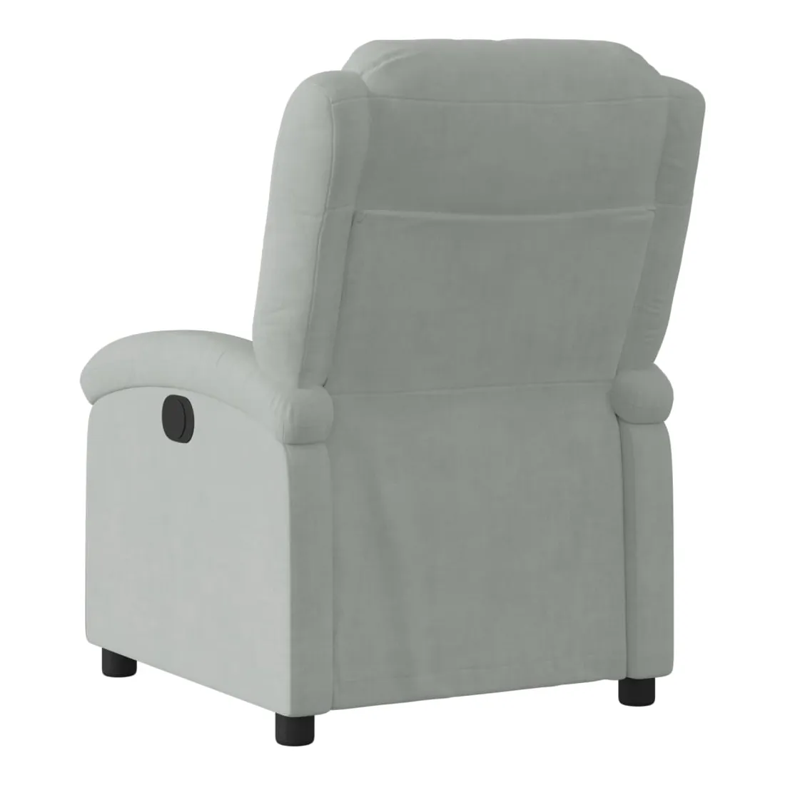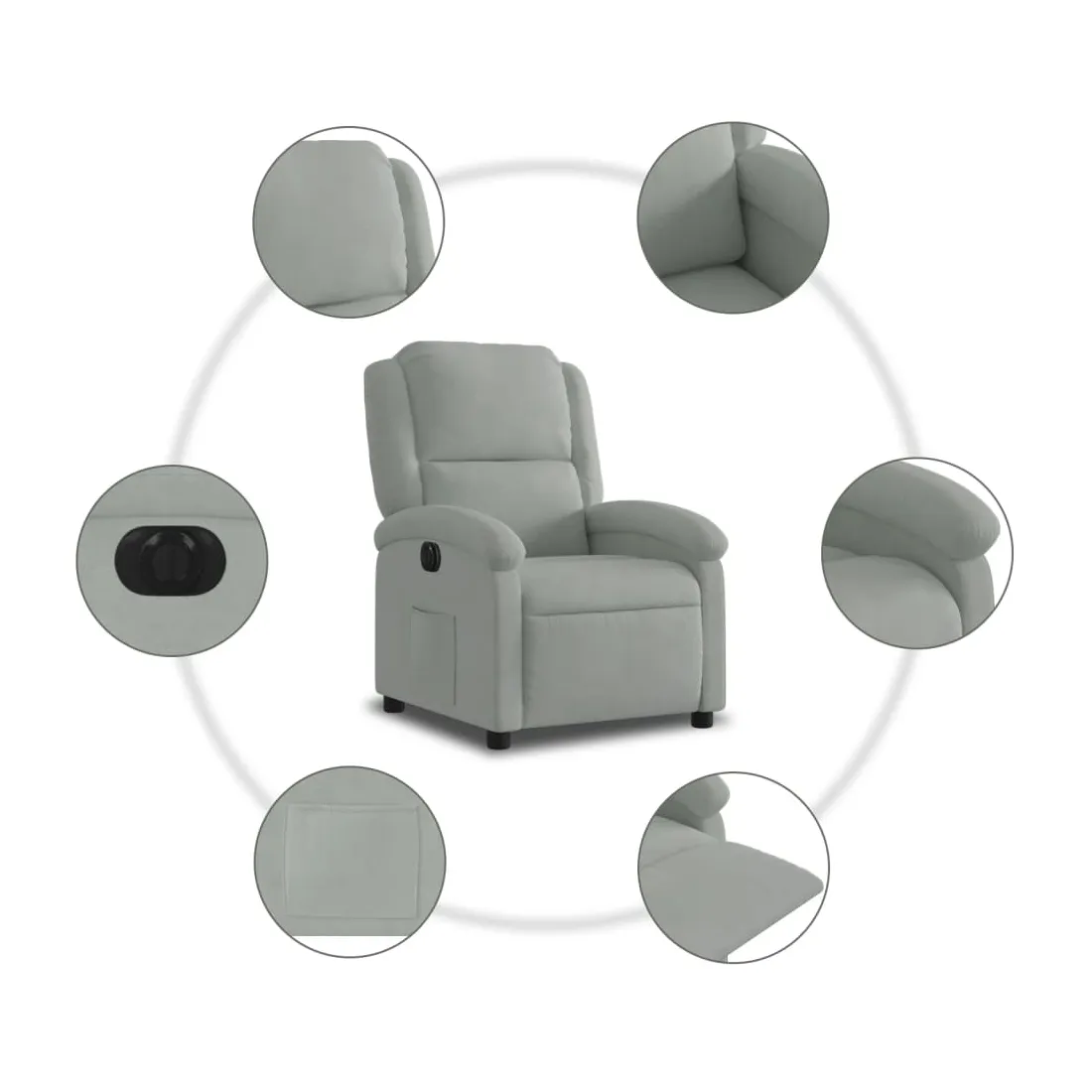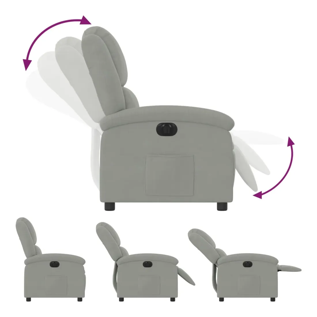 Asseyez-vous et détendez-vous dans ce fauteuil inclinable électrique très confortable ! Fonction d'inclinaison électrique : ce fauteuil inclinable est équipé d'un moteur électrique qui permet de régler automatiquement le repose-pied et le dossier dans n'importe quelle position, selon votre confort, en appuyant simplement sur le bouton situé sur le côté du fauteuil. Cette fonction permet une inclinaison maximale de 135 degrés. En outre, le dossier peut revenir automatiquement à sa position d'origine par une simple pression sur le bouton.Expérience d'assise confortable : le siège, le dossier et les larges accoudoirs rembourrés épais recouverts de velours procurent une sensation confortable et chaleureuse, vous faisant vous sentir enlacé lorsque vous êtes assis. Le velours est un tissu doux et confortable qui est agréable sur la peau.Poche latérale pratique : ce fauteuil est doté d'une poche latérale pour vous permettre de garder vos objets essentiels à portée de main.Cadre solide et stable : le cadre en bois et en métal offre une structure solide et une grande stabilité. Ce fauteuil inclinable est confortable et durable.