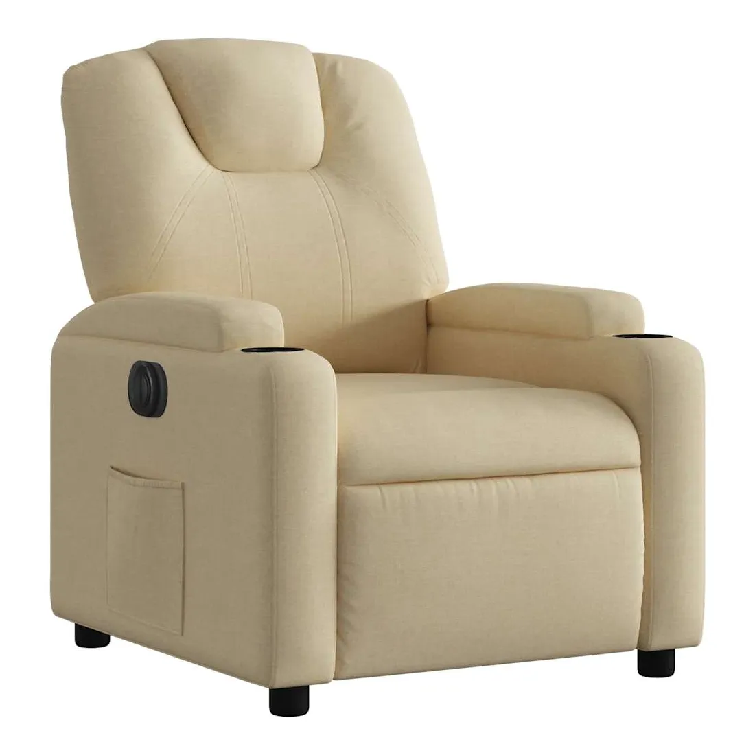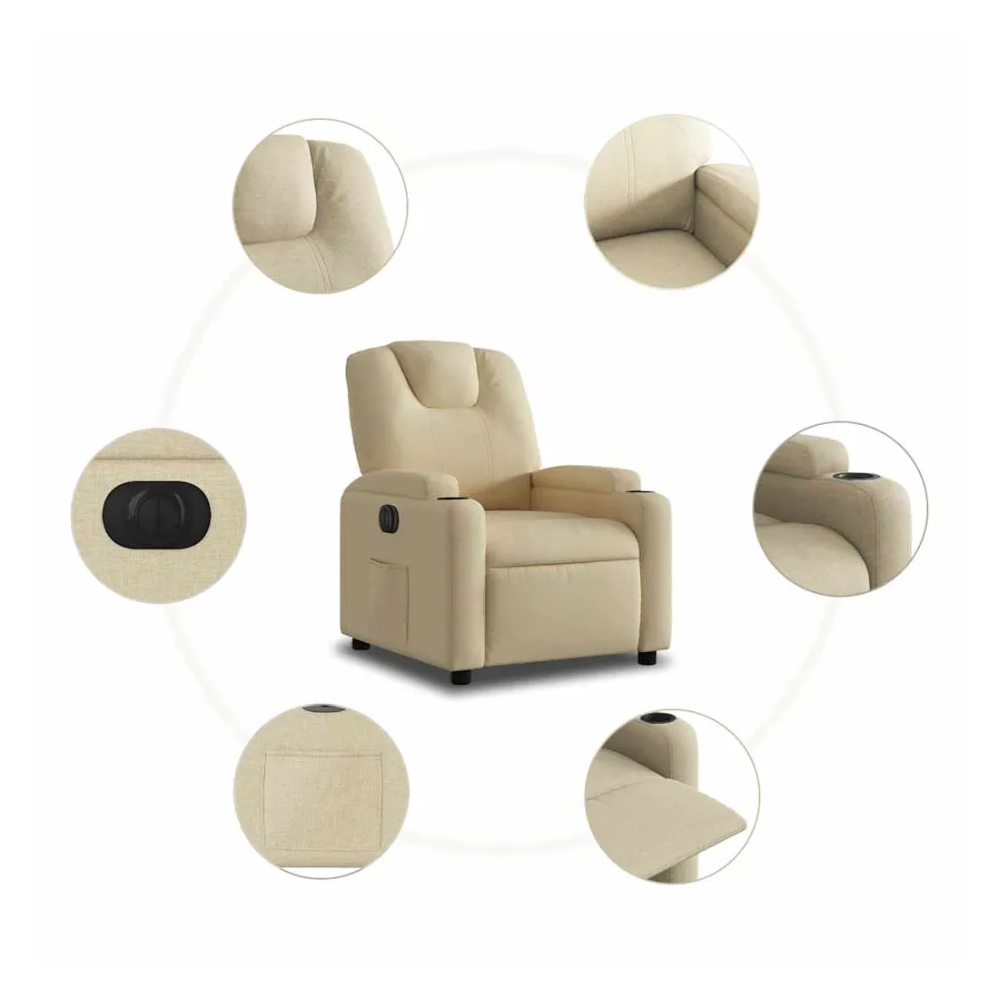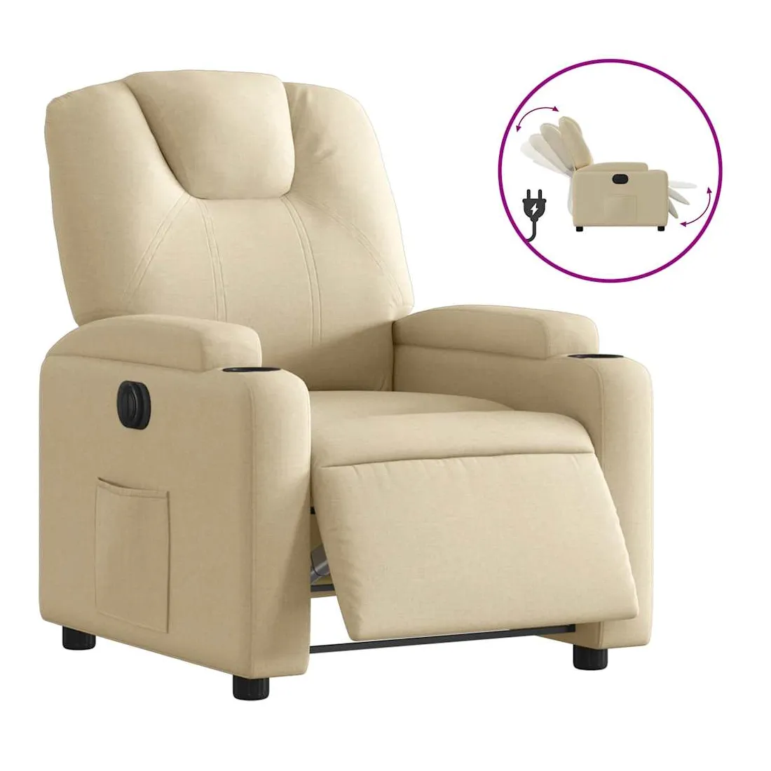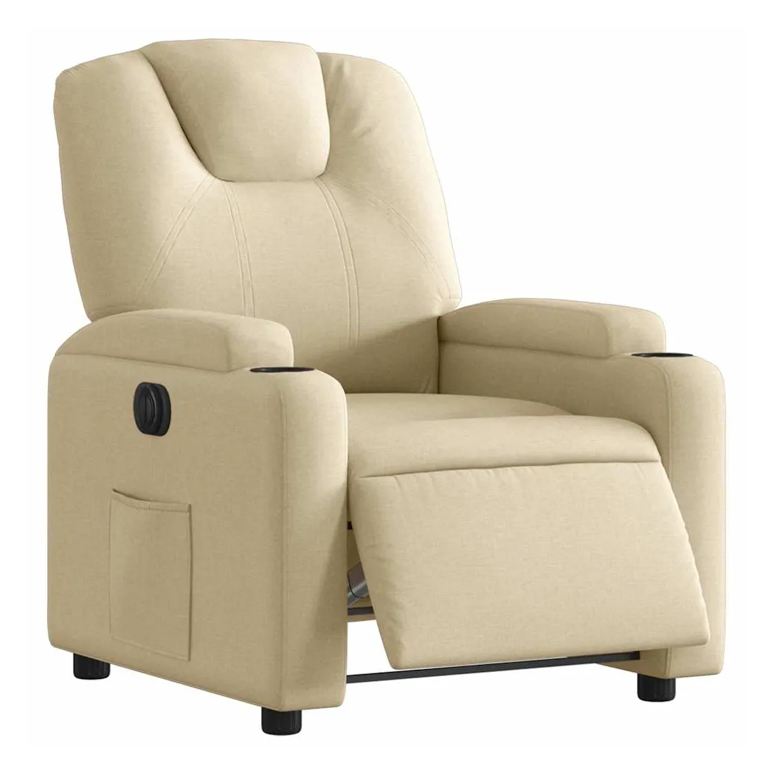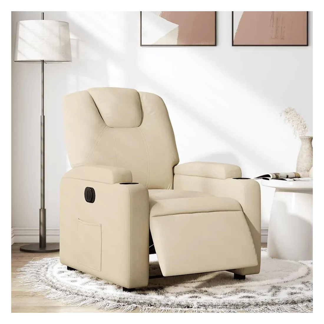 Asseyez-vous et détendez-vous dans ce fauteuil inclinable électrique très confortable ! Fonction d'inclinaison électrique : ce fauteuil inclinable est équipé d'un moteur électrique qui permet de régler automatiquement le repose-pied et le dossier dans n'importe quelle position, selon votre confort, en appuyant simplement sur le bouton situé sur le côté du fauteuil. Cette fonction permet une inclinaison maximale de 135 degrés. En outre, le dossier peut revenir automatiquement à sa position d'origine par une simple pression sur le bouton.Expérience d'assise confortable : le siège, le dossier et les larges accoudoirs bien rembourrés recouverts de tissu procurent une sensation confortable et chaleureuse, vous permettant de vous sentir enveloppé lorsque vous êtes assis. Le tissu présente un aspect simple et épuré et est respirant et durable.Porte-gobelets et poche latérale pratiques : ce fauteuil dispose de deux porte-gobelets pratiques pour vos boissons et d'une poche latérale pour garder vos objets essentiels à portée de main.Cadre solide et stable : le cadre en bois et en métal offre une structure solide et une grande stabilité. Ce fauteuil inclinable est confortable et durable.
