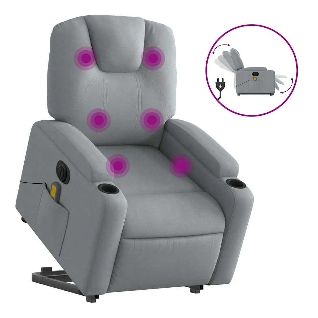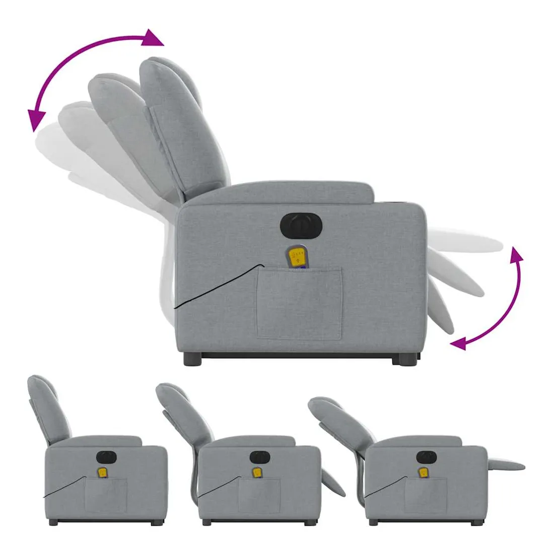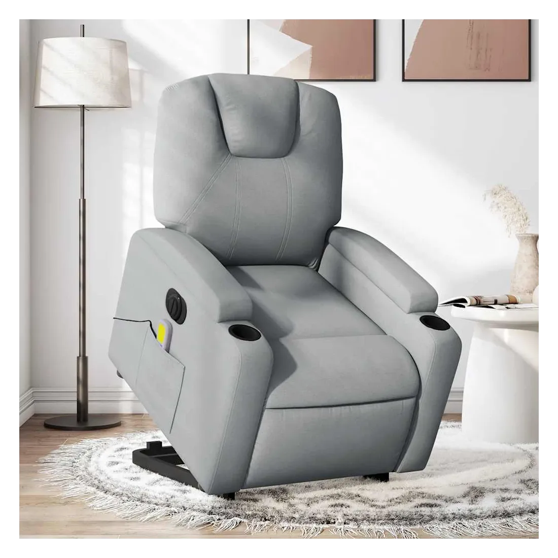 Asseyez-vous et détendez-vous dans ce fauteuil inclinable de massage électrique très confortable ! Fonction de levage électrique : ce fauteuil inclinable pour personnes âgées est équipé d'un moteur électrique pour la fonction de levage. Grâce à la fonction qui pousse toute la chaise vers le haut, vous pouvez facilement vous tenir debout sans stresser votre dos et vos genoux en appuyant simplement sur le bouton.Fonction d'inclinaison électrique : ce fauteuil inclinable est également équipé d'un moteur électrique qui permet de régler automatiquement le repose-pied et le dossier dans n'importe quelle position, selon votre confort, en appuyant simplement sur le bouton situé sur le côté du fauteuil. Cette fonction permet une inclinaison maximale de 135 degrés. En outre, le dossier peut revenir automatiquement à sa position d'origine par une simple pression sur le bouton.Fonction de vibration : les 6 points de massage vous permettent de faire l'expérience d'un massage mieux ciblé. De plus, la télécommande incluse vous permet de choisir différents programmes de massage. La fonction de massage est alimentée par le connecteur USB qui nécessite une source d'alimentation USB certifiée de 5 V (non fournie).Expérience d'assise confortable : le siège, le dossier et les larges accoudoirs bien rembourrés recouverts de tissu procurent une sensation confortable et chaleureuse, vous permettant de vous sentir enveloppé lorsque vous êtes assis. Le tissu présente un aspect simple et épuré et est respirant et durable.Porte-gobelets et poche latérale pratiques : ce fauteuil dispose de deux porte-gobelets pratiques pour vos boissons et d'une poche latérale pour votre télécommande ou pour garder vos objets essentiels à portée de main.Cadre solide et stable : le cadre en bois et en métal offre une structure solide et une grande stabilité. Ce fauteuil inclinable est confortable et durable.