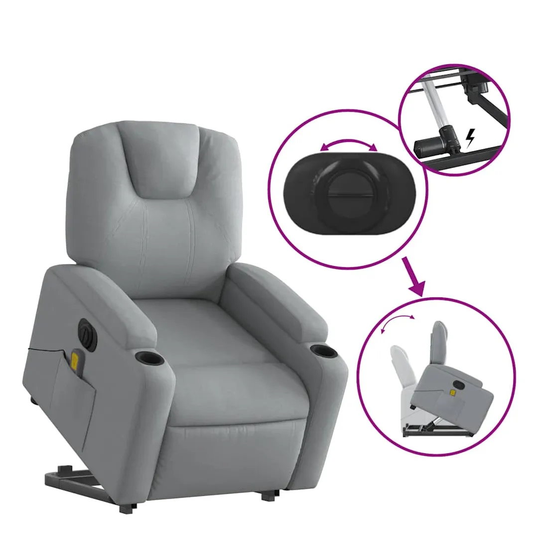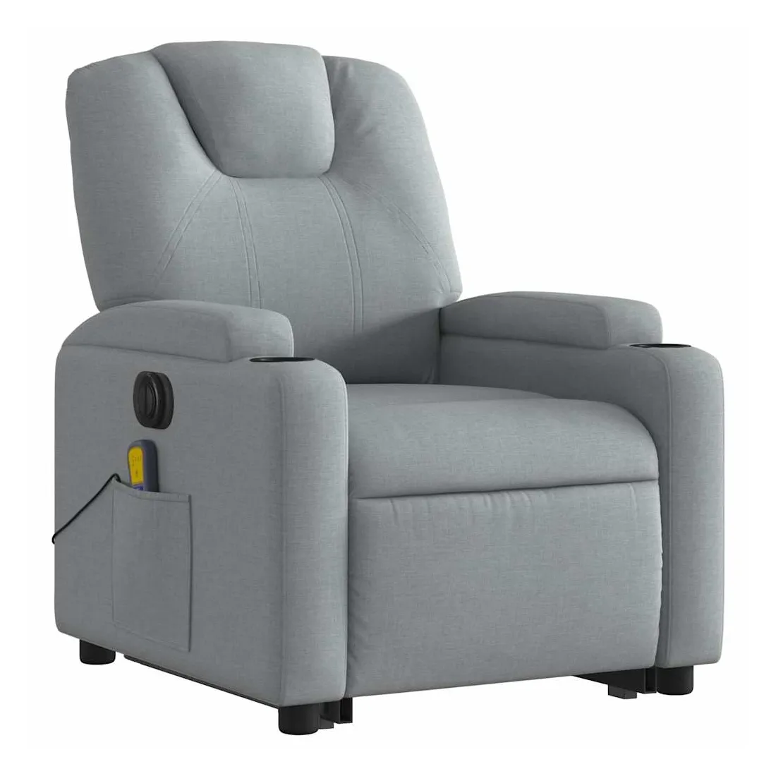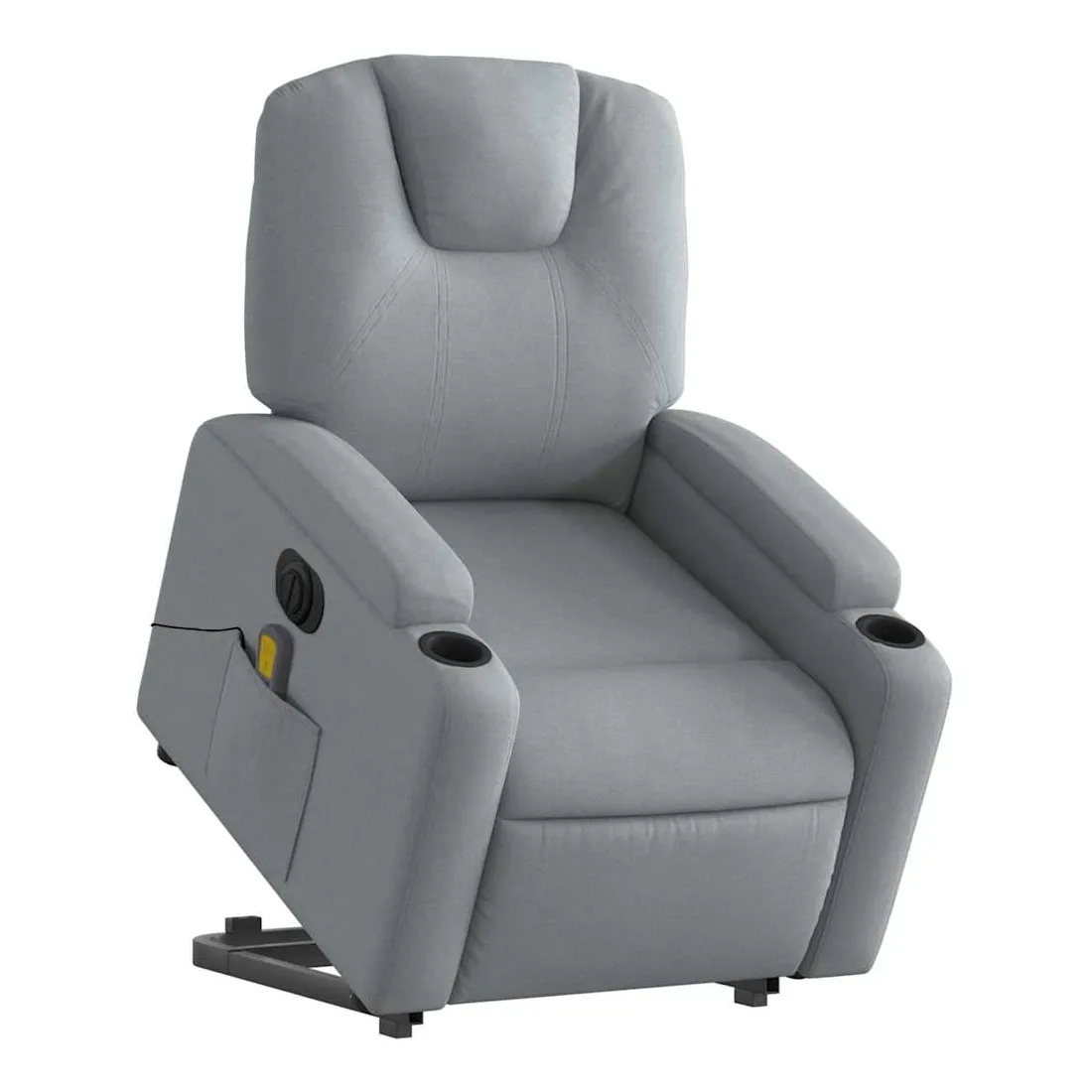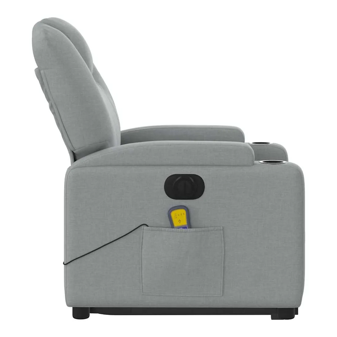 Asseyez-vous et détendez-vous dans ce fauteuil inclinable de massage électrique très confortable ! Fonction de levage électrique : ce fauteuil inclinable pour personnes âgées est équipé d'un moteur électrique pour la fonction de levage. Grâce à la fonction qui pousse toute la chaise vers le haut, vous pouvez facilement vous tenir debout sans stresser votre dos et vos genoux en appuyant simplement sur le bouton.Fonction d'inclinaison électrique : ce fauteuil inclinable est également équipé d'un moteur électrique qui permet de régler automatiquement le repose-pied et le dossier dans n'importe quelle position, selon votre confort, en appuyant simplement sur le bouton situé sur le côté du fauteuil. Cette fonction permet une inclinaison maximale de 135 degrés. En outre, le dossier peut revenir automatiquement à sa position d'origine par une simple pression sur le bouton.Fonction de vibration : les 6 points de massage vous permettent de faire l'expérience d'un massage mieux ciblé. De plus, la télécommande incluse vous permet de choisir différents programmes de massage. La fonction de massage est alimentée par le connecteur USB qui nécessite une source d'alimentation USB certifiée de 5 V (non fournie).Expérience d'assise confortable : le siège, le dossier et les larges accoudoirs bien rembourrés recouverts de tissu procurent une sensation confortable et chaleureuse, vous permettant de vous sentir enveloppé lorsque vous êtes assis. Le tissu présente un aspect simple et épuré et est respirant et durable.Porte-gobelets et poche latérale pratiques : ce fauteuil dispose de deux porte-gobelets pratiques pour vos boissons et d'une poche latérale pour votre télécommande ou pour garder vos objets essentiels à portée de main.Cadre solide et stable : le cadre en bois et en métal offre une structure solide et une grande stabilité. Ce fauteuil inclinable est confortable et durable.
