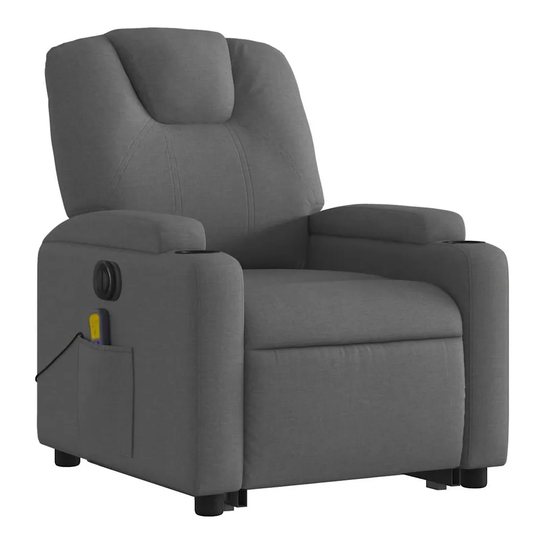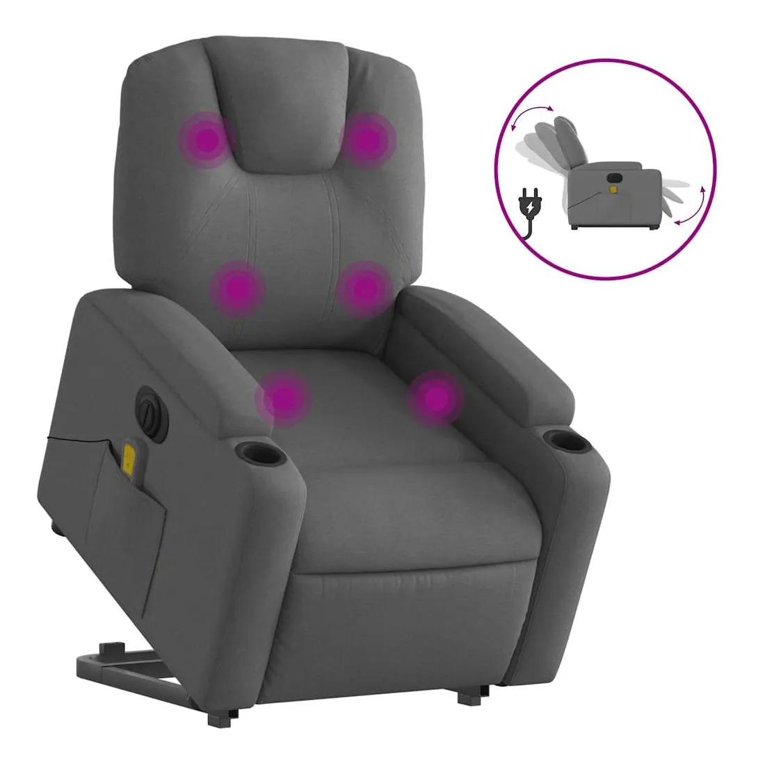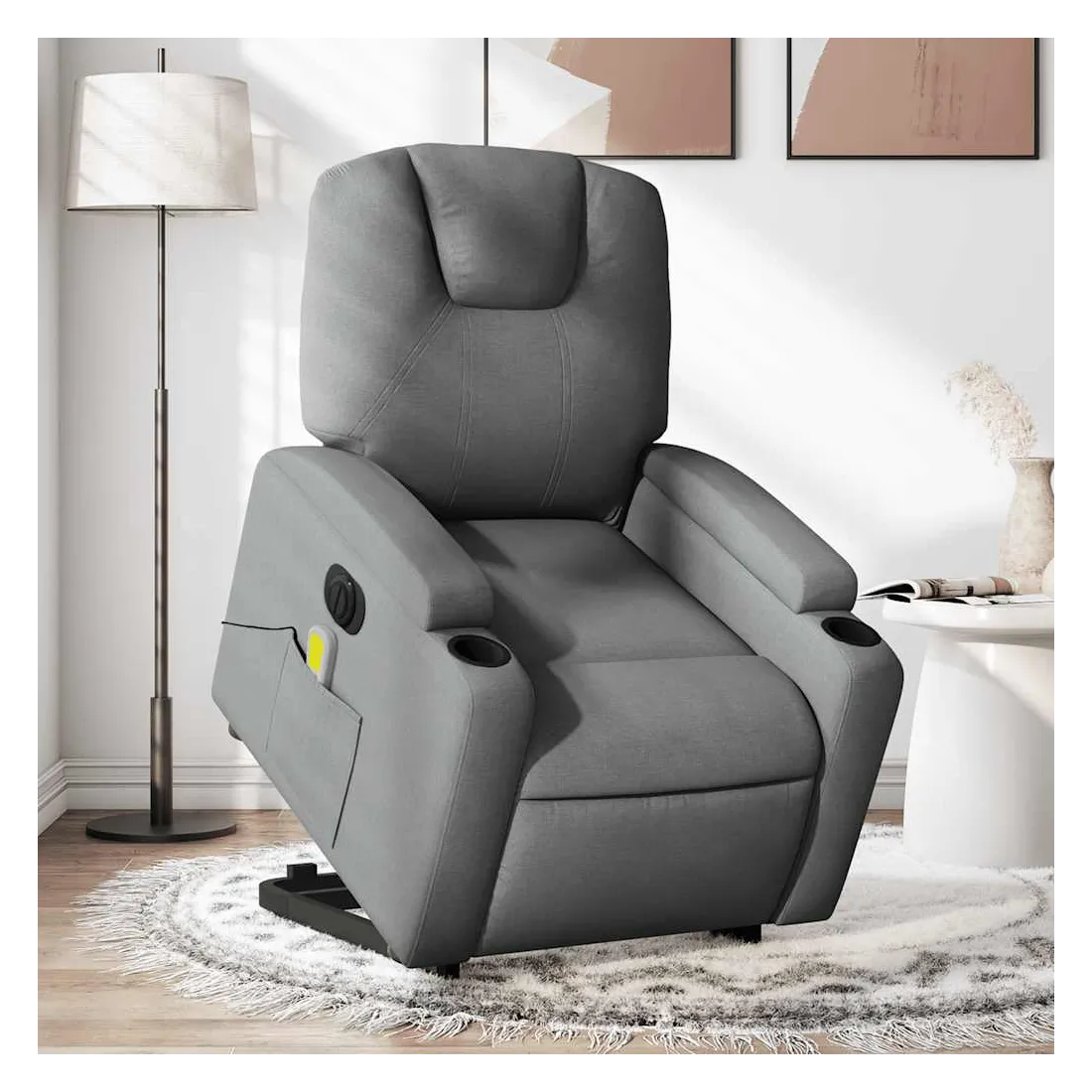 Asseyez-vous et détendez-vous dans ce fauteuil inclinable de massage électrique très confortable ! Fonction de levage électrique : ce fauteuil inclinable pour personnes âgées est équipé d'un moteur électrique pour la fonction de levage. Grâce à la fonction qui pousse toute la chaise vers le haut, vous pouvez facilement vous tenir debout sans stresser votre dos et vos genoux en appuyant simplement sur le bouton.Fonction d'inclinaison électrique : ce fauteuil inclinable est également équipé d'un moteur électrique qui permet de régler automatiquement le repose-pied et le dossier dans n'importe quelle position, selon votre confort, en appuyant simplement sur le bouton situé sur le côté du fauteuil. Cette fonction permet une inclinaison maximale de 135 degrés. En outre, le dossier peut revenir automatiquement à sa position d'origine par une simple pression sur le bouton.Fonction de vibration : les 6 points de massage vous permettent de faire l'expérience d'un massage mieux ciblé. De plus, la télécommande incluse vous permet de choisir différents programmes de massage. La fonction de massage est alimentée par le connecteur USB qui nécessite une source d'alimentation USB certifiée de 5 V (non fournie).Expérience d'assise confortable : le siège, le dossier et les larges accoudoirs bien rembourrés recouverts de tissu procurent une sensation confortable et chaleureuse, vous permettant de vous sentir enveloppé lorsque vous êtes assis. Le tissu présente un aspect simple et épuré et est respirant et durable.Porte-gobelets et poche latérale pratiques : ce fauteuil dispose de deux porte-gobelets pratiques pour vos boissons et d'une poche latérale pour votre télécommande ou pour garder vos objets essentiels à portée de main.Cadre solide et stable : le cadre en bois et en métal offre une structure solide et une grande stabilité. Ce fauteuil inclinable est confortable et durable.