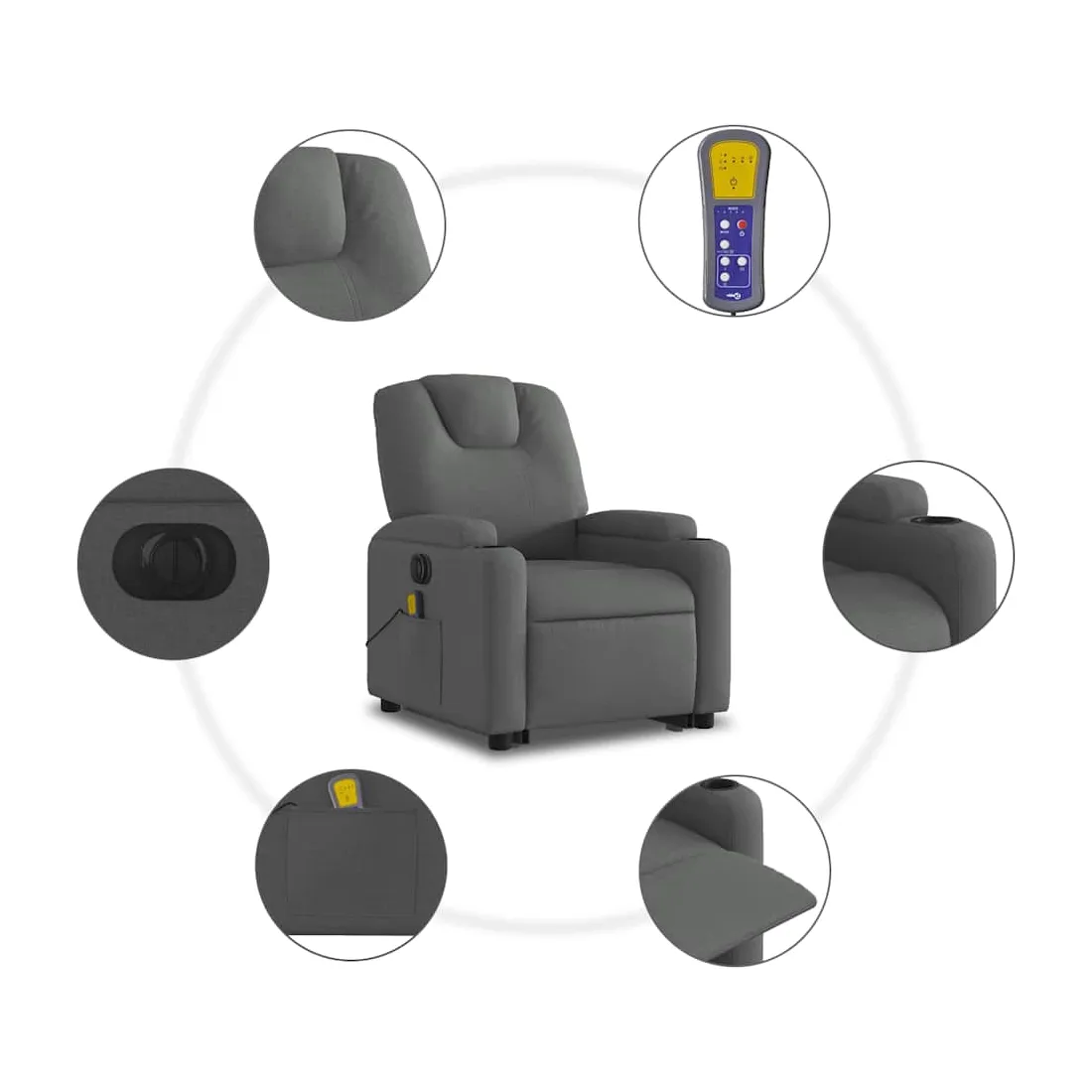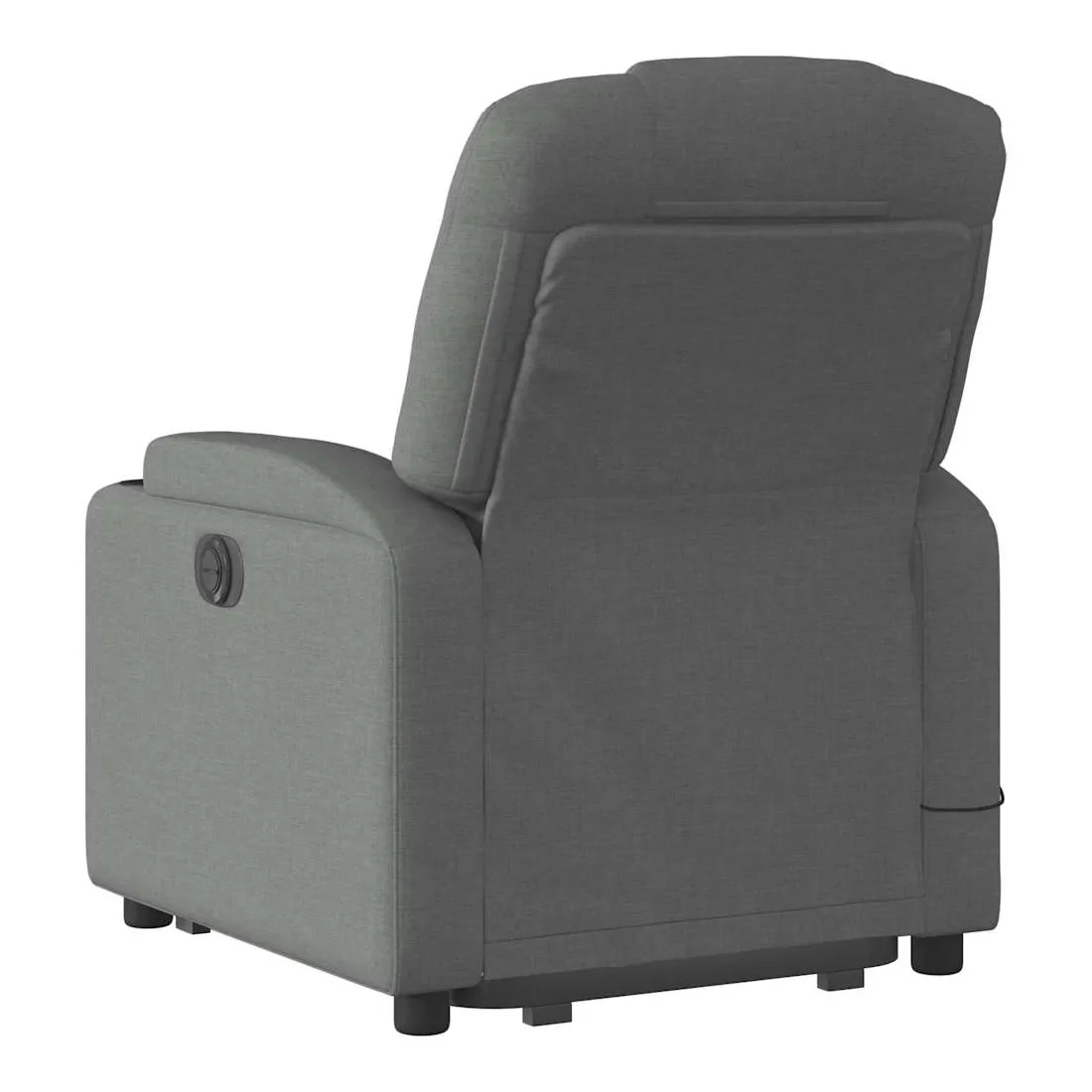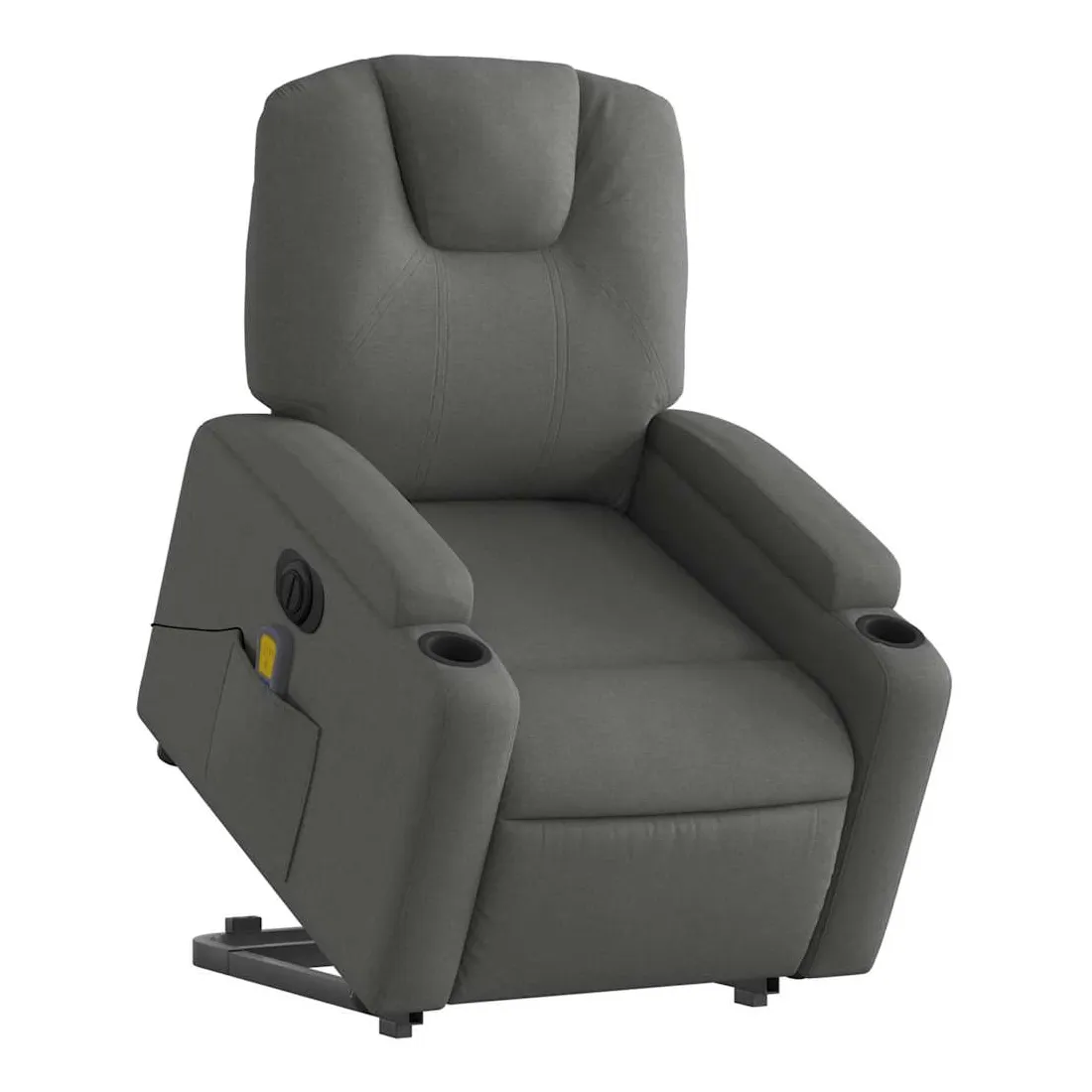 Asseyez-vous et détendez-vous dans ce fauteuil inclinable de massage électrique très confortable ! Fonction de levage électrique : ce fauteuil inclinable pour personnes âgées est équipé d'un moteur électrique pour la fonction de levage. Grâce à la fonction qui pousse toute la chaise vers le haut, vous pouvez facilement vous tenir debout sans stresser votre dos et vos genoux en appuyant simplement sur le bouton.Fonction d'inclinaison électrique : ce fauteuil inclinable est également équipé d'un moteur électrique qui permet de régler automatiquement le repose-pied et le dossier dans n'importe quelle position, selon votre confort, en appuyant simplement sur le bouton situé sur le côté du fauteuil. Cette fonction permet une inclinaison maximale de 135 degrés. En outre, le dossier peut revenir automatiquement à sa position d'origine par une simple pression sur le bouton.Fonction de vibration : les 6 points de massage vous permettent de faire l'expérience d'un massage mieux ciblé. De plus, la télécommande incluse vous permet de choisir différents programmes de massage. La fonction de massage est alimentée par le connecteur USB qui nécessite une source d'alimentation USB certifiée de 5 V (non fournie).Expérience d'assise confortable : le siège, le dossier et les larges accoudoirs bien rembourrés recouverts de tissu procurent une sensation confortable et chaleureuse, vous permettant de vous sentir enveloppé lorsque vous êtes assis. Le tissu présente un aspect simple et épuré et est respirant et durable.Porte-gobelets et poche latérale pratiques : ce fauteuil dispose de deux porte-gobelets pratiques pour vos boissons et d'une poche latérale pour votre télécommande ou pour garder vos objets essentiels à portée de main.Cadre solide et stable : le cadre en bois et en métal offre une structure solide et une grande stabilité. Ce fauteuil inclinable est confortable et durable.