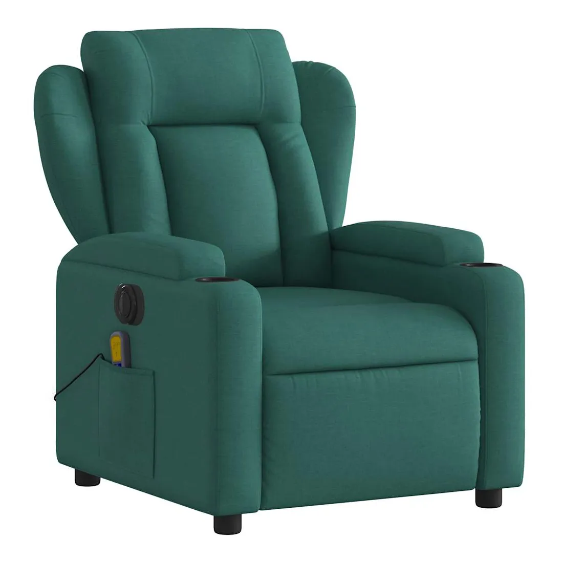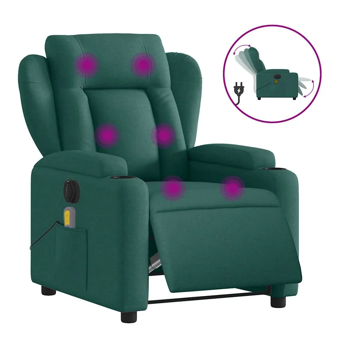 Asseyez-vous et détendez-vous dans ce fauteuil inclinable de massage électrique très confortable ! Fonction d'inclinaison électrique : ce fauteuil inclinable est équipé d'un moteur électrique qui permet de régler automatiquement le repose-pied et le dossier dans n'importe quelle position, selon votre confort, en appuyant simplement sur le bouton situé sur le côté du fauteuil. Cette fonction permet une inclinaison maximale de 135 degrés. En outre, le dossier peut revenir automatiquement à sa position d'origine par une simple pression sur le bouton.Fonction de vibration : les 6 points de massage vous permettent de faire l'expérience d'un massage mieux ciblé. De plus, la télécommande incluse vous permet de choisir différents programmes de massage. La fonction de massage est alimentée par le connecteur USB qui nécessite une source d'alimentation USB certifiée de 5 V (non fournie).Expérience d'assise confortable : le siège, le dossier et les larges accoudoirs bien rembourrés recouverts de tissu procurent une sensation confortable et chaleureuse, vous permettant de vous sentir enveloppé lorsque vous êtes assis. Le tissu présente un aspect simple et épuré et est respirant et durable.Porte-gobelets et poche latérale pratiques : ce fauteuil dispose de deux porte-gobelets pratiques pour vos boissons et d'une poche latérale pour votre télécommande ou pour garder vos objets essentiels à portée de main.Cadre solide et stable : le cadre en bois et en métal offre une structure solide et une grande stabilité. Ce fauteuil inclinable est confortable et durable.
