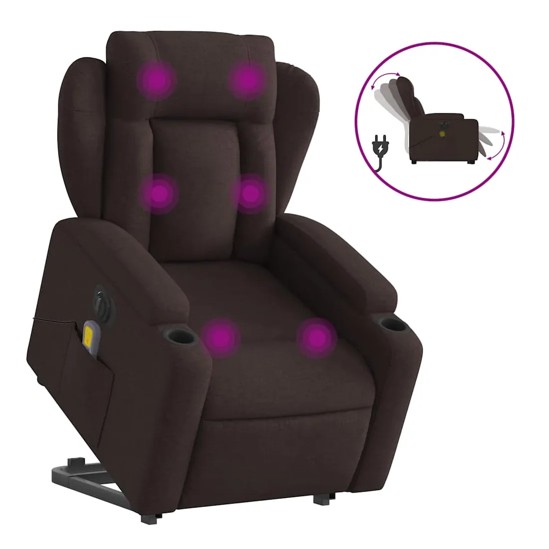 Asseyez-vous et détendez-vous dans ce fauteuil inclinable de massage électrique très confortable ! Fonction de levage électrique : ce fauteuil inclinable pour personnes âgées est équipé d'un moteur électrique pour la fonction de levage. Grâce à la fonction qui pousse toute la chaise vers le haut, vous pouvez facilement vous tenir debout sans stresser votre dos et vos genoux en appuyant simplement sur le bouton.Fonction d'inclinaison électrique : ce fauteuil inclinable est également équipé d'un moteur électrique qui permet de régler automatiquement le repose-pied et le dossier dans n'importe quelle position, selon votre confort, en appuyant simplement sur le bouton situé sur le côté du fauteuil. Cette fonction permet une inclinaison maximale de 135 degrés. En outre, le dossier peut revenir automatiquement à sa position d'origine par une simple pression sur le bouton.Fonction de vibration : les 6 points de massage vous permettent de faire l'expérience d'un massage mieux ciblé. De plus, la télécommande incluse vous permet de choisir différents programmes de massage. La fonction de massage est alimentée par le connecteur USB qui nécessite une source d'alimentation USB certifiée de 5 V (non fournie).Expérience d'assise confortable : le siège, le dossier et les larges accoudoirs bien rembourrés recouverts de tissu procurent une sensation confortable et chaleureuse, vous permettant de vous sentir enveloppé lorsque vous êtes assis. Le tissu présente un aspect simple et épuré et est respirant et durable.Porte-gobelets et poche latérale pratiques : ce fauteuil dispose de deux porte-gobelets pratiques pour vos boissons et d'une poche latérale pour garder vos objets essentiels à portée de main.Cadre solide et stable : le cadre en bois et en métal offre une structure solide et une grande stabilité. Ce fauteuil inclinable est confortable et durable.