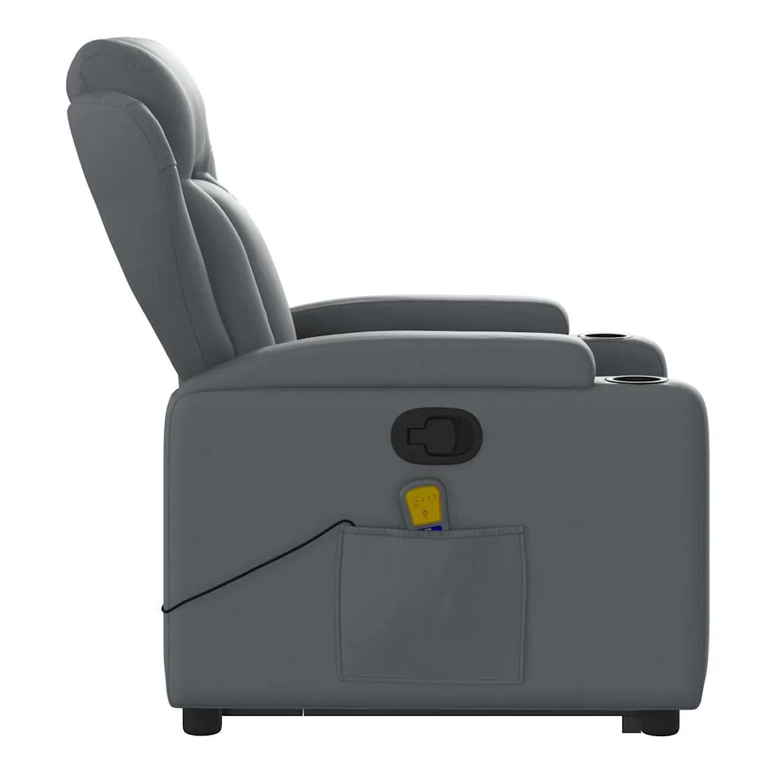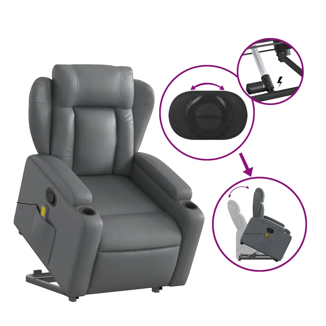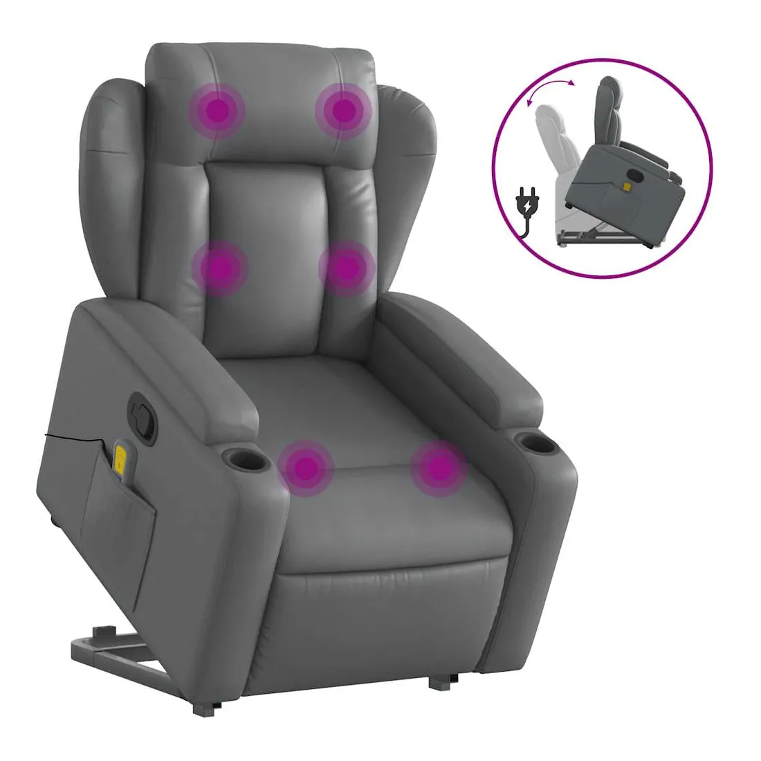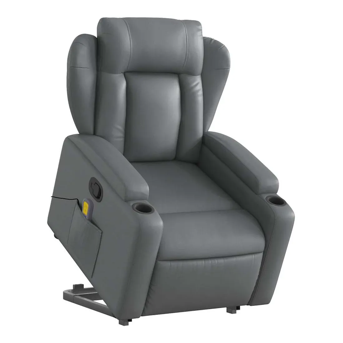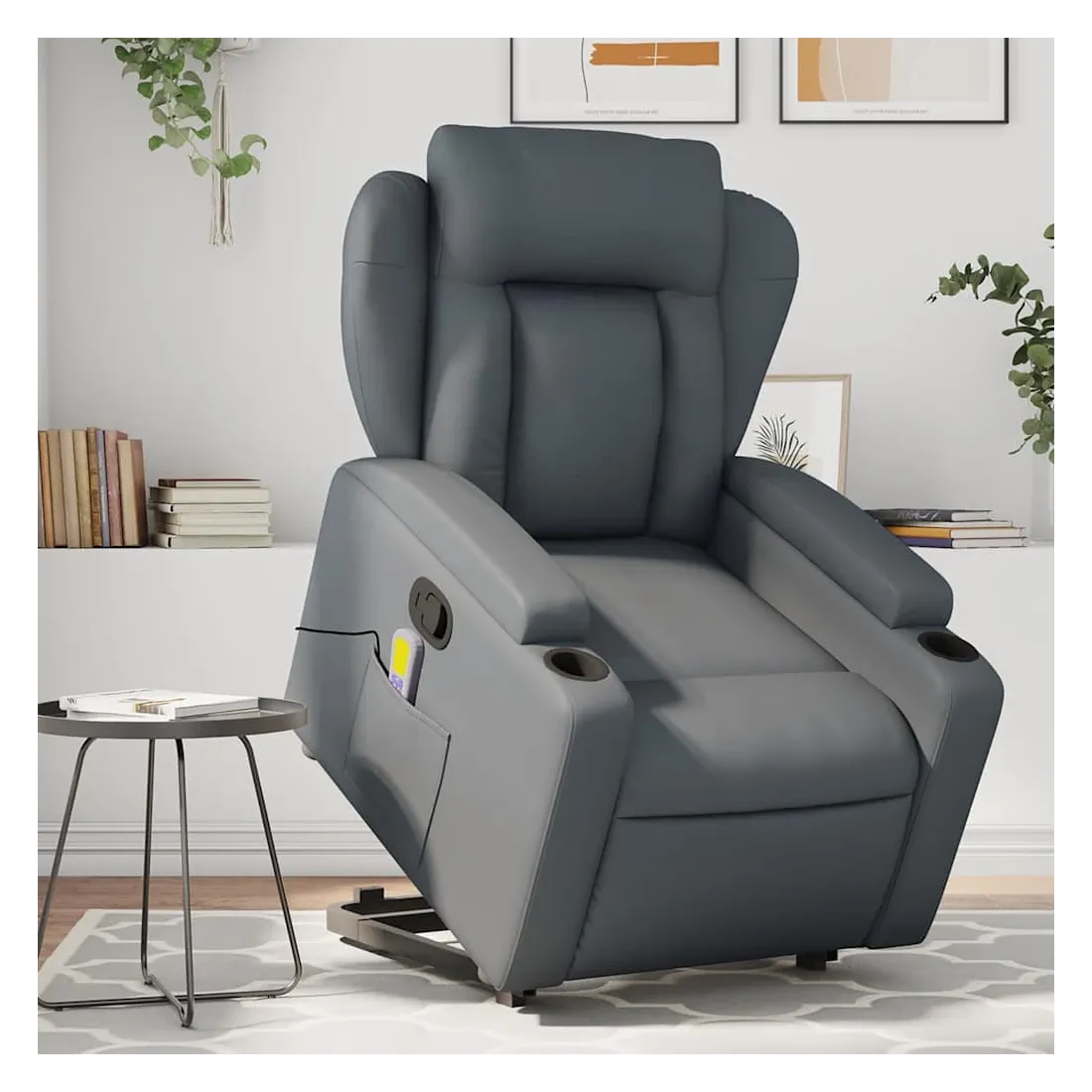 Asseyez-vous et détendez-vous dans ce fauteuil inclinable de massage très confortable ! Fonction de levage électrique : ce fauteuil inclinable pour personnes âgées est équipé d'un moteur électrique pour la fonction de levage. Grâce à la fonction qui pousse toute la chaise vers le haut, vous pouvez facilement vous tenir debout sans stresser votre dos et vos genoux en appuyant simplement sur le bouton.Fonction d'inclinaison manuelle : ce fauteuil inclinable est doté d'une poignée du côté droit. Vous pouvez régler manuellement le repose-pieds et le dossier dans n'importe quelle position selon votre confort en tirant simplement sur la poignée. Cette fonction permet une inclinaison maximale de 135 degrés. De plus, le dossier peut revenir rapidement à sa position d'origine en tirant simplement sur la poignée.Fonction de vibration : les 6 points de massage vous permettent de faire l'expérience d'un massage mieux ciblé. De plus, la télécommande incluse vous permet de choisir différents programmes de massage. La fonction de massage est alimentée par le connecteur USB qui nécessite une source d'alimentation USB certifiée de 5 V (non fournie).Expérience de siège confortable : le siège, le dossier et les larges accoudoirs rembourrés épais recouverts de similicuir procurent une sensation confortable, vous faisant vous sentir enlacé lorsque vous êtes assis. Le similicuir est un matériau très résistant. Il est résistant aux taches, ce qui le rend facile à nettoyer avec un chiffon humide. La surface lisse donne également un aspect luxueux et la beauté du cuir véritable.Porte-gobelets et poche latérale pratiques : ce fauteuil dispose de deux porte-gobelets pratiques pour vos boissons et d'une poche latérale pour garder vos objets essentiels à portée de main.Cadre solide et stable : le cadre en bois et en métal offre une structure solide et une grande stabilité. Ce fauteuil inclinable est confortable et durable.
