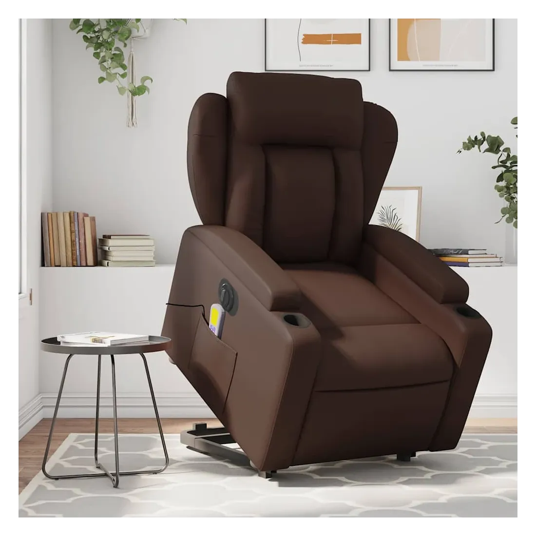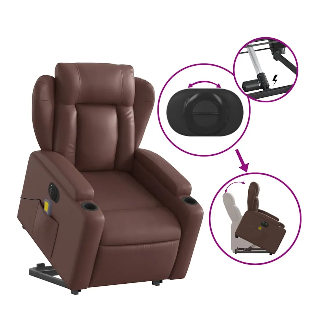 Asseyez-vous et détendez-vous dans ce fauteuil inclinable de massage électrique très confortable ! Fonction de levage électrique : ce fauteuil inclinable pour personnes âgées est équipé d'un moteur électrique pour la fonction de levage. Grâce à la fonction qui pousse toute la chaise vers le haut, vous pouvez facilement vous tenir debout sans stresser votre dos et vos genoux en appuyant simplement sur le bouton.Fonction d'inclinaison électrique : ce fauteuil inclinable est également équipé d'un moteur électrique qui permet de régler automatiquement le repose-pied et le dossier dans n'importe quelle position, selon votre confort, en appuyant simplement sur le bouton situé sur le côté du fauteuil. Cette fonction permet une inclinaison maximale de 135 degrés. En outre, le dossier peut revenir automatiquement à sa position d'origine par une simple pression sur le bouton.Fonction de vibration : les 6 points de massage vous permettent de faire l'expérience d'un massage mieux ciblé. De plus, la télécommande incluse vous permet de choisir différents programmes de massage. La fonction de massage est alimentée par le connecteur USB qui nécessite une source d'alimentation USB certifiée de 5 V (non fournie).Expérience de siège confortable : le siège, le dossier et les larges accoudoirs rembourrés épais recouverts de similicuir procurent une sensation confortable, vous faisant vous sentir enlacé lorsque vous êtes assis. Le similicuir est un matériau très résistant. Il est résistant aux taches, ce qui le rend facile à nettoyer avec un chiffon humide. La surface lisse donne également un aspect luxueux et la beauté du cuir véritable.Porte-gobelets et poche latérale pratiques : ce fauteuil dispose de deux porte-gobelets pratiques pour vos boissons et d'une poche latérale pour garder vos objets essentiels à portée de main.Cadre solide et stable : le cadre en bois et en métal offre une structure solide et une grande stabilité. Ce fauteuil inclinable est confortable et durable.