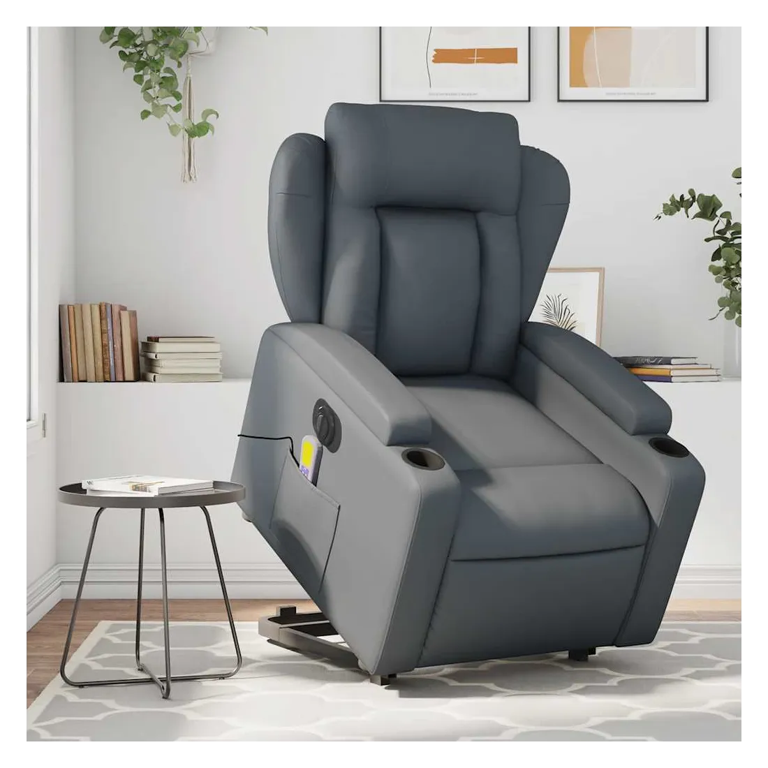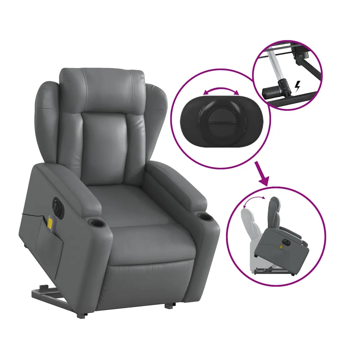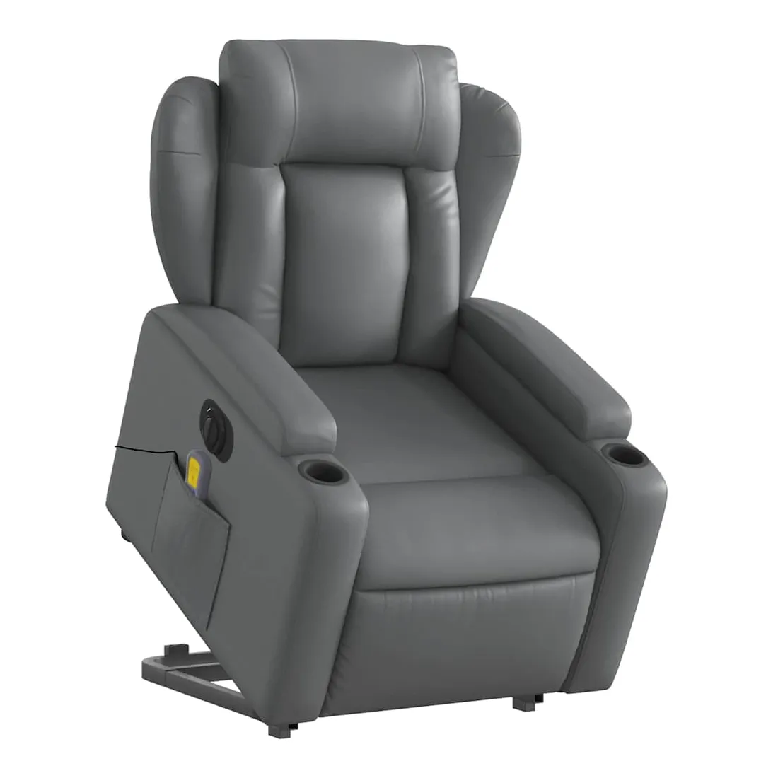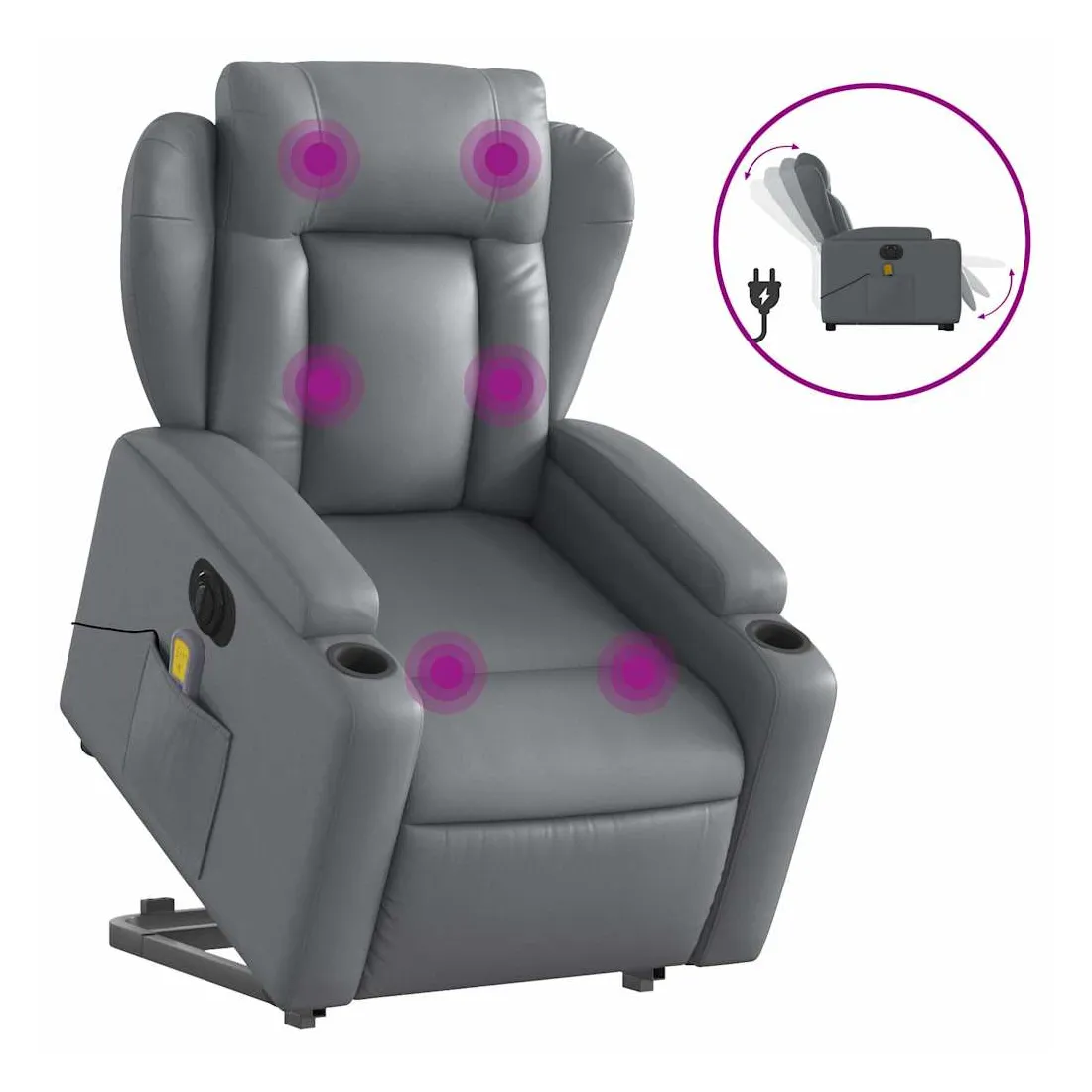 Asseyez-vous et détendez-vous dans ce fauteuil inclinable de massage électrique très confortable ! Fonction de levage électrique : ce fauteuil inclinable pour personnes âgées est équipé d'un moteur électrique pour la fonction de levage. Grâce à la fonction qui pousse toute la chaise vers le haut, vous pouvez facilement vous tenir debout sans stresser votre dos et vos genoux en appuyant simplement sur le bouton.Fonction d'inclinaison électrique : ce fauteuil inclinable est également équipé d'un moteur électrique qui permet de régler automatiquement le repose-pied et le dossier dans n'importe quelle position, selon votre confort, en appuyant simplement sur le bouton situé sur le côté du fauteuil. Cette fonction permet une inclinaison maximale de 135 degrés. En outre, le dossier peut revenir automatiquement à sa position d'origine par une simple pression sur le bouton.Fonction de vibration : les 6 points de massage vous permettent de faire l'expérience d'un massage mieux ciblé. De plus, la télécommande incluse vous permet de choisir différents programmes de massage. La fonction de massage est alimentée par le connecteur USB qui nécessite une source d'alimentation USB certifiée de 5 V (non fournie).Expérience de siège confortable : le siège, le dossier et les larges accoudoirs rembourrés épais recouverts de similicuir procurent une sensation confortable, vous faisant vous sentir enlacé lorsque vous êtes assis. Le similicuir est un matériau très résistant. Il est résistant aux taches, ce qui le rend facile à nettoyer avec un chiffon humide. La surface lisse donne également un aspect luxueux et la beauté du cuir véritable.Porte-gobelets et poche latérale pratiques : ce fauteuil dispose de deux porte-gobelets pratiques pour vos boissons et d'une poche latérale pour garder vos objets essentiels à portée de main.Cadre solide et stable : le cadre en bois et en métal offre une structure solide et une grande stabilité. Ce fauteuil inclinable est confortable et durable.