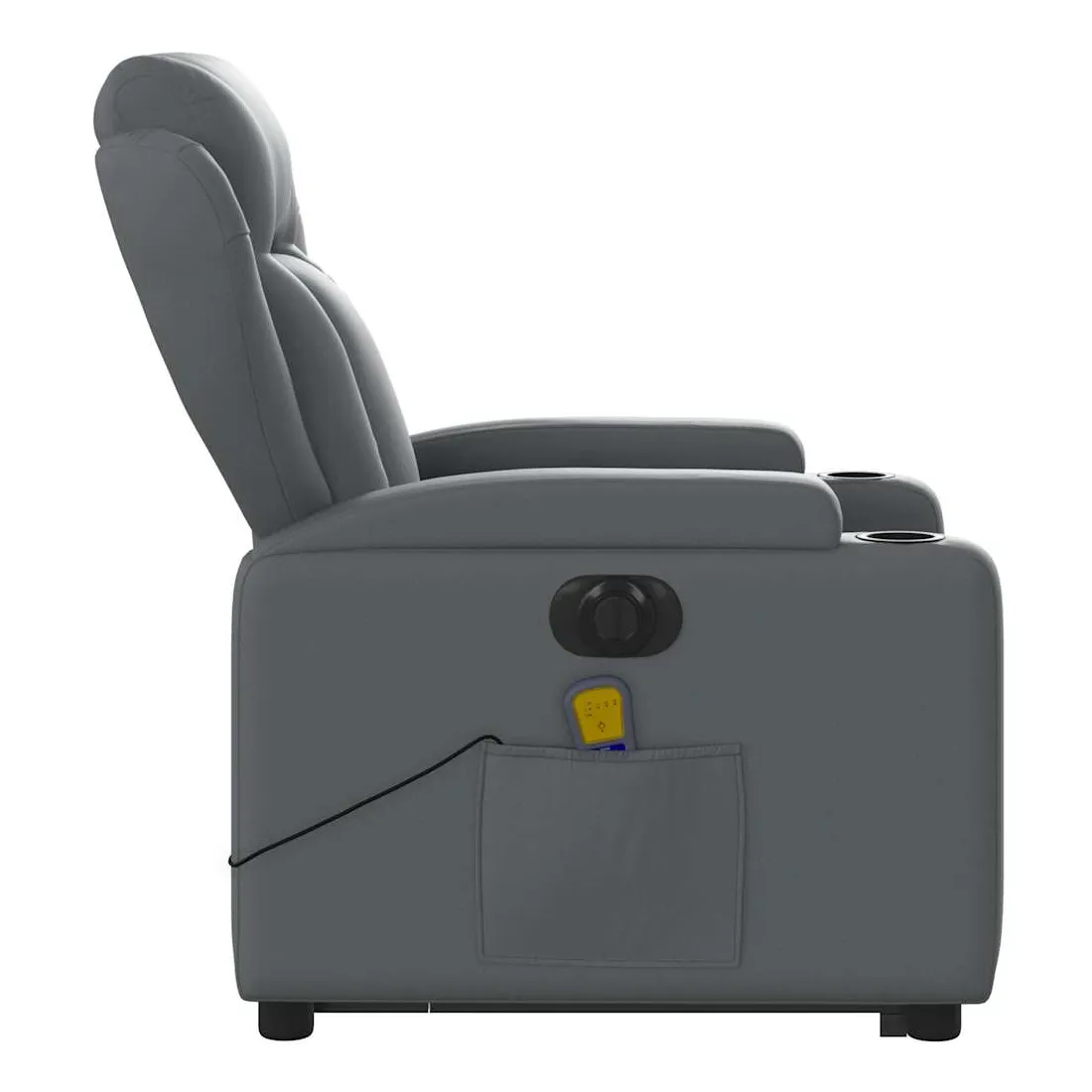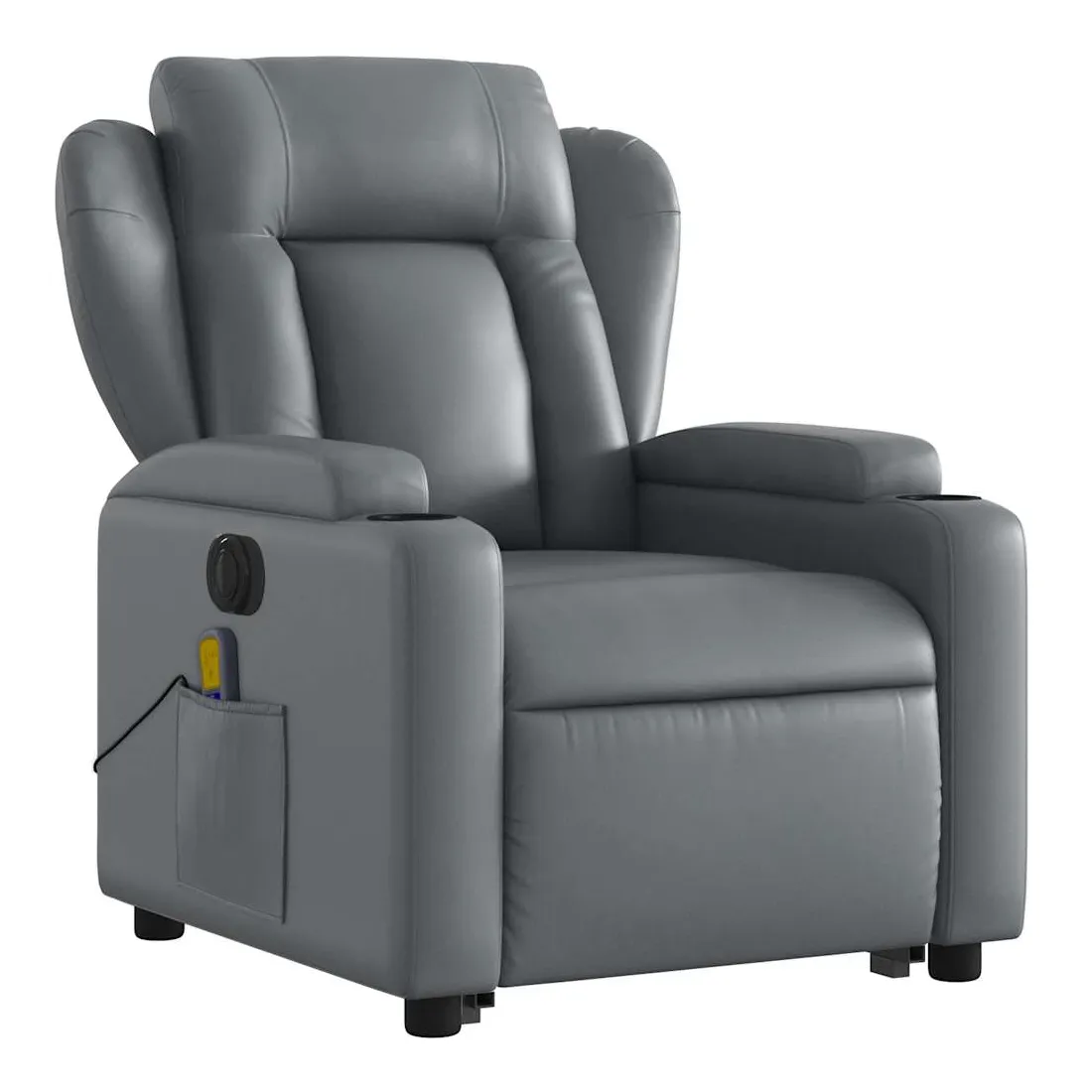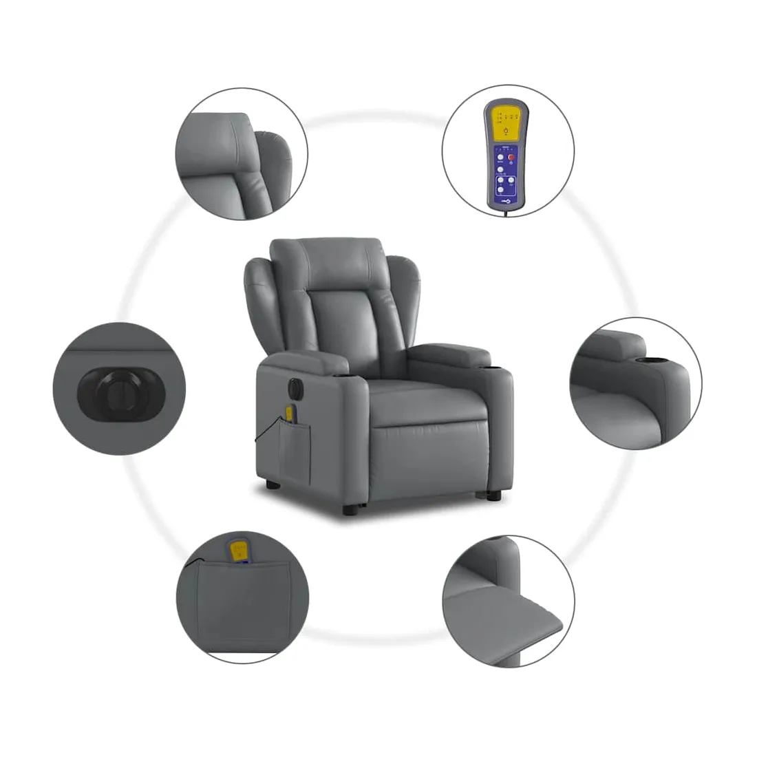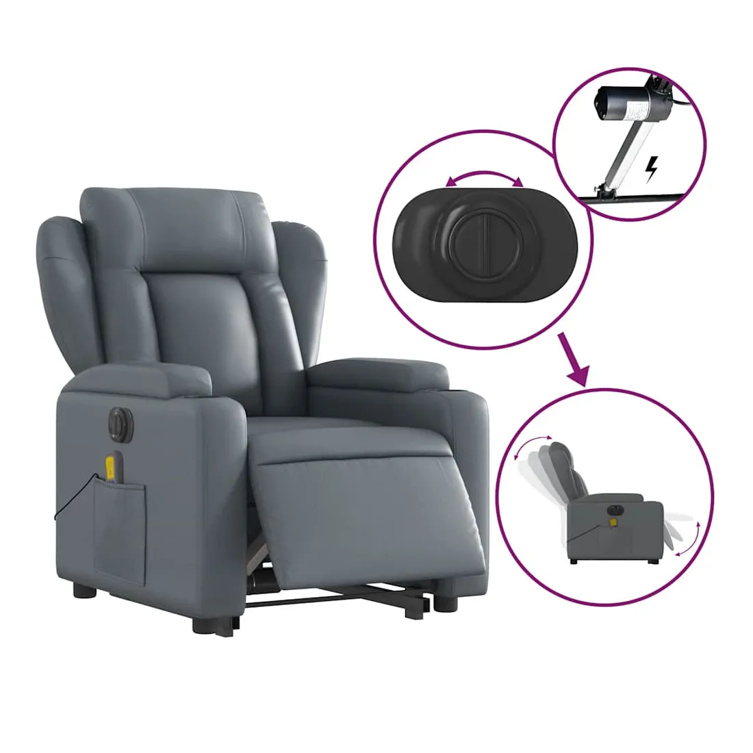 Asseyez-vous et détendez-vous dans ce fauteuil inclinable de massage électrique très confortable ! Fonction de levage électrique : ce fauteuil inclinable pour personnes âgées est équipé d'un moteur électrique pour la fonction de levage. Grâce à la fonction qui pousse toute la chaise vers le haut, vous pouvez facilement vous tenir debout sans stresser votre dos et vos genoux en appuyant simplement sur le bouton.Fonction d'inclinaison électrique : ce fauteuil inclinable est également équipé d'un moteur électrique qui permet de régler automatiquement le repose-pied et le dossier dans n'importe quelle position, selon votre confort, en appuyant simplement sur le bouton situé sur le côté du fauteuil. Cette fonction permet une inclinaison maximale de 135 degrés. En outre, le dossier peut revenir automatiquement à sa position d'origine par une simple pression sur le bouton.Fonction de vibration : les 6 points de massage vous permettent de faire l'expérience d'un massage mieux ciblé. De plus, la télécommande incluse vous permet de choisir différents programmes de massage. La fonction de massage est alimentée par le connecteur USB qui nécessite une source d'alimentation USB certifiée de 5 V (non fournie).Expérience de siège confortable : le siège, le dossier et les larges accoudoirs rembourrés épais recouverts de similicuir procurent une sensation confortable, vous faisant vous sentir enlacé lorsque vous êtes assis. Le similicuir est un matériau très résistant. Il est résistant aux taches, ce qui le rend facile à nettoyer avec un chiffon humide. La surface lisse donne également un aspect luxueux et la beauté du cuir véritable.Porte-gobelets et poche latérale pratiques : ce fauteuil dispose de deux porte-gobelets pratiques pour vos boissons et d'une poche latérale pour garder vos objets essentiels à portée de main.Cadre solide et stable : le cadre en bois et en métal offre une structure solide et une grande stabilité. Ce fauteuil inclinable est confortable et durable.