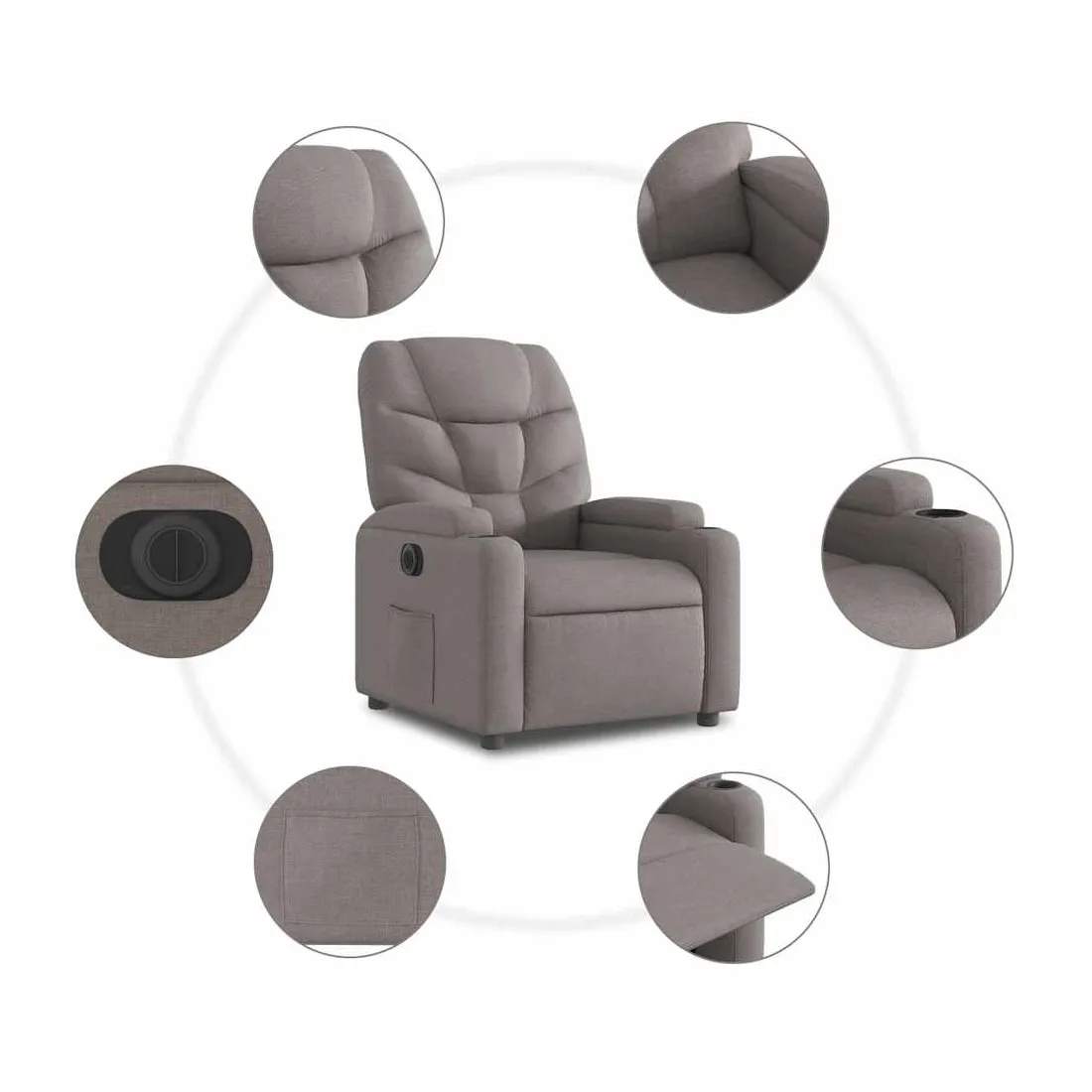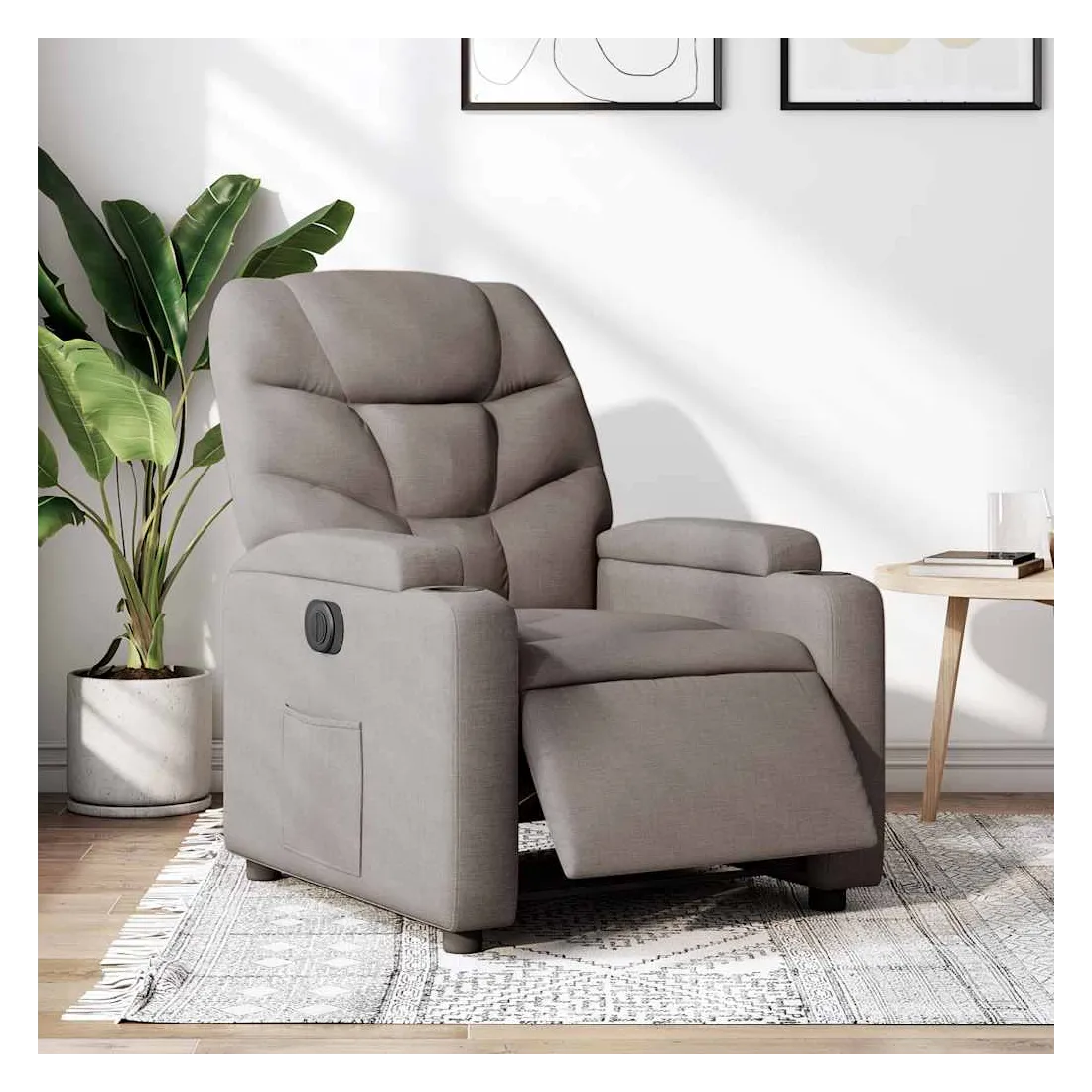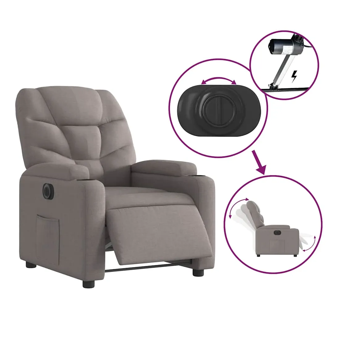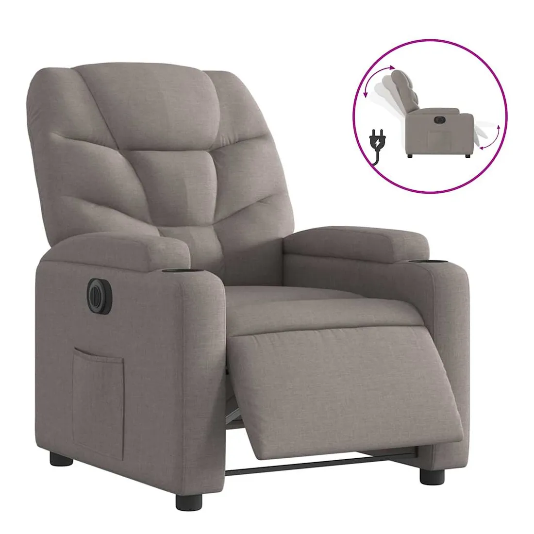 Asseyez-vous et détendez-vous dans ce fauteuil inclinable électrique très confortable ! Fonction d'inclinaison électrique : ce fauteuil inclinable est équipé d'un moteur électrique qui permet de régler automatiquement le repose-pied et le dossier dans n'importe quelle position, selon votre confort, en appuyant simplement sur le bouton situé sur le côté du fauteuil. Cette fonction permet une inclinaison maximale de 135 degrés. En outre, le dossier peut revenir automatiquement à sa position d'origine par une simple pression sur le bouton.Expérience d'assise confortable : le siège, le dossier et les larges accoudoirs bien rembourrés recouverts de tissu procurent une sensation confortable et chaleureuse, vous permettant de vous sentir enveloppé lorsque vous êtes assis. Le tissu présente un aspect simple et épuré et est respirant et durable.Porte-gobelets et poche latérale pratiques : ce fauteuil dispose de deux porte-gobelets pratiques pour vos boissons et d'une poche latérale pour garder vos objets essentiels à portée de main.Cadre solide et stable : le cadre en bois et en métal offre une structure solide et une grande stabilité. Ce fauteuil inclinable est confortable et durable.