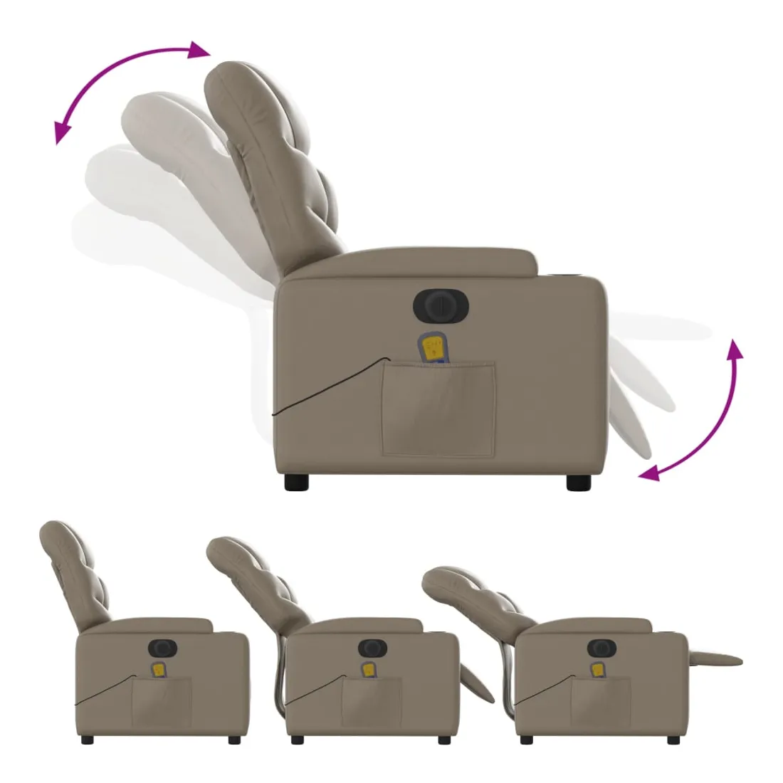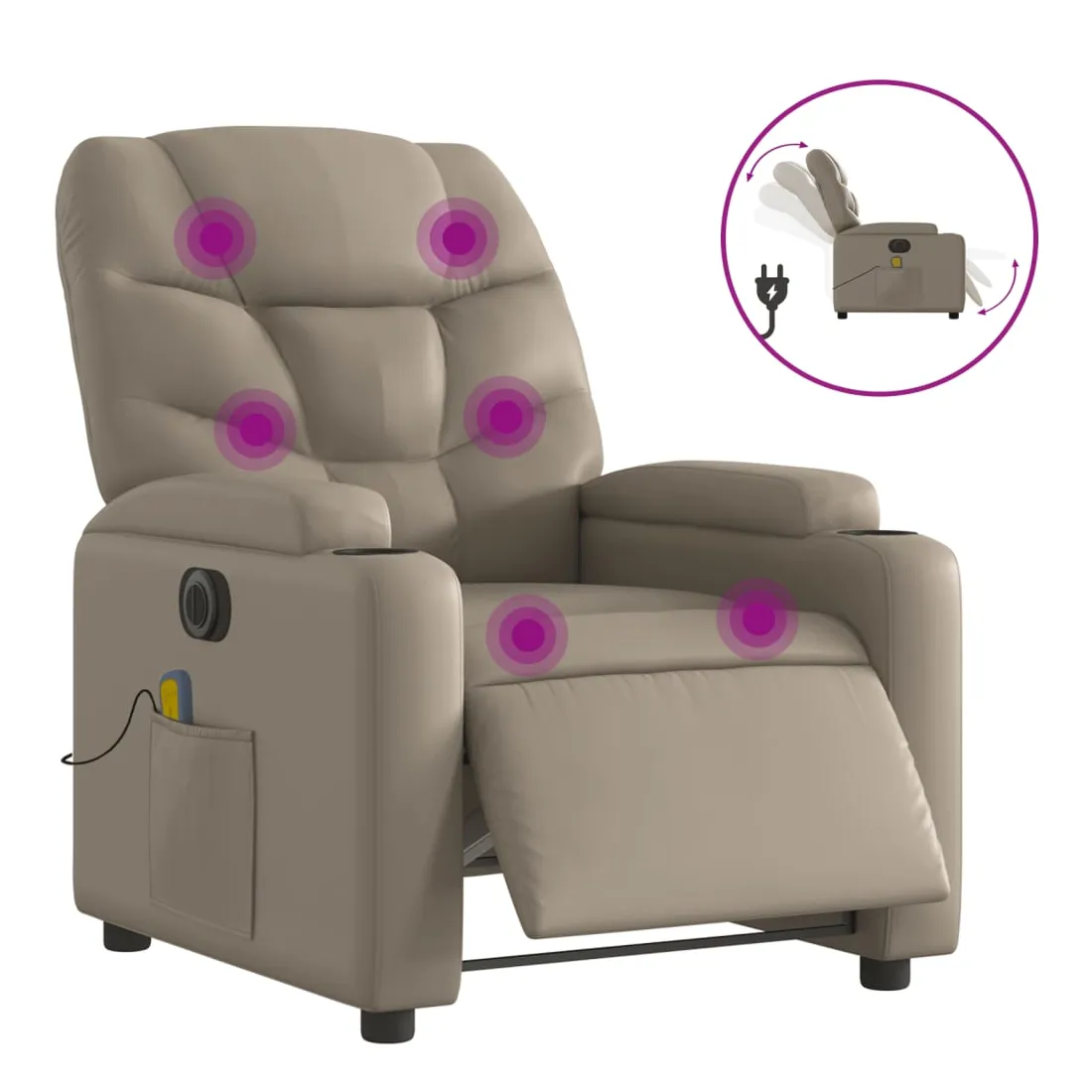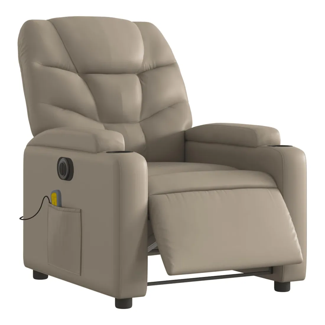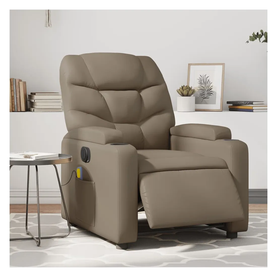 Asseyez-vous et détendez-vous dans ce fauteuil inclinable de massage électrique très confortable ! Fonction d'inclinaison électrique : ce fauteuil inclinable est équipé d'un moteur électrique qui permet de régler automatiquement le repose-pied et le dossier dans n'importe quelle position, selon votre confort, en appuyant simplement sur le bouton situé sur le côté du fauteuil. Cette fonction permet une inclinaison maximale de 135 degrés. En outre, le dossier peut revenir automatiquement à sa position d'origine par une simple pression sur le bouton.Fonction de vibration : les 6 points de massage vous permettent de faire l'expérience d'un massage mieux ciblé. De plus, la télécommande incluse vous permet de choisir différents programmes de massage. La fonction de massage est alimentée par le connecteur USB qui nécessite une source d'alimentation USB certifiée de 5 V (non fournie).Expérience de siège confortable : le siège, le dossier et les larges accoudoirs rembourrés épais recouverts de similicuir procurent une sensation confortable, vous faisant vous sentir enlacé lorsque vous êtes assis. Le similicuir est un matériau très résistant. Il est résistant aux taches, ce qui le rend facile à nettoyer avec un chiffon humide. La surface lisse donne également un aspect luxueux et la beauté du cuir véritable.Porte-gobelets et poche latérale pratiques : ce fauteuil dispose de deux porte-gobelets pratiques pour vos boissons et d'une poche latérale pour garder vos objets essentiels à portée de main.Cadre solide et stable : le cadre en bois et en métal offre une structure solide et une grande stabilité. Ce fauteuil inclinable est confortable et durable.