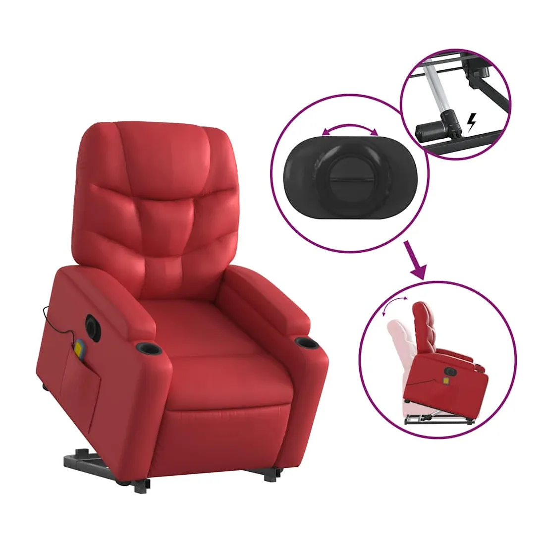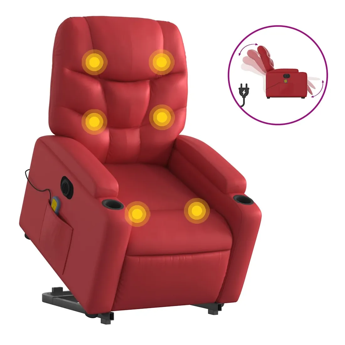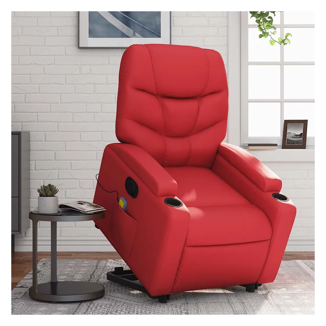 Asseyez-vous et détendez-vous dans ce fauteuil inclinable de massage électrique très confortable ! Fonction de levage électrique : ce fauteuil inclinable pour personnes âgées est équipé d'un moteur électrique pour la fonction de levage. Grâce à la fonction qui pousse toute la chaise vers le haut, vous pouvez facilement vous tenir debout sans stresser votre dos et vos genoux en appuyant simplement sur le bouton.Fonction d'inclinaison électrique : ce fauteuil inclinable est également équipé d'un moteur électrique qui permet de régler automatiquement le repose-pied et le dossier dans n'importe quelle position, selon votre confort, en appuyant simplement sur le bouton situé sur le côté du fauteuil. Cette fonction permet une inclinaison maximale de 135 degrés. En outre, le dossier peut revenir automatiquement à sa position d'origine par une simple pression sur le bouton.Fonction de vibration : les 6 points de massage vous permettent de faire l'expérience d'un massage mieux ciblé. De plus, la télécommande incluse vous permet de choisir différents programmes de massage. La fonction de massage est alimentée par le connecteur USB qui nécessite une source d'alimentation USB certifiée de 5 V (non fournie).Expérience de siège confortable : le siège, le dossier et les larges accoudoirs rembourrés épais recouverts de similicuir procurent une sensation confortable, vous faisant vous sentir enlacé lorsque vous êtes assis. Le similicuir est un matériau très résistant. Il est résistant aux taches, ce qui le rend facile à nettoyer avec un chiffon humide. La surface lisse donne également un aspect luxueux et la beauté du cuir véritable.Porte-gobelets et poche latérale pratiques : ce fauteuil dispose de deux porte-gobelets pratiques pour vos boissons et d'une poche latérale pour garder vos objets essentiels à portée de main.Cadre solide et stable : le cadre en bois et en métal offre une structure solide et une grande stabilité. Ce fauteuil inclinable est confortable et durable.