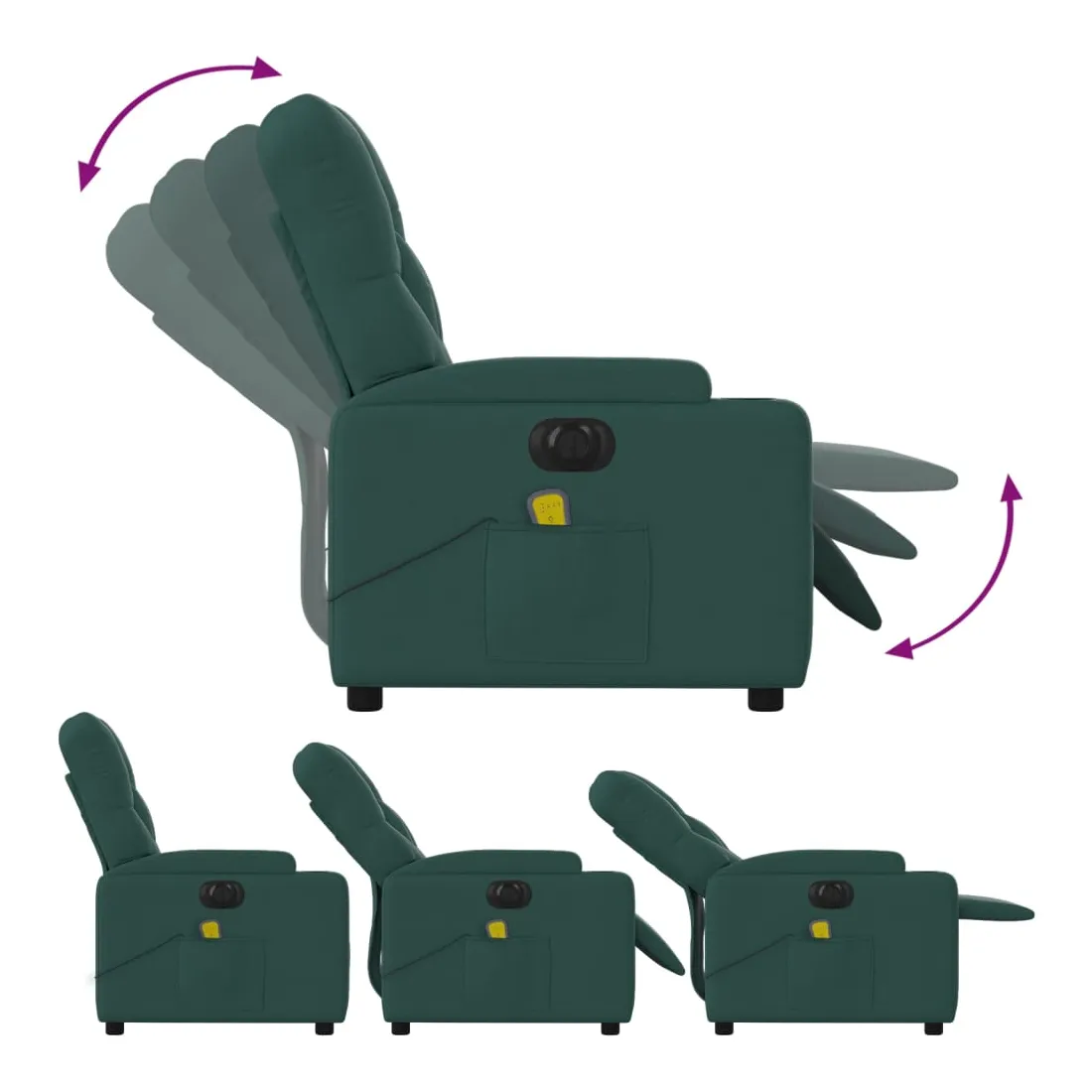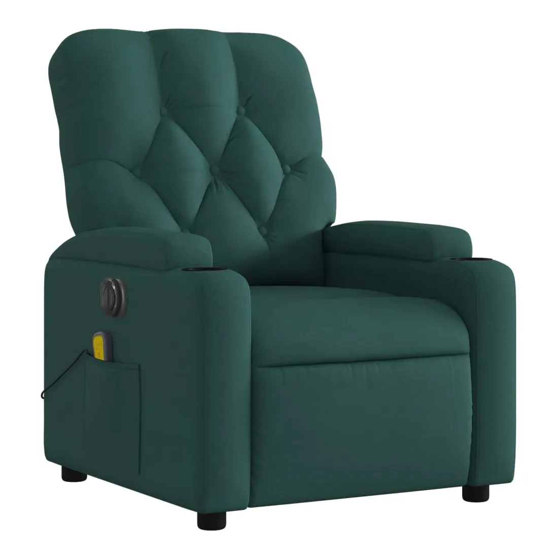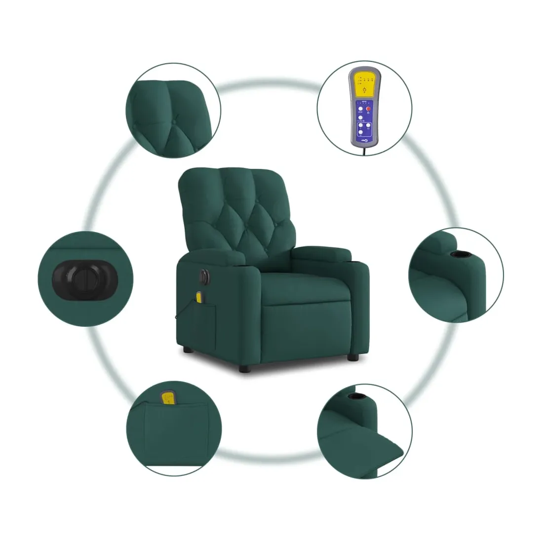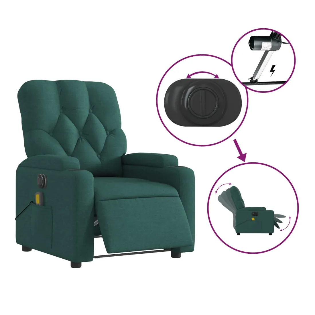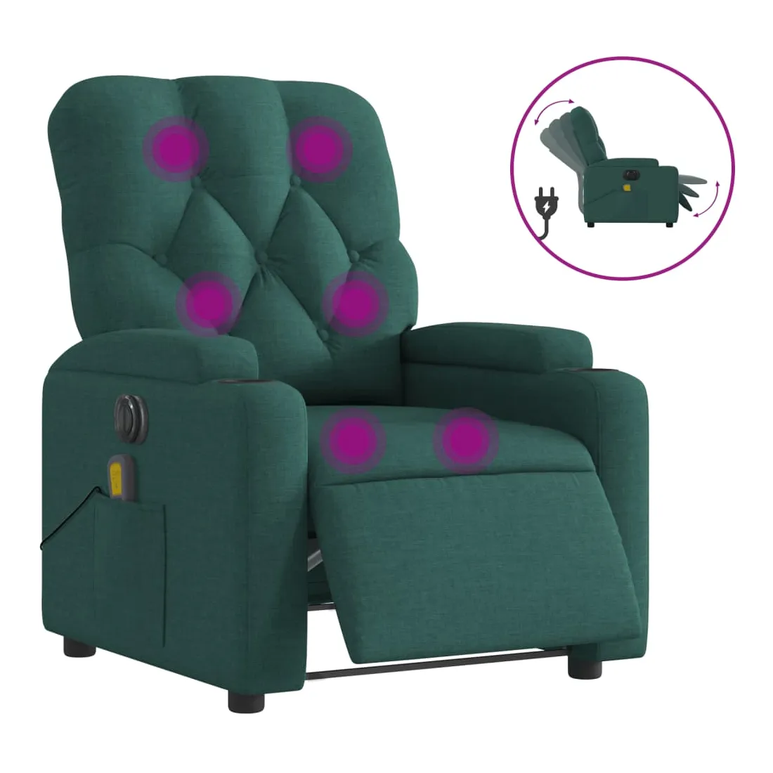Asseyez-vous et détendez-vous dans ce fauteuil inclinable de massage électrique très confortable ! Fonction d'inclinaison électrique : ce fauteuil inclinable est équipé d'un moteur électrique qui permet de régler automatiquement le repose-pied et le dossier dans n'importe quelle position, selon votre confort, en appuyant simplement sur le bouton situé sur le côté du fauteuil. Cette fonction permet une inclinaison maximale de 135 degrés. En outre, le dossier peut revenir automatiquement à sa position d'origine par une simple pression sur le bouton.Fonction de vibration : les 6 points de massage vous permettent de faire l'expérience d'un massage mieux ciblé. De plus, la télécommande incluse vous permet de choisir différents programmes de massage. La fonction de massage est alimentée par le connecteur USB qui nécessite une source d'alimentation USB certifiée de 5 V (non fournie).Expérience d'assise confortable : le siège, le dossier et les larges accoudoirs bien rembourrés recouverts de tissu procurent une sensation confortable et chaleureuse, vous permettant de vous sentir enveloppé lorsque vous êtes assis. Le tissu présente un aspect simple et épuré et est respirant et durable.Porte-gobelets et poche latérale pratiques : ce fauteuil dispose de deux porte-gobelets pratiques pour vos boissons et d'une poche latérale pour garder vos objets essentiels à portée de main.Cadre solide et stable : le cadre en bois et en métal offre une structure solide et une grande stabilité. Ce fauteuil inclinable est confortable et durable.