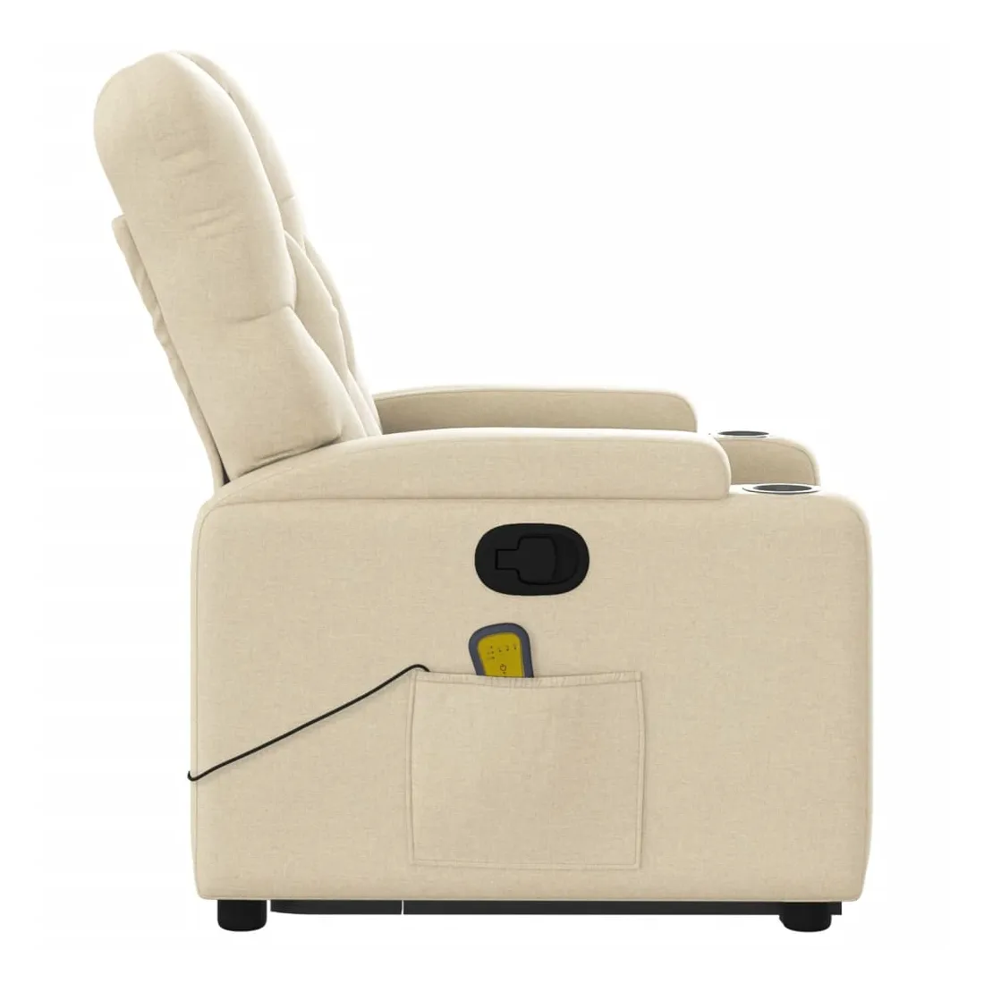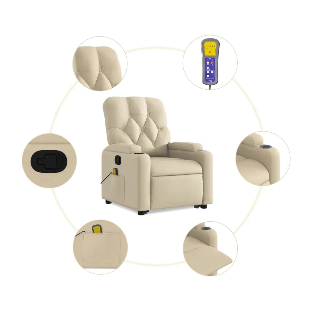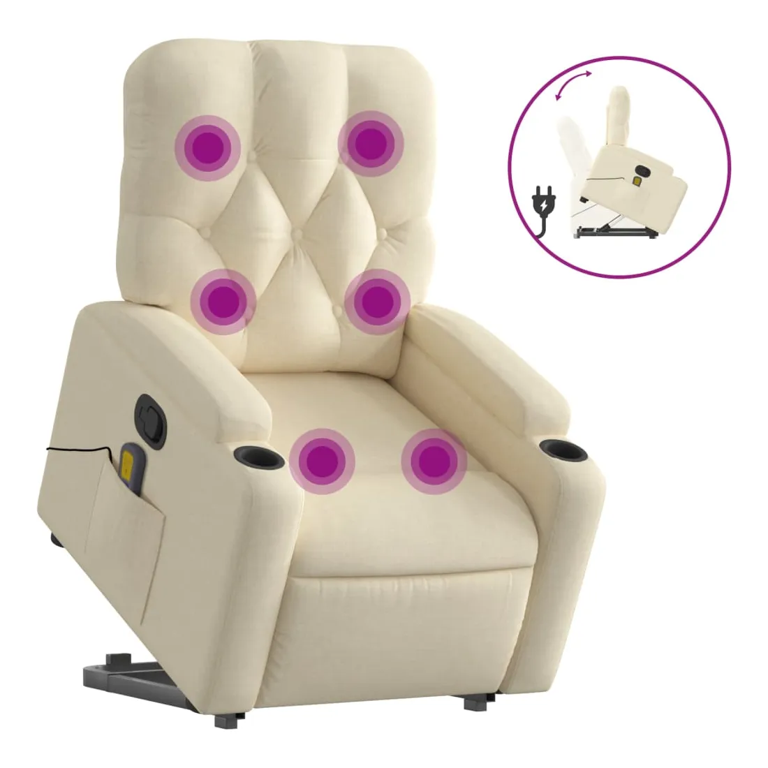 Asseyez-vous et détendez-vous dans ce fauteuil inclinable de massage très confortable ! Fonction de levage électrique : ce fauteuil inclinable pour personnes âgées est équipé d'un moteur électrique pour la fonction de levage. Grâce à la fonction qui pousse toute la chaise vers le haut, vous pouvez facilement vous tenir debout sans stresser votre dos et vos genoux en appuyant simplement sur le bouton.Fonction d'inclinaison manuelle : ce fauteuil inclinable est doté d'une poignée du côté droit. Vous pouvez régler manuellement le repose-pieds et le dossier dans n'importe quelle position selon votre confort en tirant simplement sur la poignée. Cette fonction permet une inclinaison maximale de 135 degrés. De plus, le dossier peut revenir rapidement à sa position d'origine en tirant simplement sur la poignée.Fonction de vibration : les 6 points de massage vous permettent de faire l'expérience d'un massage mieux ciblé. De plus, la télécommande incluse vous permet de choisir différents programmes de massage. La fonction de massage est alimentée par le connecteur USB qui nécessite une source d'alimentation USB certifiée de 5 V (non fournie).Expérience d'assise confortable : le siège, le dossier et les larges accoudoirs bien rembourrés recouverts de tissu procurent une sensation confortable et chaleureuse, vous permettant de vous sentir enveloppé lorsque vous êtes assis. Le tissu présente un aspect simple et épuré et est respirant et durable.Porte-gobelets et poche latérale pratiques : ce fauteuil dispose de deux porte-gobelets pratiques pour vos boissons et d'une poche latérale pour garder vos objets essentiels à portée de main.Cadre solide et stable : le cadre en bois et en métal offre une structure solide et une grande stabilité. Ce fauteuil inclinable est confortable et durable.