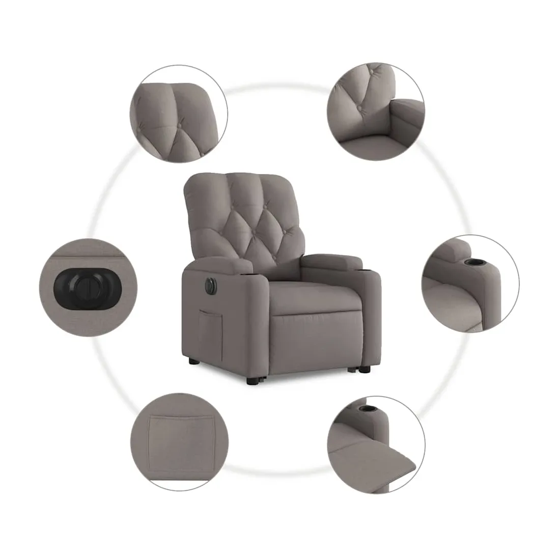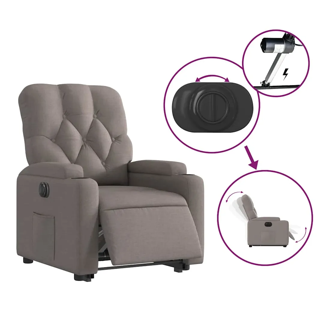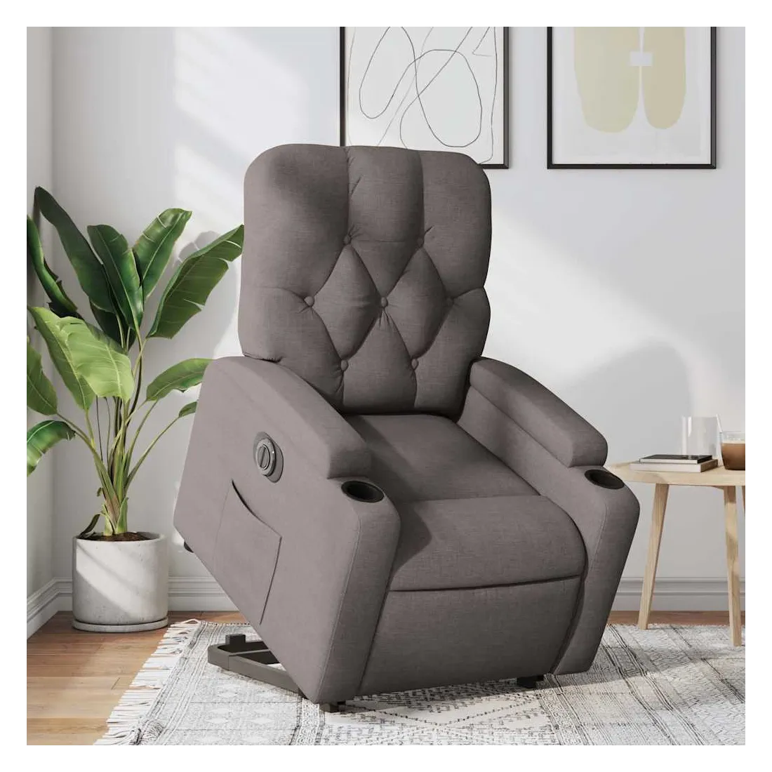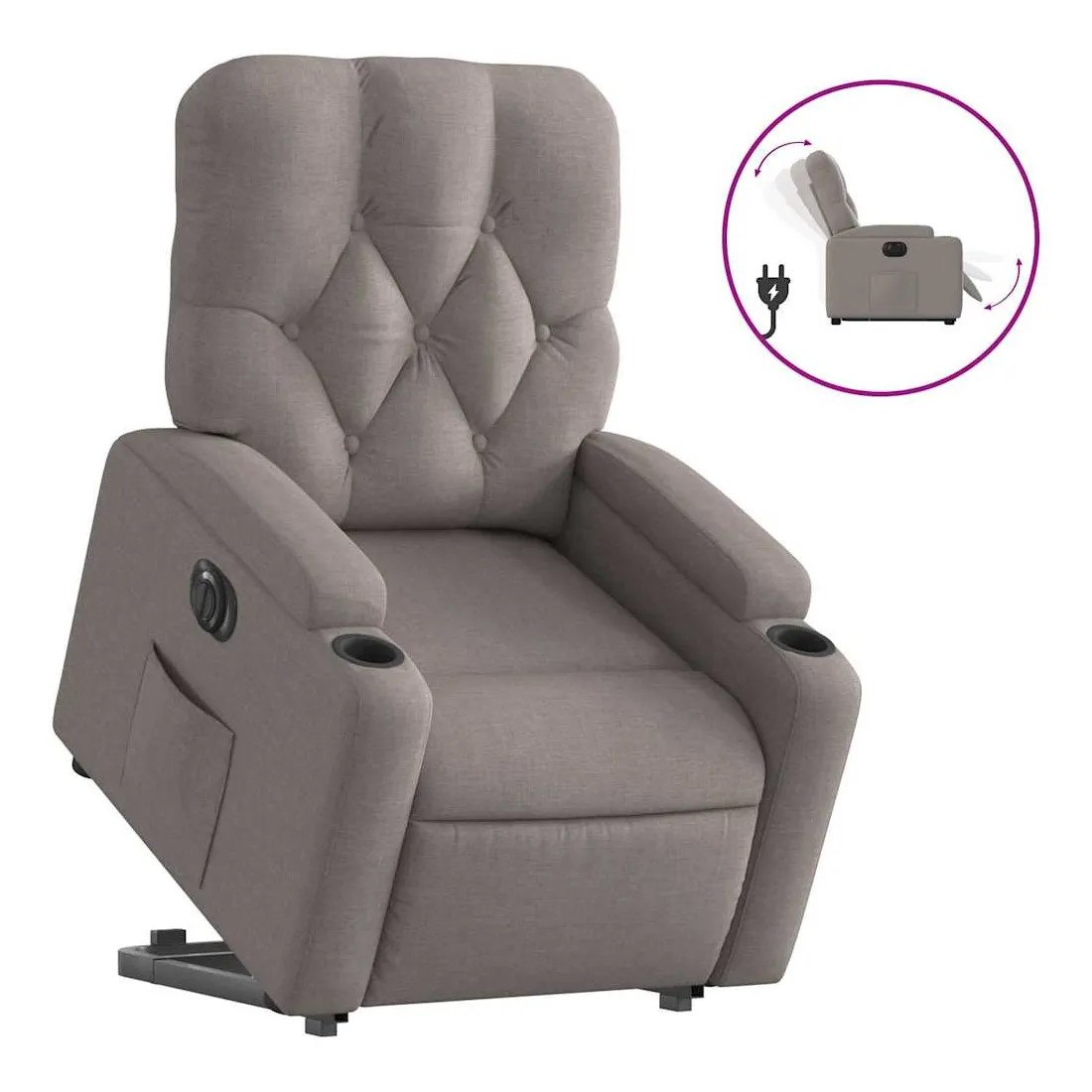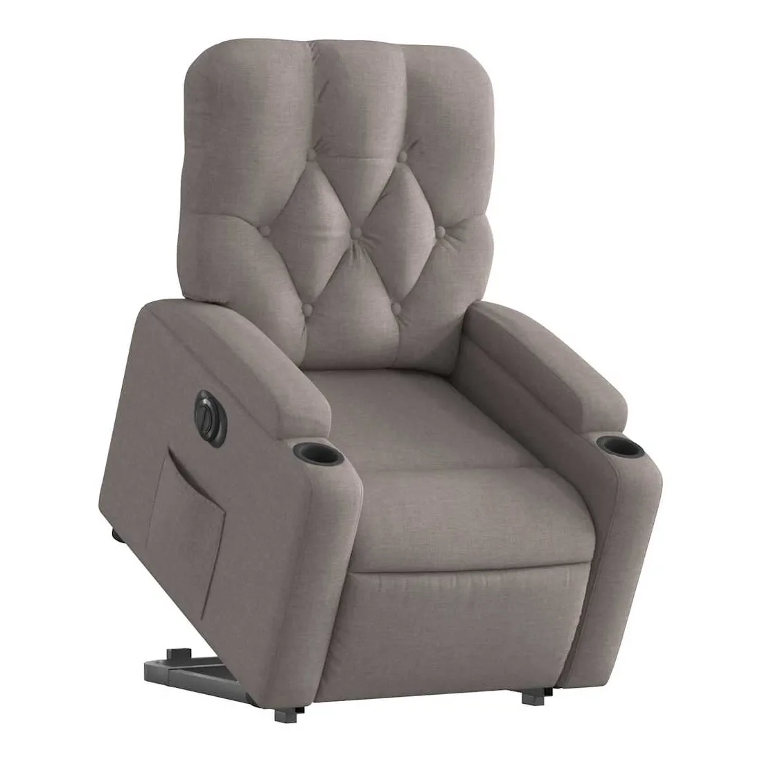 Asseyez-vous et détendez-vous dans ce fauteuil inclinable électrique très confortable ! Fonction de levage électrique : ce fauteuil inclinable pour personnes âgées est équipé d'un moteur électrique pour la fonction de levage. Grâce à la fonction qui pousse toute la chaise vers le haut, vous pouvez facilement vous tenir debout sans stresser votre dos et vos genoux en appuyant simplement sur le bouton.Fonction d'inclinaison électrique : ce fauteuil inclinable est également équipé d'un moteur électrique qui permet de régler automatiquement le repose-pied et le dossier dans n'importe quelle position, selon votre confort, en appuyant simplement sur le bouton situé sur le côté du fauteuil. Cette fonction permet une inclinaison maximale de 135 degrés. En outre, le dossier peut revenir automatiquement à sa position d'origine par une simple pression sur le bouton.Expérience d'assise confortable : le siège, le dossier et les larges accoudoirs bien rembourrés recouverts de tissu procurent une sensation confortable et chaleureuse, vous permettant de vous sentir enveloppé lorsque vous êtes assis. Le tissu présente un aspect simple et épuré et est respirant et durable.Porte-gobelets et poche latérale pratiques : ce fauteuil dispose de deux porte-gobelets pratiques pour vos boissons et d'une poche latérale pour garder vos objets essentiels à portée de main.Cadre solide et stable : le cadre en bois et en métal offre une structure solide et une grande stabilité. Ce fauteuil inclinable est confortable et durable.