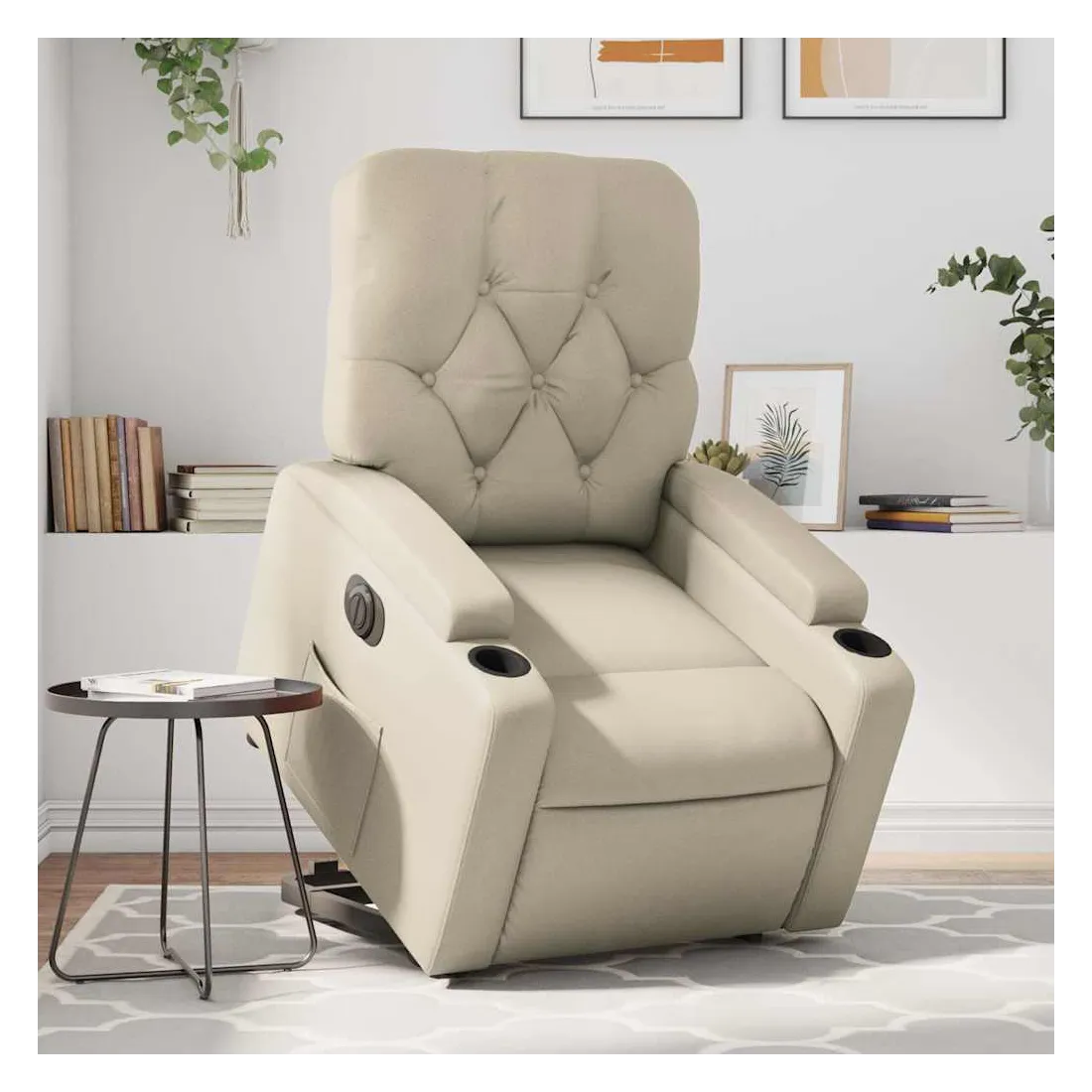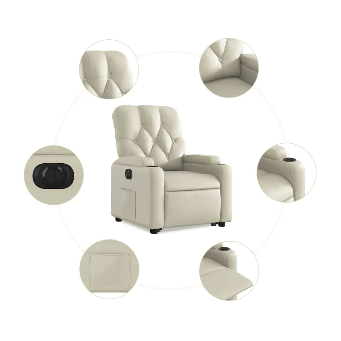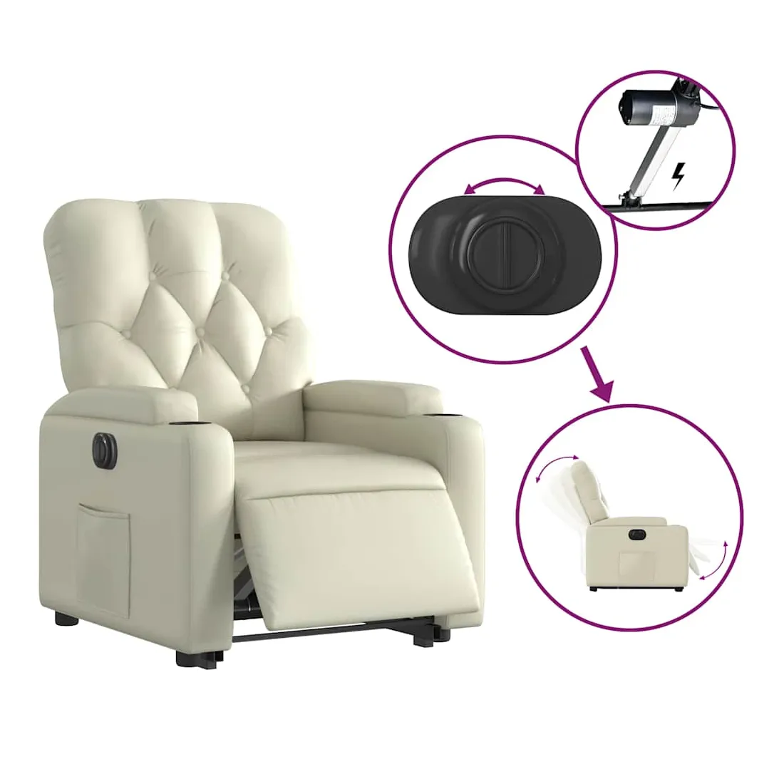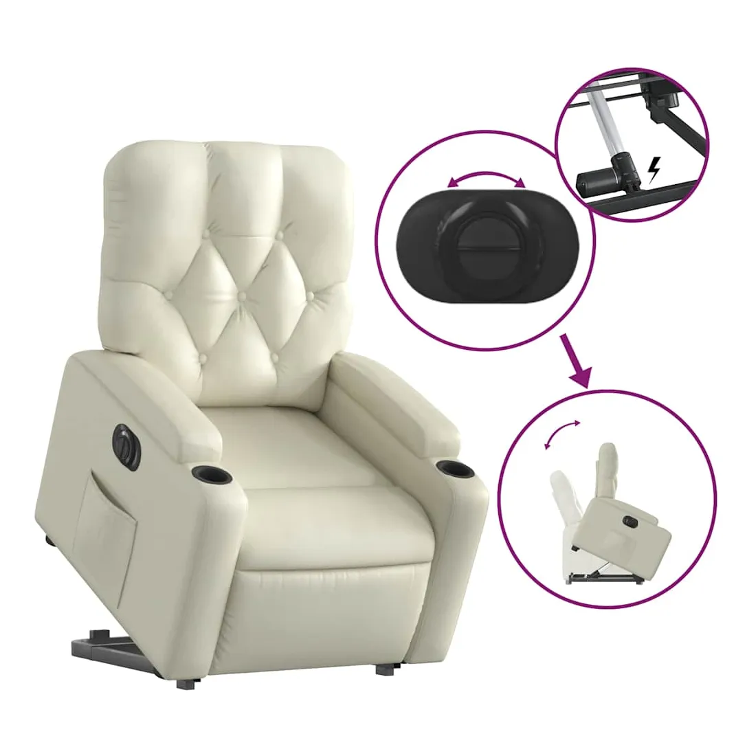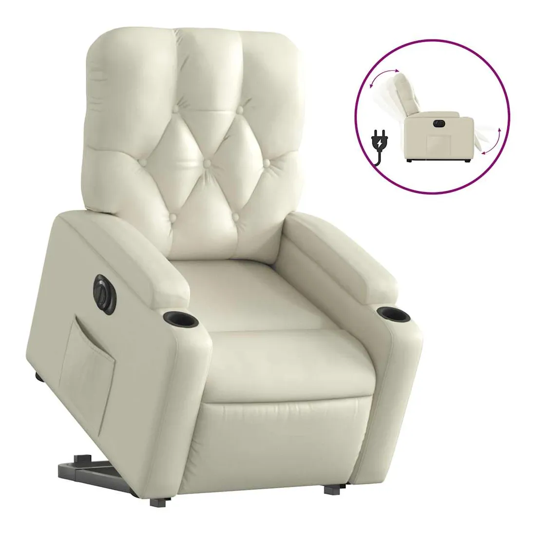 Asseyez-vous et détendez-vous dans ce fauteuil inclinable électrique très confortable ! Fonction de levage électrique : ce fauteuil inclinable pour personnes âgées est équipé d'un moteur électrique pour la fonction de levage. Grâce à la fonction qui pousse toute la chaise vers le haut, vous pouvez facilement vous tenir debout sans stresser votre dos et vos genoux en appuyant simplement sur le bouton.Fonction d'inclinaison électrique : ce fauteuil inclinable est également équipé d'un moteur électrique qui permet de régler automatiquement le repose-pied et le dossier dans n'importe quelle position, selon votre confort, en appuyant simplement sur le bouton situé sur le côté du fauteuil. Cette fonction permet une inclinaison maximale de 135 degrés. En outre, le dossier peut revenir automatiquement à sa position d'origine par une simple pression sur le bouton.Expérience de siège confortable : le siège, le dossier et les larges accoudoirs rembourrés épais recouverts de similicuir procurent une sensation confortable, vous faisant vous sentir enlacé lorsque vous êtes assis. Le similicuir est un matériau très résistant. Il est résistant aux taches, ce qui le rend facile à nettoyer avec un chiffon humide. La surface lisse donne également un aspect luxueux et la beauté du cuir véritable.Poche latérale pratique : ce fauteuil est doté d'une poche latérale pour vous permettre de garder vos objets essentiels à portée de main.Cadre solide et stable : le cadre en bois et en métal offre une structure solide et une grande stabilité. Ce fauteuil inclinable est confortable et durable.