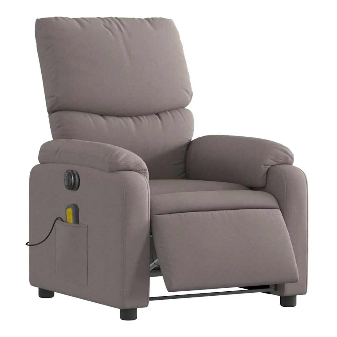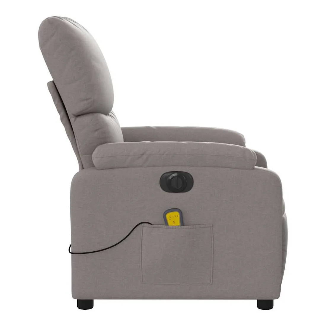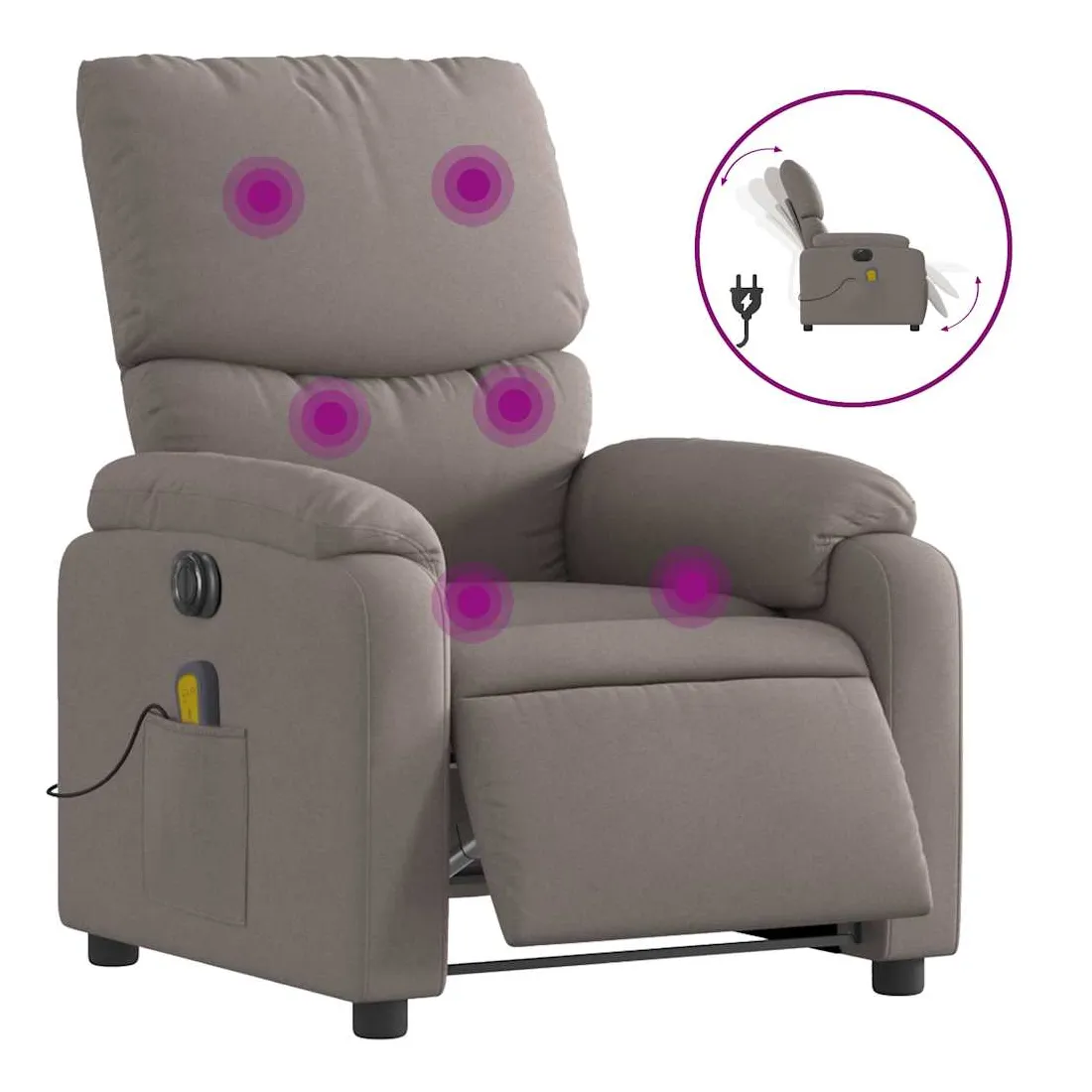 Asseyez-vous et détendez-vous dans ce fauteuil inclinable de massage électrique très confortable ! Fonction d'inclinaison électrique : ce fauteuil inclinable est équipé d'un moteur électrique qui permet de régler automatiquement le repose-pied et le dossier dans n'importe quelle position, selon votre confort, en appuyant simplement sur le bouton situé sur le côté du fauteuil. Cette fonction permet une inclinaison maximale de 135 degrés. En outre, le dossier peut revenir automatiquement à sa position d'origine par une simple pression sur le bouton.Fonction de vibration : les 6 points de massage vous permettent de faire l'expérience d'un massage mieux ciblé. De plus, la télécommande incluse vous permet de choisir différents programmes de massage. La fonction de massage est alimentée par le connecteur USB qui nécessite une source d'alimentation USB certifiée de 5 V (non fournie).Expérience d'assise confortable : le siège, le dossier et les larges accoudoirs bien rembourrés recouverts de tissu procurent une sensation confortable et chaleureuse, vous permettant de vous sentir enveloppé lorsque vous êtes assis. Le tissu présente un aspect simple et épuré et est respirant et durable.Poche latérale pratique : ce fauteuil est doté d'une poche latérale pour ranger votre télécommande ou garder vos objets essentiels à portée de main.Cadre solide et stable : le cadre en bois et en métal offre une structure solide et une grande stabilité. Ce fauteuil inclinable est confortable et durable.