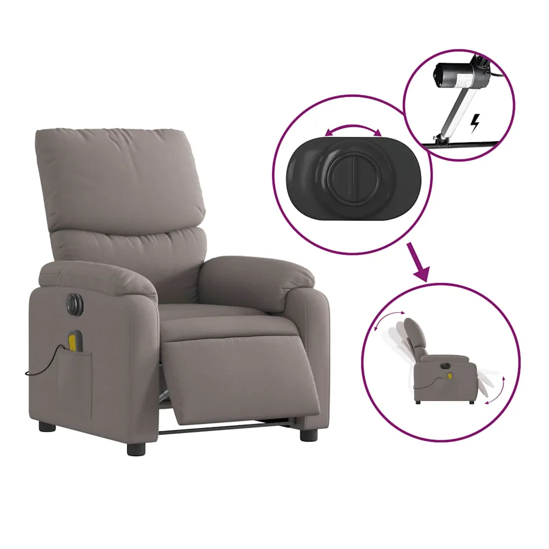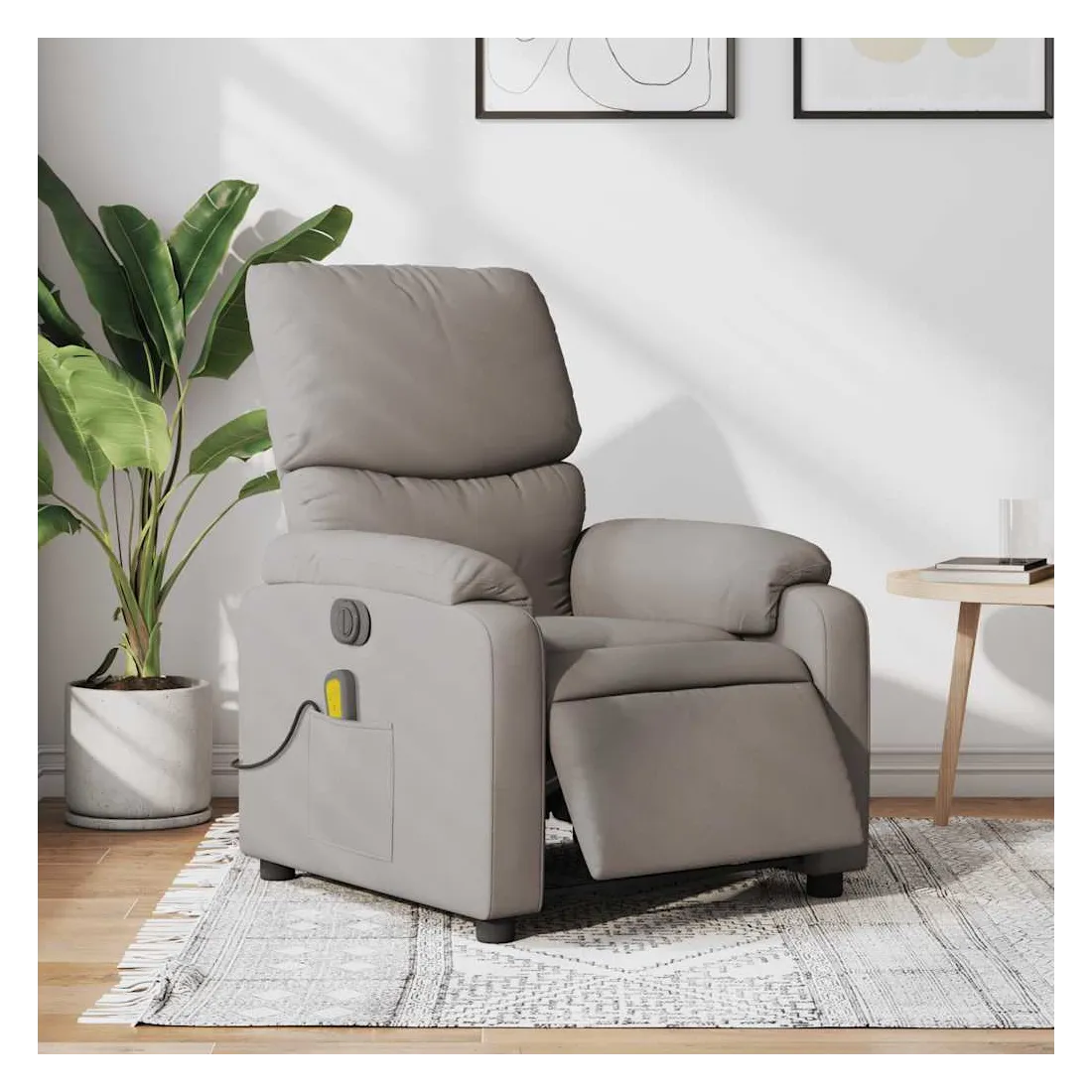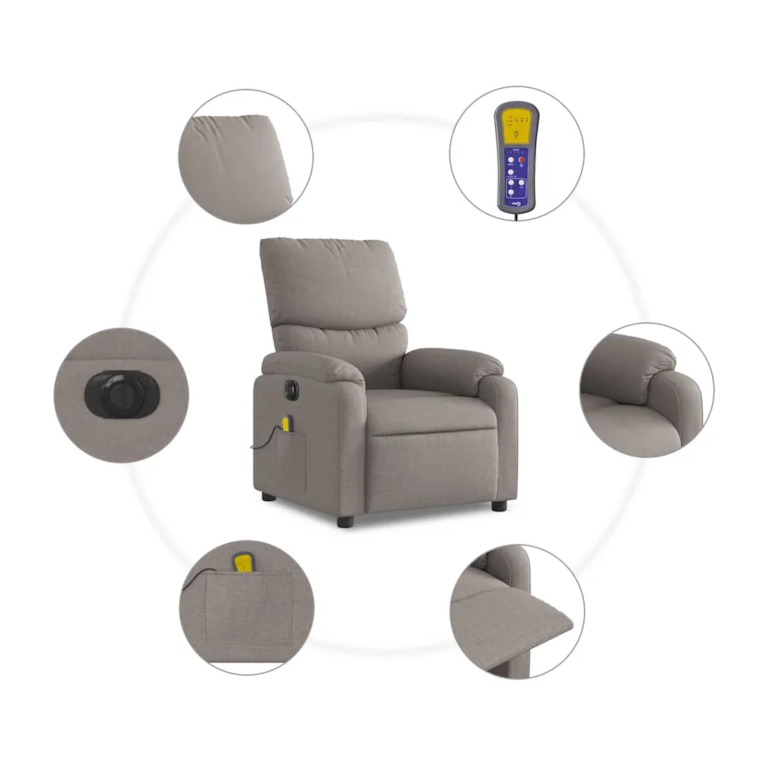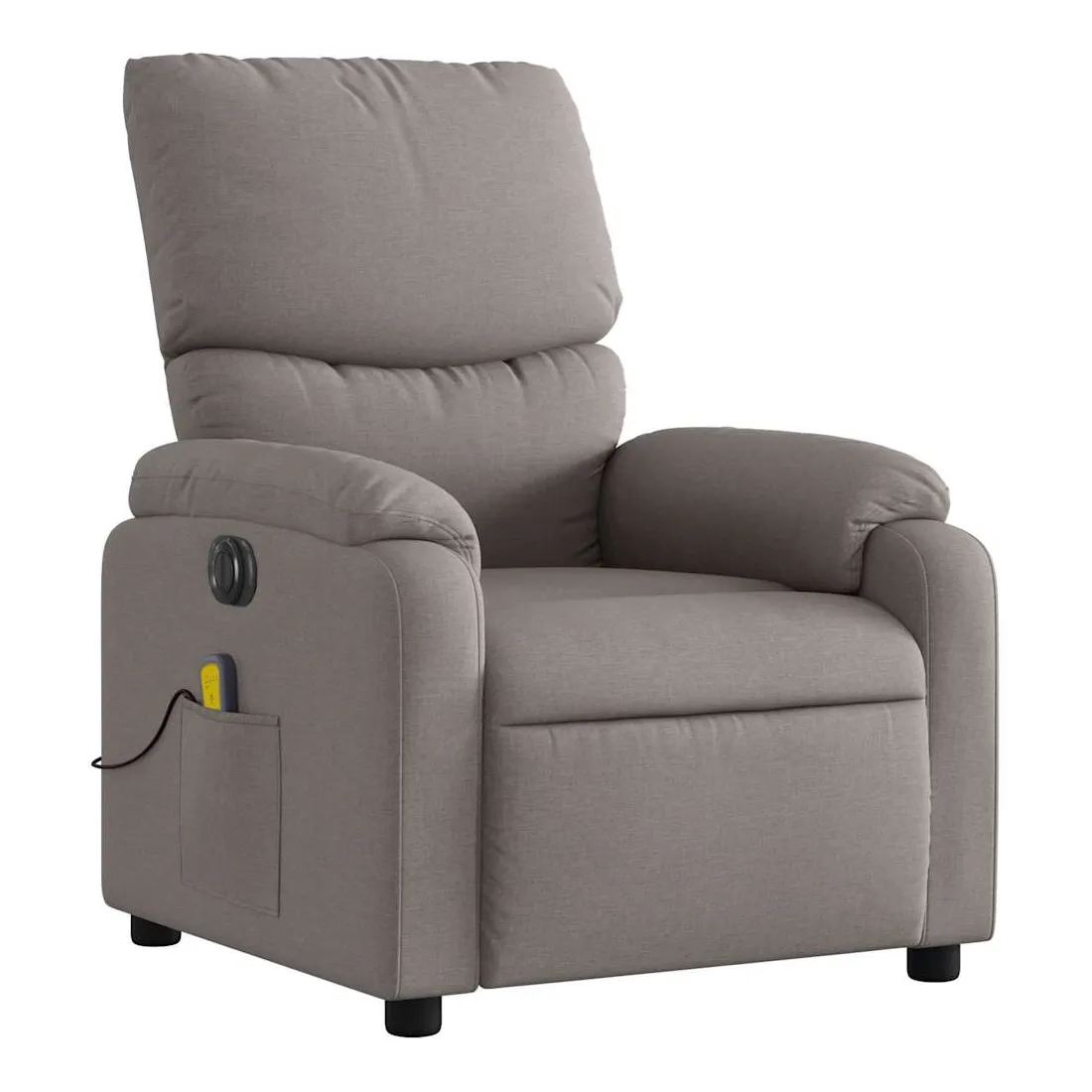 Asseyez-vous et détendez-vous dans ce fauteuil inclinable de massage électrique très confortable ! Fonction d'inclinaison électrique : ce fauteuil inclinable est équipé d'un moteur électrique qui permet de régler automatiquement le repose-pied et le dossier dans n'importe quelle position, selon votre confort, en appuyant simplement sur le bouton situé sur le côté du fauteuil. Cette fonction permet une inclinaison maximale de 135 degrés. En outre, le dossier peut revenir automatiquement à sa position d'origine par une simple pression sur le bouton.Fonction de vibration : les 6 points de massage vous permettent de faire l'expérience d'un massage mieux ciblé. De plus, la télécommande incluse vous permet de choisir différents programmes de massage. La fonction de massage est alimentée par le connecteur USB qui nécessite une source d'alimentation USB certifiée de 5 V (non fournie).Expérience d'assise confortable : le siège, le dossier et les larges accoudoirs bien rembourrés recouverts de tissu procurent une sensation confortable et chaleureuse, vous permettant de vous sentir enveloppé lorsque vous êtes assis. Le tissu présente un aspect simple et épuré et est respirant et durable.Poche latérale pratique : ce fauteuil est doté d'une poche latérale pour ranger votre télécommande ou garder vos objets essentiels à portée de main.Cadre solide et stable : le cadre en bois et en métal offre une structure solide et une grande stabilité. Ce fauteuil inclinable est confortable et durable.