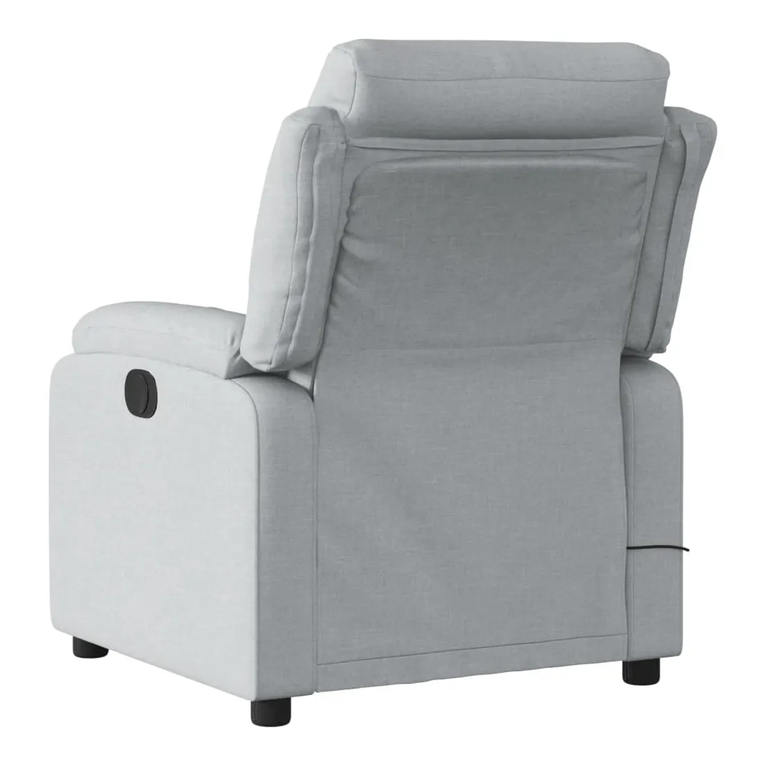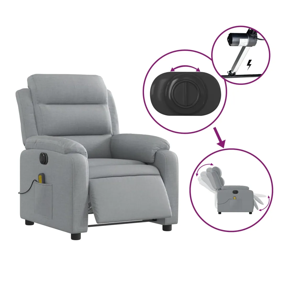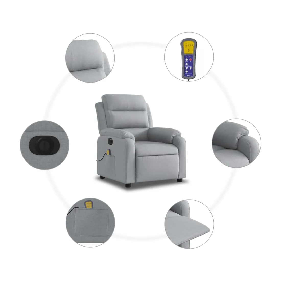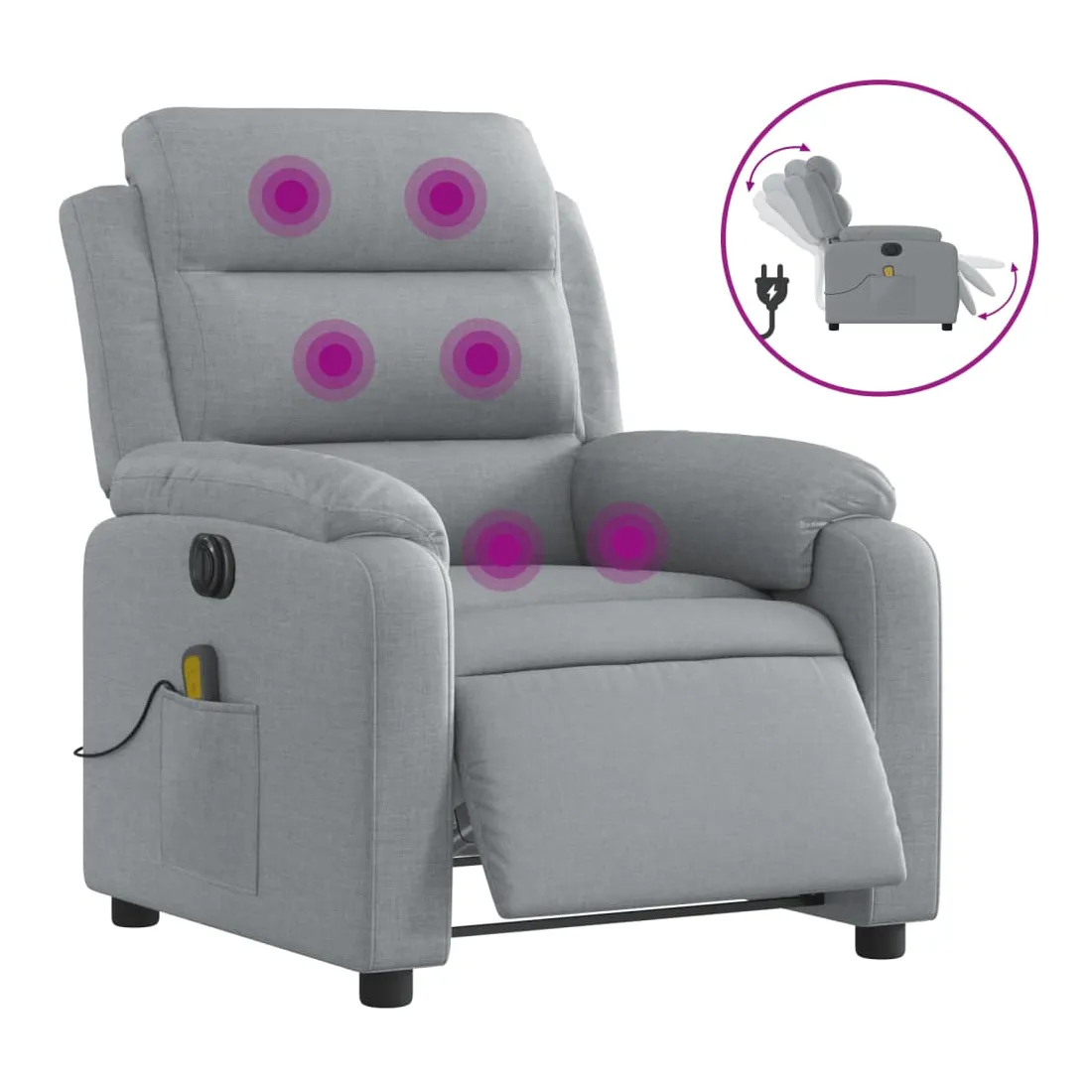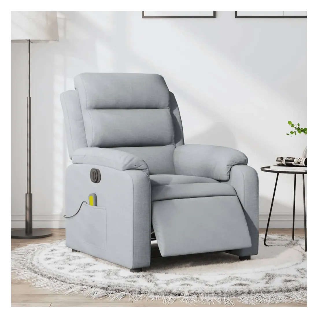 Asseyez-vous et détendez-vous dans ce fauteuil inclinable de massage électrique très confortable ! Fonction d'inclinaison électrique : ce fauteuil inclinable est équipé d'un moteur électrique qui permet de régler automatiquement le repose-pied et le dossier dans n'importe quelle position, selon votre confort, en appuyant simplement sur le bouton situé sur le côté du fauteuil. Cette fonction permet une inclinaison maximale de 135 degrés. En outre, le dossier peut revenir automatiquement à sa position d'origine par une simple pression sur le bouton.Fonction de vibration : les 6 points de massage vous permettent de faire l'expérience d'un massage mieux ciblé. De plus, la télécommande incluse vous permet de choisir différents programmes de massage. La fonction de massage est alimentée par le connecteur USB qui nécessite une source d'alimentation USB certifiée de 5 V (non fournie).Expérience d'assise confortable : le siège, le dossier et les larges accoudoirs bien rembourrés recouverts de tissu procurent une sensation confortable et chaleureuse, vous permettant de vous sentir enveloppé lorsque vous êtes assis. Le tissu présente un aspect simple et épuré et est respirant et durable.Poche latérale pratique : ce fauteuil est doté d'une poche latérale pour ranger votre télécommande ou garder vos objets essentiels à portée de main.Cadre solide et stable : le cadre en bois et en métal offre une structure solide et une grande stabilité. Ce fauteuil inclinable est confortable et durable.