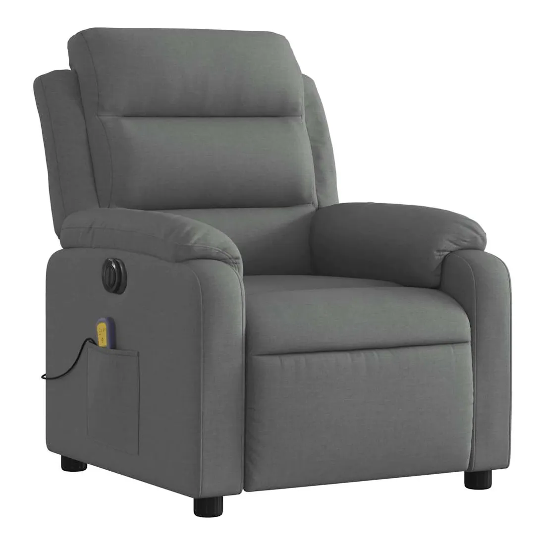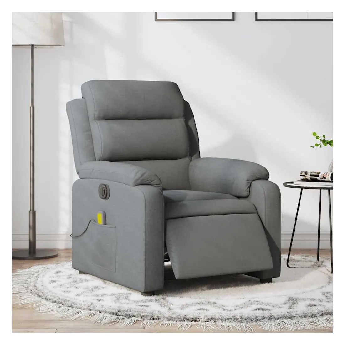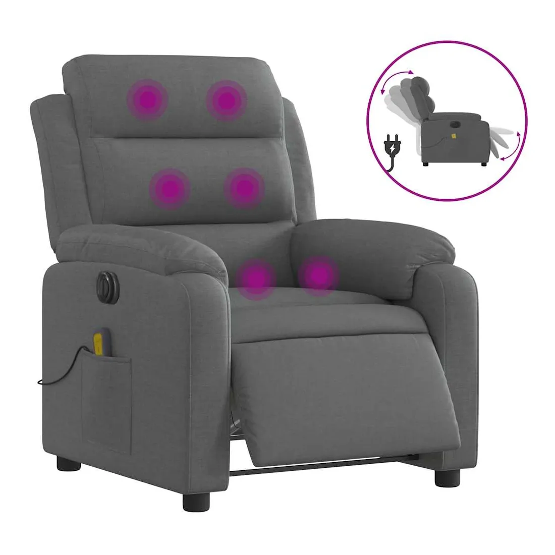 Asseyez-vous et détendez-vous dans ce fauteuil inclinable de massage électrique très confortable ! Fonction d'inclinaison électrique : ce fauteuil inclinable est équipé d'un moteur électrique qui permet de régler automatiquement le repose-pied et le dossier dans n'importe quelle position, selon votre confort, en appuyant simplement sur le bouton situé sur le côté du fauteuil. Cette fonction permet une inclinaison maximale de 135 degrés. En outre, le dossier peut revenir automatiquement à sa position d'origine par une simple pression sur le bouton.Fonction de vibration : les 6 points de massage vous permettent de faire l'expérience d'un massage mieux ciblé. De plus, la télécommande incluse vous permet de choisir différents programmes de massage. La fonction de massage est alimentée par le connecteur USB qui nécessite une source d'alimentation USB certifiée de 5 V (non fournie).Expérience d'assise confortable : le siège, le dossier et les larges accoudoirs bien rembourrés recouverts de tissu procurent une sensation confortable et chaleureuse, vous permettant de vous sentir enveloppé lorsque vous êtes assis. Le tissu présente un aspect simple et épuré et est respirant et durable.Poche latérale pratique : ce fauteuil est doté d'une poche latérale pour ranger votre télécommande ou garder vos objets essentiels à portée de main.Cadre solide et stable : le cadre en bois et en métal offre une structure solide et une grande stabilité. Ce fauteuil inclinable est confortable et durable.