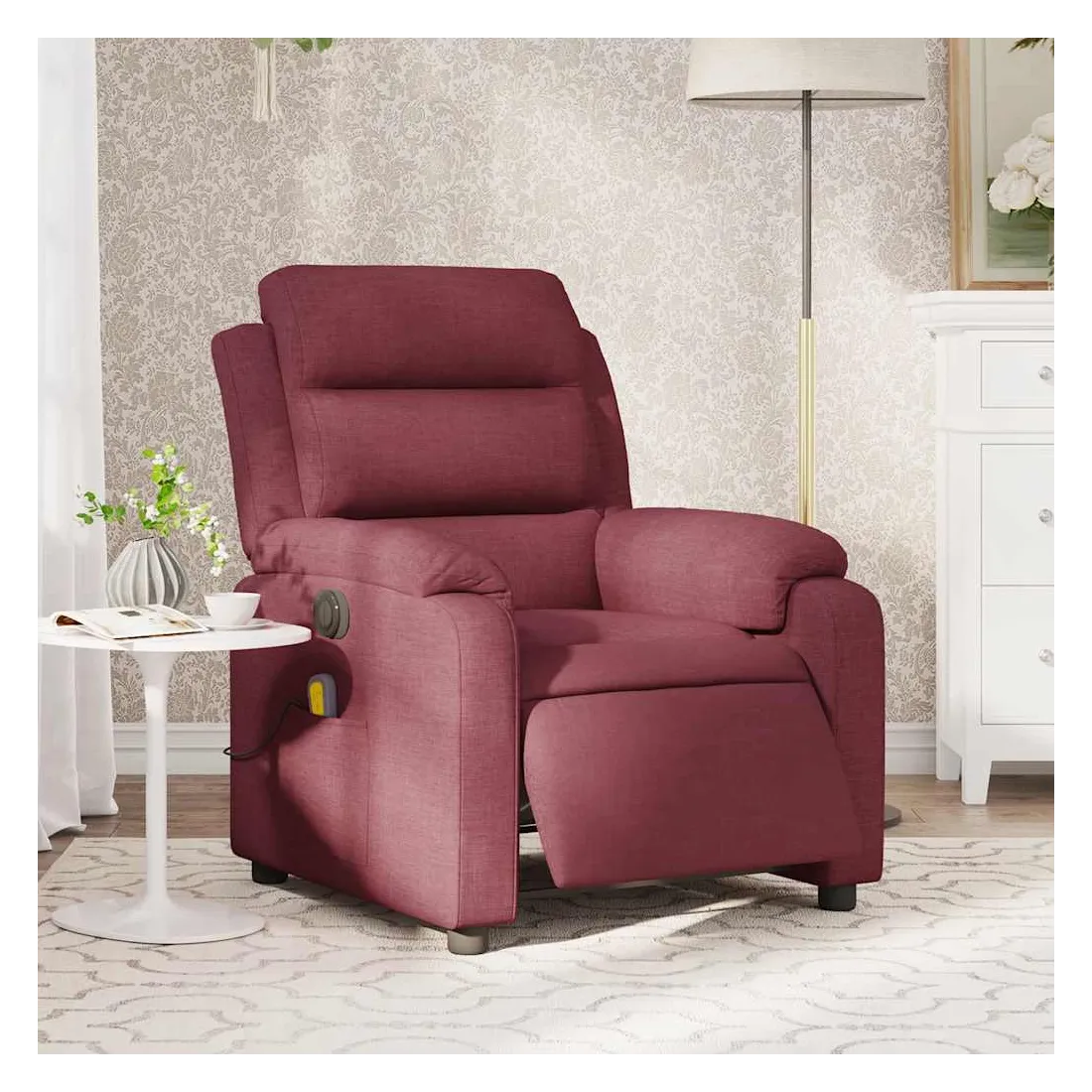 Asseyez-vous et détendez-vous dans ce fauteuil inclinable de massage électrique très confortable ! Fonction d'inclinaison électrique : ce fauteuil inclinable est équipé d'un moteur électrique qui permet de régler automatiquement le repose-pied et le dossier dans n'importe quelle position, selon votre confort, en appuyant simplement sur le bouton situé sur le côté du fauteuil. Cette fonction permet une inclinaison maximale de 135 degrés. En outre, le dossier peut revenir automatiquement à sa position d'origine par une simple pression sur le bouton.Fonction de vibration : les 6 points de massage vous permettent de faire l'expérience d'un massage mieux ciblé. De plus, la télécommande incluse vous permet de choisir différents programmes de massage. La fonction de massage est alimentée par le connecteur USB qui nécessite une source d'alimentation USB certifiée de 5 V (non fournie).Expérience d'assise confortable : le siège, le dossier et les larges accoudoirs bien rembourrés recouverts de tissu procurent une sensation confortable et chaleureuse, vous permettant de vous sentir enveloppé lorsque vous êtes assis. Le tissu présente un aspect simple et épuré et est respirant et durable.Poche latérale pratique : ce fauteuil est doté d'une poche latérale pour ranger votre télécommande ou garder vos objets essentiels à portée de main.Cadre solide et stable : le cadre en bois et en métal offre une structure solide et une grande stabilité. Ce fauteuil inclinable est confortable et durable.