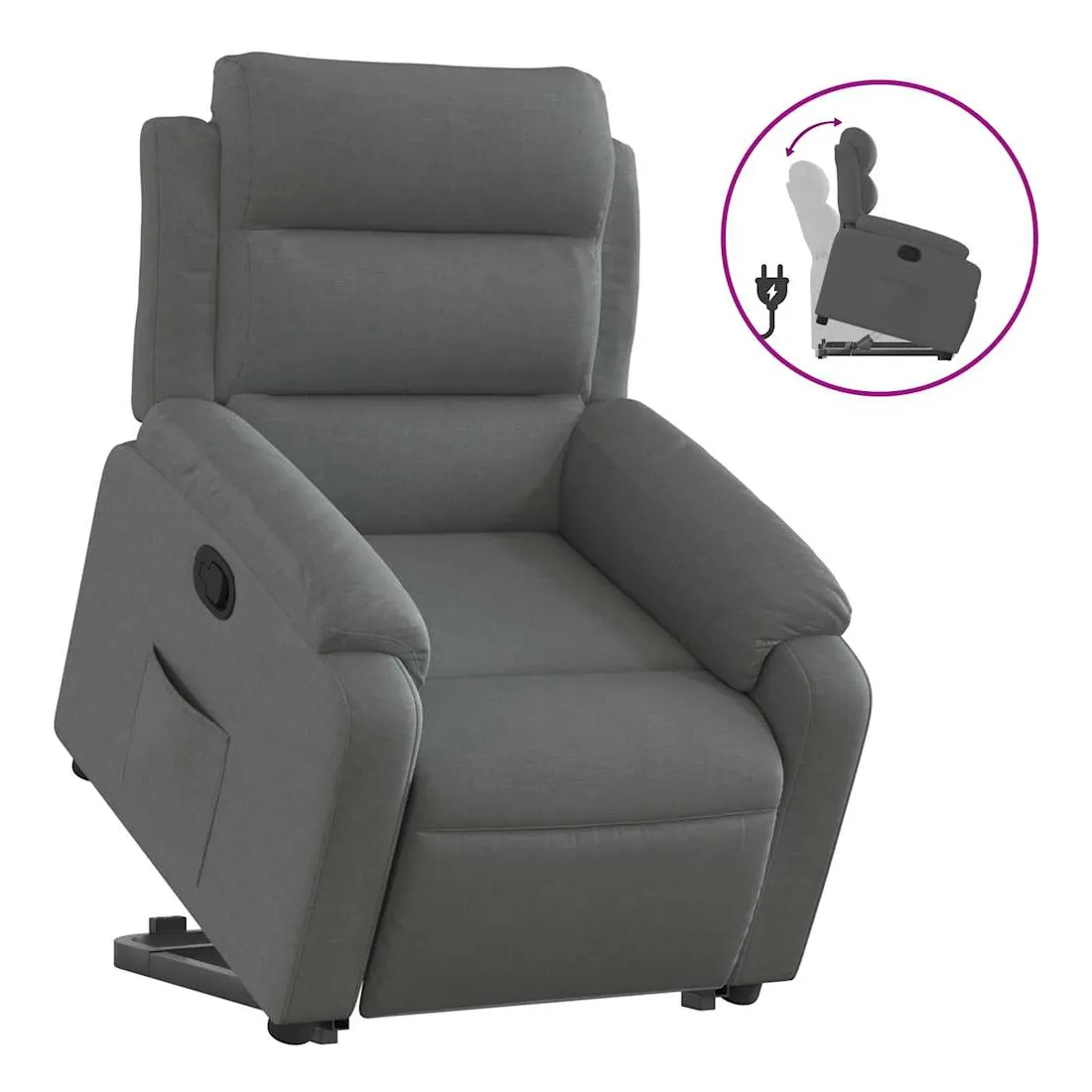 Asseyez-vous et détendez-vous dans ce fauteuil inclinable très confortable ! Fonction de levage électrique : ce fauteuil inclinable pour personnes âgées est équipé d'un moteur électrique pour la fonction de levage. Grâce à la fonction qui pousse toute la chaise vers le haut, vous pouvez facilement vous tenir debout sans stresser votre dos et vos genoux en appuyant simplement sur le bouton.Fonction d'inclinaison manuelle : ce fauteuil inclinable est doté d'une poignée du côté droit. Vous pouvez régler manuellement le repose-pieds et le dossier dans n'importe quelle position selon votre confort en tirant simplement sur la poignée. Cette fonction permet une inclinaison maximale de 135 degrés. De plus, le dossier peut revenir rapidement à sa position d'origine en tirant simplement sur la poignée.Expérience d'assise confortable : le siège, le dossier et les larges accoudoirs bien rembourrés recouverts de tissu procurent une sensation confortable et chaleureuse, vous permettant de vous sentir enveloppé lorsque vous êtes assis. Le tissu présente un aspect simple et épuré et est respirant et durable.Poche latérale pratique : ce fauteuil est doté d'une poche latérale pour vous permettre de garder vos objets essentiels à portée de main.Cadre solide et stable : le cadre en bois et en métal offre une structure solide et une grande stabilité. Ce fauteuil inclinable est confortable et durable.