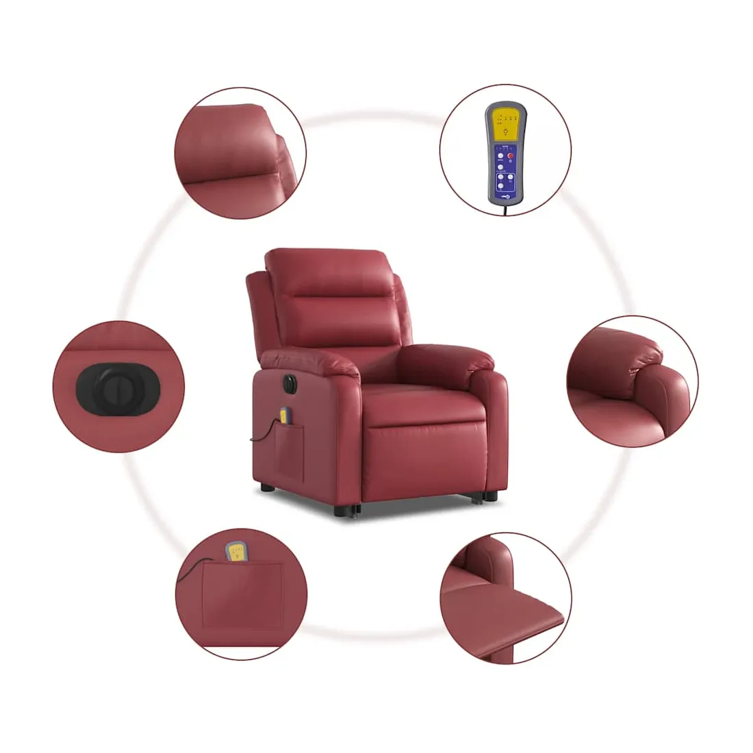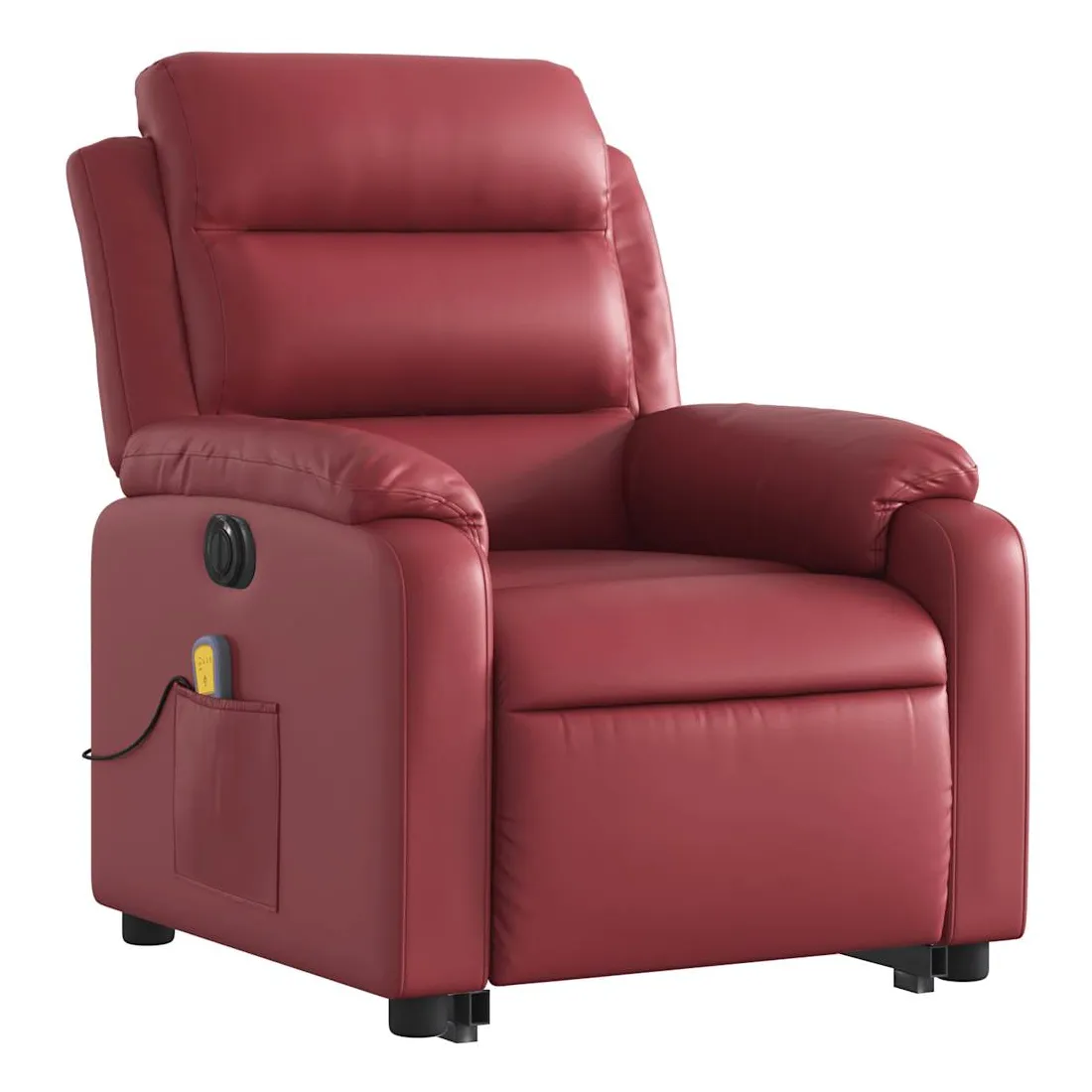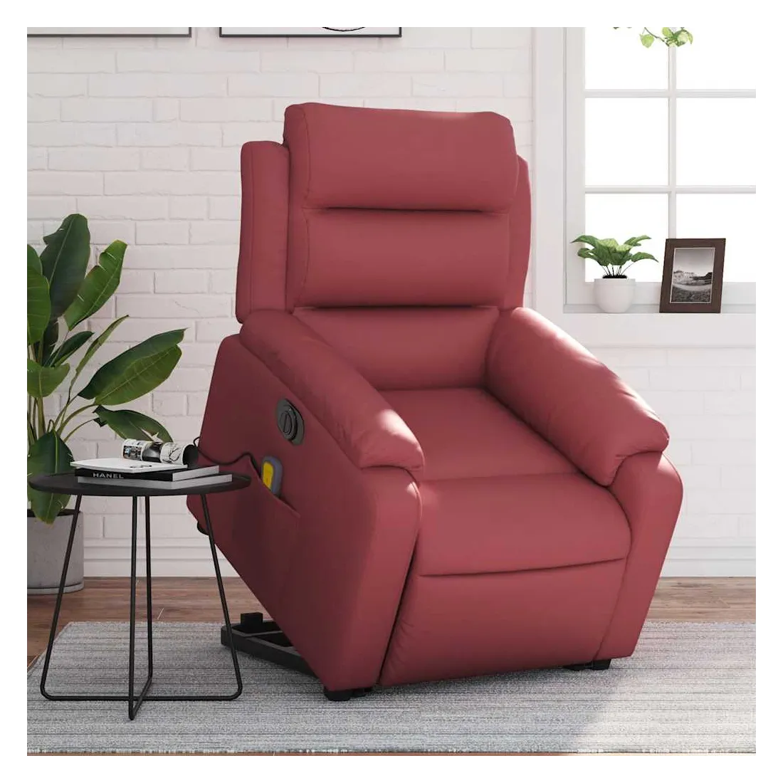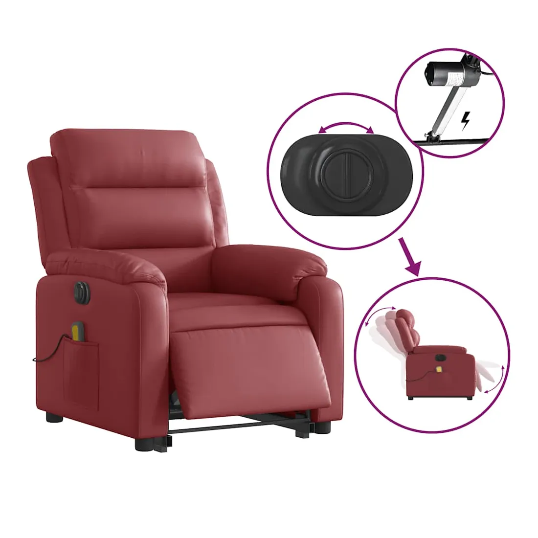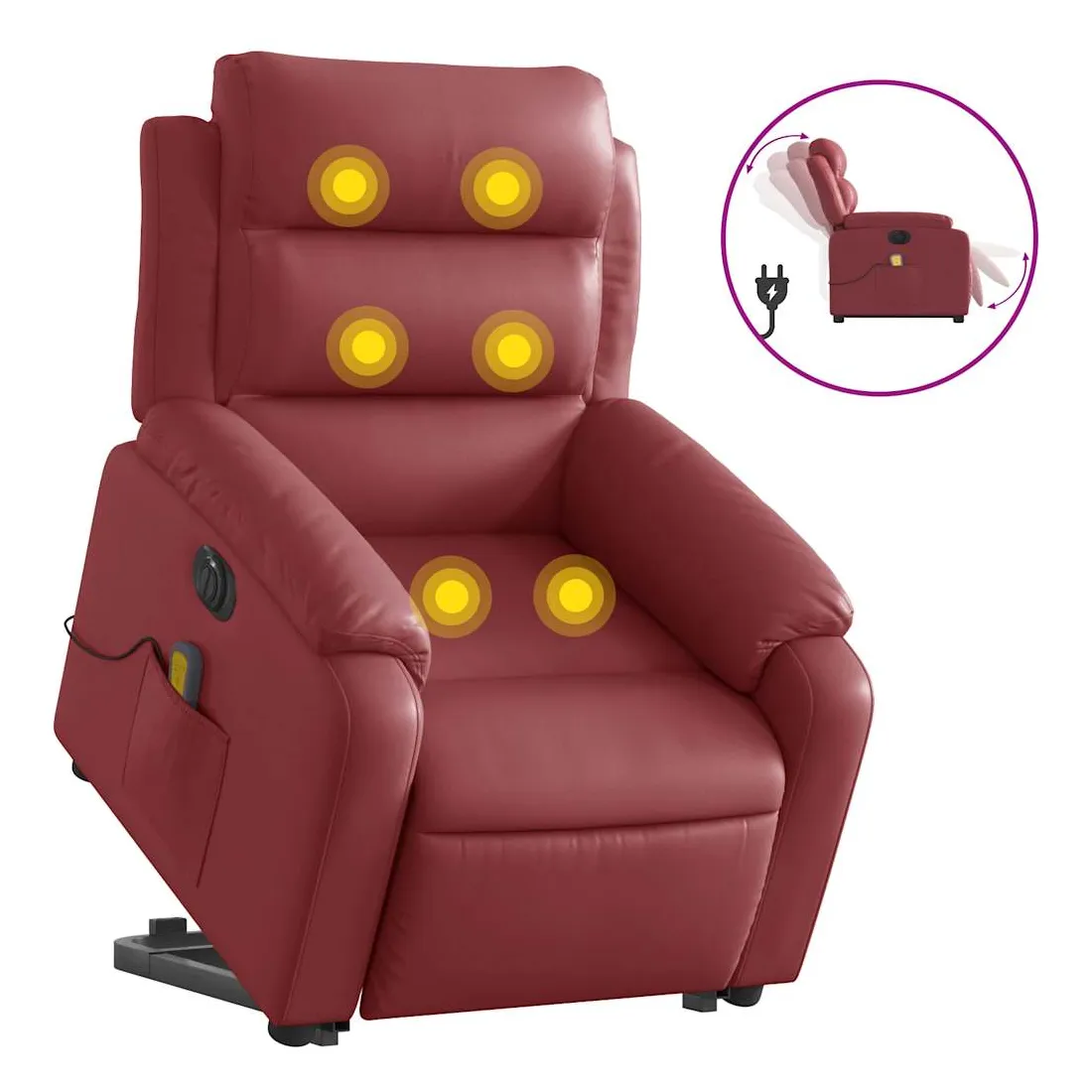 Asseyez-vous et détendez-vous dans ce fauteuil inclinable de massage électrique très confortable ! Fonction de levage électrique : ce fauteuil inclinable pour personnes âgées est équipé d'un moteur électrique pour la fonction de levage. Grâce à la fonction qui pousse toute la chaise vers le haut, vous pouvez facilement vous tenir debout sans stresser votre dos et vos genoux en appuyant simplement sur le bouton.Fonction d'inclinaison électrique : ce fauteuil inclinable est également équipé d'un moteur électrique qui permet de régler automatiquement le repose-pied et le dossier dans n'importe quelle position, selon votre confort, en appuyant simplement sur le bouton situé sur le côté du fauteuil. Cette fonction permet une inclinaison maximale de 135 degrés. En outre, le dossier peut revenir automatiquement à sa position d'origine par une simple pression sur le bouton.Fonction de vibration : les 6 points de massage vous permettent de faire l'expérience d'un massage mieux ciblé. De plus, la télécommande incluse vous permet de choisir différents programmes de massage. La fonction de massage est alimentée par le connecteur USB qui nécessite une source d'alimentation USB certifiée de 5 V (non fournie).Expérience de siège confortable : le siège, le dossier et les larges accoudoirs rembourrés épais recouverts de similicuir procurent une sensation confortable et chaleureuse, vous faisant vous sentir enlacé lorsque vous êtes assis. Le simili cuir est un matériau très résistant. Il est résistant aux taches, ce qui le rend facile à nettoyer avec un chiffon humide. La surface lisse donne également un aspect luxueux et la beauté du cuir véritable.Poche latérale pratique : ce fauteuil est doté d'une poche latérale pour ranger votre télécommande ou garder vos objets essentiels à portée de main.Cadre solide et stable : le cadre en bois et en métal offre une structure solide et une grande stabilité. Ce fauteuil inclinable est confortable et durable.