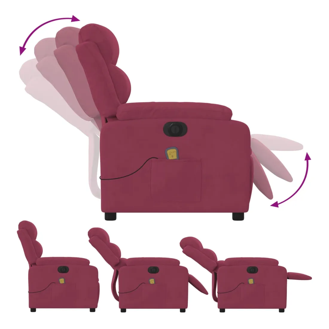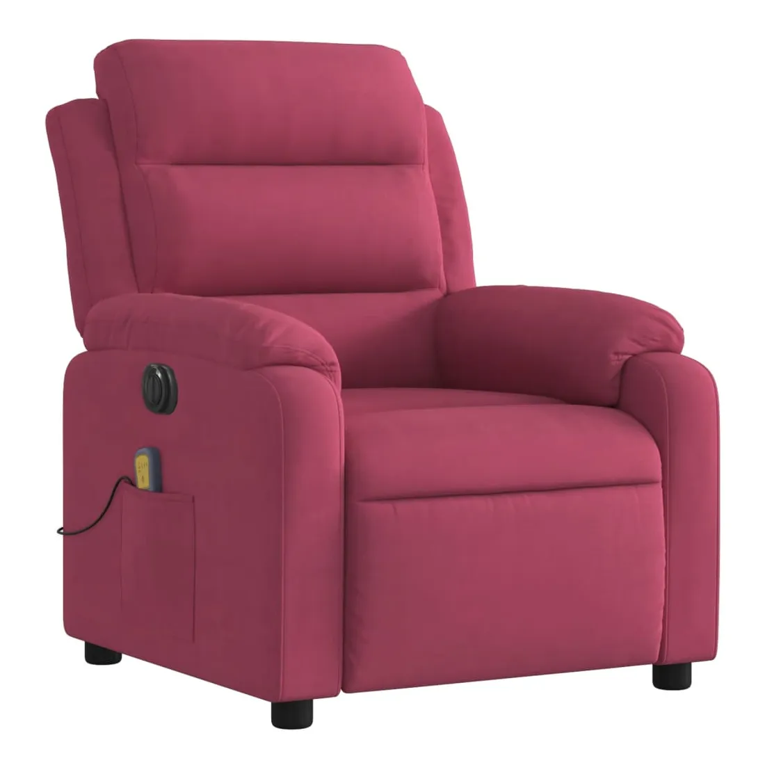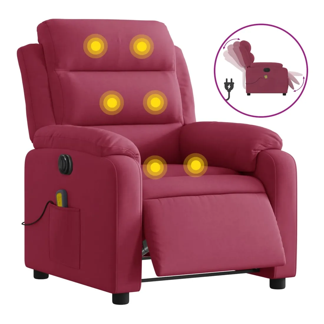 Asseyez-vous et détendez-vous dans ce fauteuil inclinable de massage électrique très confortable ! Fonction d'inclinaison électrique : ce fauteuil inclinable est équipé d'un moteur électrique qui permet de régler automatiquement le repose-pied et le dossier dans n'importe quelle position, selon votre confort, en appuyant simplement sur le bouton situé sur le côté du fauteuil. Cette fonction permet une inclinaison maximale de 135 degrés. En outre, le dossier peut revenir automatiquement à sa position d'origine par une simple pression sur le bouton.Fonction de vibration : les 6 points de massage vous permettent de faire l'expérience d'un massage mieux ciblé. De plus, la télécommande incluse vous permet de choisir différents programmes de massage. La fonction de massage est alimentée par le connecteur USB qui nécessite une source d'alimentation USB certifiée de 5 V (non fournie).Expérience d'assise confortable : le siège, le dossier et les larges accoudoirs rembourrés épais recouverts de velours procurent une sensation confortable et chaleureuse, vous faisant vous sentir enlacé lorsque vous êtes assis. Le velours est un tissu doux et confortable qui est agréable sur la peau.Poche latérale pratique : ce fauteuil est doté d'une poche latérale pour ranger votre télécommande ou garder vos objets essentiels à portée de main.Cadre solide et stable : le cadre en bois et en métal offre une structure solide et une grande stabilité. Ce fauteuil inclinable est confortable et durable.