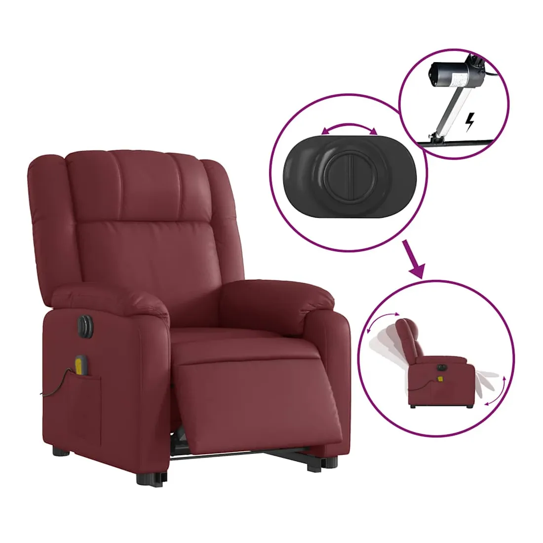 Asseyez-vous et détendez-vous dans ce fauteuil inclinable de massage électrique très confortable ! Fonction de levage électrique : ce fauteuil inclinable pour personnes âgées est équipé d'un moteur électrique pour la fonction de levage. Grâce à la fonction qui pousse toute la chaise vers le haut, vous pouvez facilement vous tenir debout sans stresser votre dos et vos genoux en appuyant simplement sur le bouton.Fonction d'inclinaison électrique : ce fauteuil inclinable est également équipé d'un moteur électrique qui permet de régler automatiquement le repose-pied et le dossier dans n'importe quelle position, selon votre confort, en appuyant simplement sur le bouton situé sur le côté du fauteuil. Cette fonction permet une inclinaison maximale de 135 degrés. En outre, le dossier peut revenir automatiquement à sa position d'origine par une simple pression sur le bouton.Fonction de vibration : les 6 points de massage vous permettent de faire l'expérience d'un massage mieux ciblé. De plus, la télécommande incluse vous permet de choisir différents programmes de massage. La fonction de massage est alimentée par le connecteur USB qui nécessite une source d'alimentation USB certifiée de 5 V (non fournie).Expérience de siège confortable : le siège, le dossier et les larges accoudoirs rembourrés épais recouverts de similicuir procurent une sensation confortable et chaleureuse, vous faisant vous sentir enlacé lorsque vous êtes assis. Le simili cuir est un matériau très résistant. Il est résistant aux taches, ce qui le rend facile à nettoyer avec un chiffon humide. La surface lisse donne également un aspect luxueux et la beauté du cuir véritable.Poche latérale pratique : ce fauteuil est doté d'une poche latérale pour ranger votre télécommande ou garder vos objets essentiels à portée de main.Cadre solide et stable : le cadre en bois et en métal offre une structure solide et une grande stabilité. Ce fauteuil inclinable est confortable et durable.