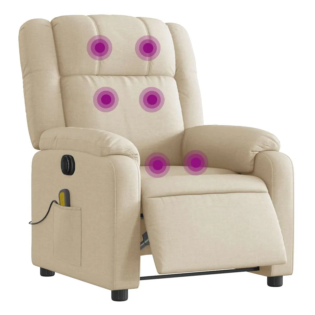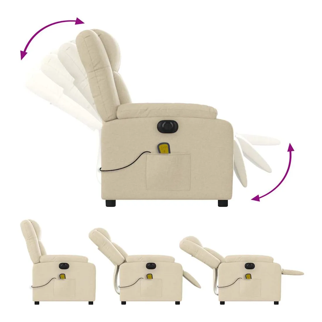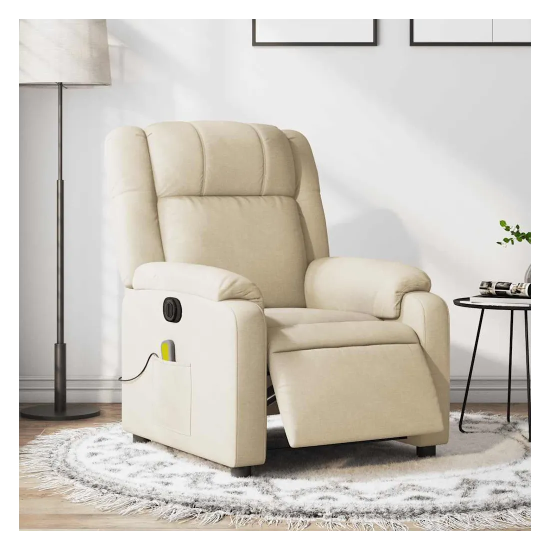 Asseyez-vous et détendez-vous dans ce fauteuil inclinable de massage électrique très confortable ! Fonction d'inclinaison électrique : ce fauteuil inclinable est équipé d'un moteur électrique qui permet de régler automatiquement le repose-pied et le dossier dans n'importe quelle position, selon votre confort, en appuyant simplement sur le bouton situé sur le côté du fauteuil. Cette fonction permet une inclinaison maximale de 135 degrés. En outre, le dossier peut revenir automatiquement à sa position d'origine par une simple pression sur le bouton.Fonction de vibration : les 6 points de massage vous permettent de faire l'expérience d'un massage mieux ciblé. De plus, la télécommande incluse vous permet de choisir différents programmes de massage. La fonction de massage est alimentée par le connecteur USB qui nécessite une source d'alimentation USB certifiée de 5 V (non fournie).Expérience d'assise confortable : le siège, le dossier et les larges accoudoirs bien rembourrés recouverts de tissu procurent une sensation confortable et chaleureuse, vous permettant de vous sentir enveloppé lorsque vous êtes assis. Le tissu présente un aspect simple et épuré et est respirant et durable.Poche latérale pratique : ce fauteuil est doté d'une poche latérale pour ranger votre télécommande ou garder vos objets essentiels à portée de main.Cadre solide et stable : le cadre en bois et en métal offre une structure solide et une grande stabilité. Ce fauteuil inclinable est confortable et durable.