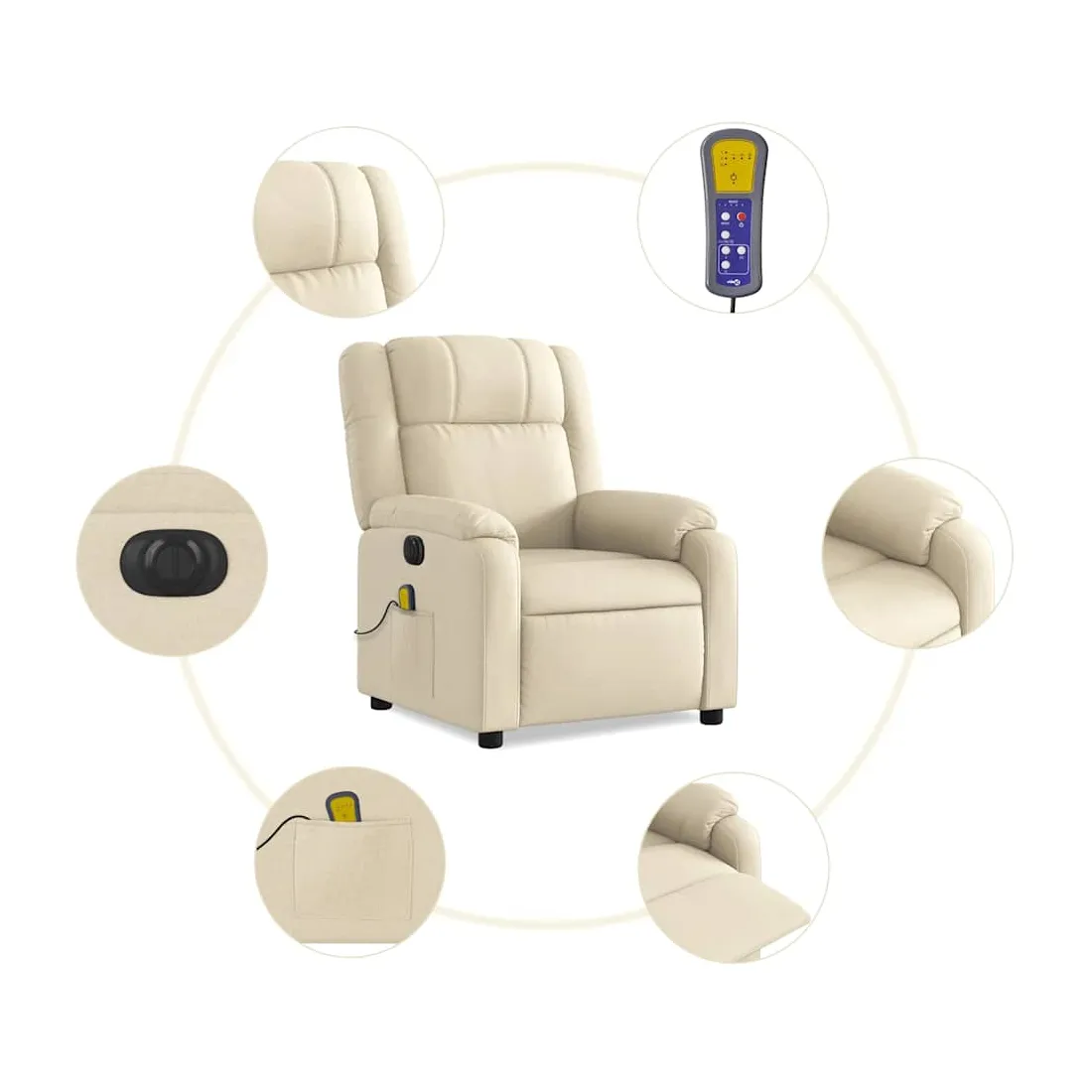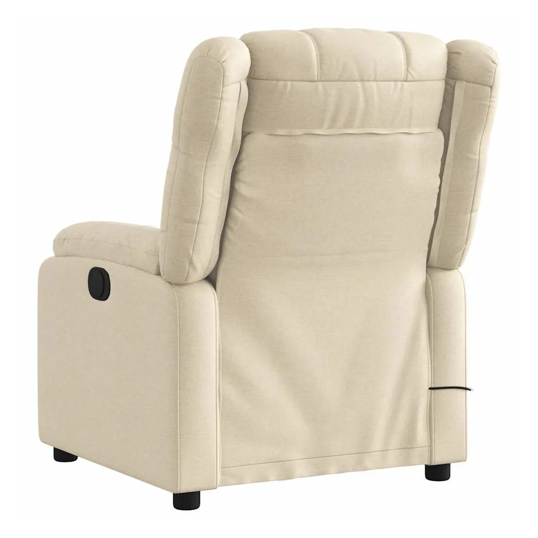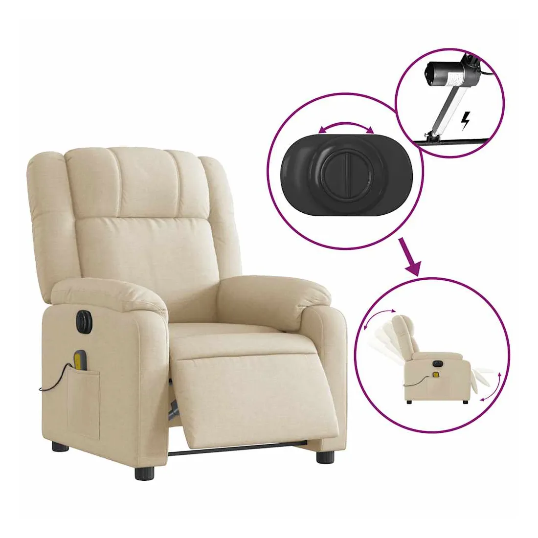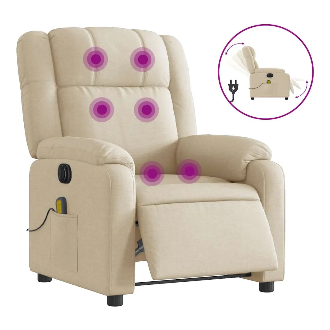 Asseyez-vous et détendez-vous dans ce fauteuil inclinable de massage électrique très confortable ! Fonction d'inclinaison électrique : ce fauteuil inclinable est équipé d'un moteur électrique qui permet de régler automatiquement le repose-pied et le dossier dans n'importe quelle position, selon votre confort, en appuyant simplement sur le bouton situé sur le côté du fauteuil. Cette fonction permet une inclinaison maximale de 135 degrés. En outre, le dossier peut revenir automatiquement à sa position d'origine par une simple pression sur le bouton.Fonction de vibration : les 6 points de massage vous permettent de faire l'expérience d'un massage mieux ciblé. De plus, la télécommande incluse vous permet de choisir différents programmes de massage. La fonction de massage est alimentée par le connecteur USB qui nécessite une source d'alimentation USB certifiée de 5 V (non fournie).Expérience d'assise confortable : le siège, le dossier et les larges accoudoirs bien rembourrés recouverts de tissu procurent une sensation confortable et chaleureuse, vous permettant de vous sentir enveloppé lorsque vous êtes assis. Le tissu présente un aspect simple et épuré et est respirant et durable.Poche latérale pratique : ce fauteuil est doté d'une poche latérale pour ranger votre télécommande ou garder vos objets essentiels à portée de main.Cadre solide et stable : le cadre en bois et en métal offre une structure solide et une grande stabilité. Ce fauteuil inclinable est confortable et durable.