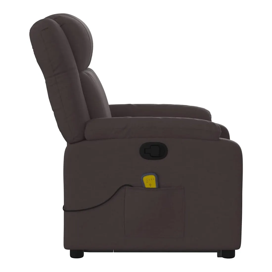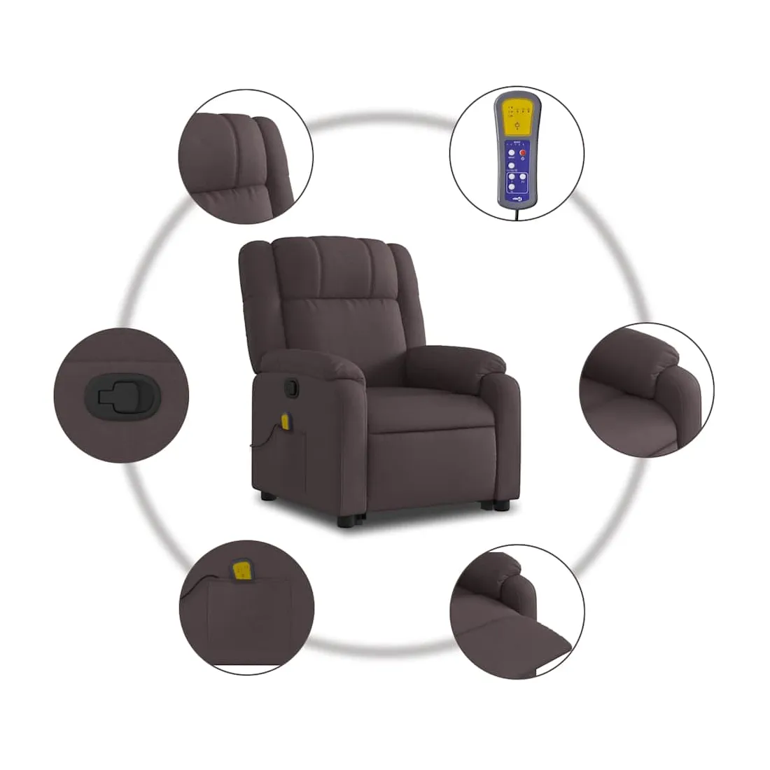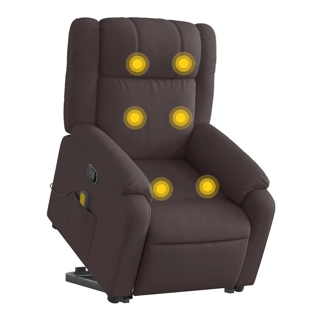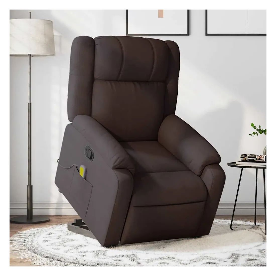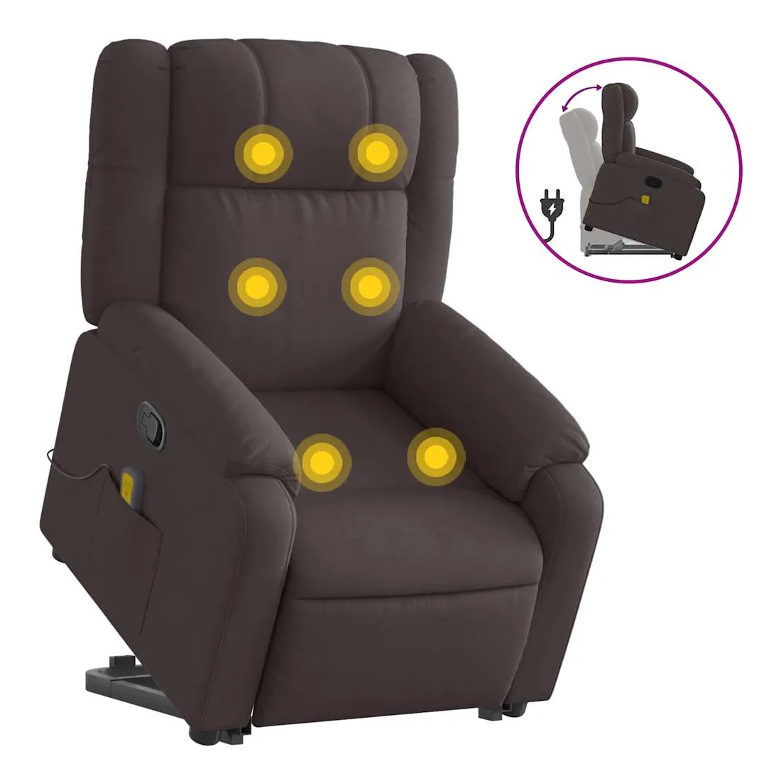 Asseyez-vous et détendez-vous dans ce fauteuil inclinable de massage très confortable ! Fonction de levage électrique : ce fauteuil inclinable pour personnes âgées est équipé d'un moteur électrique pour la fonction de levage. Grâce à la fonction qui pousse toute la chaise vers le haut, vous pouvez facilement vous tenir debout sans stresser votre dos et vos genoux en appuyant simplement sur le bouton.Fonction d'inclinaison manuelle : ce fauteuil inclinable est doté d'une poignée du côté droit. Vous pouvez régler manuellement le repose-pieds et le dossier dans n'importe quelle position selon votre confort en tirant simplement sur la poignée. Cette fonction permet une inclinaison maximale de 135 degrés. De plus, le dossier peut revenir rapidement à sa position d'origine en tirant simplement sur la poignée.Fonction de vibration : les 6 points de massage vous permettent de faire l'expérience d'un massage mieux ciblé. De plus, la télécommande incluse vous permet de choisir différents programmes de massage. La fonction de massage est alimentée par le connecteur USB qui nécessite une source d'alimentation USB certifiée de 5 V (non fournie).Expérience d'assise confortable : le siège, le dossier et les larges accoudoirs bien rembourrés recouverts de tissu procurent une sensation confortable et chaleureuse, vous permettant de vous sentir enveloppé lorsque vous êtes assis. Le tissu présente un aspect simple et épuré et est respirant et durable.Poche latérale pratique : ce fauteuil est doté d'une poche latérale pour ranger votre télécommande ou garder vos objets essentiels à portée de main.Cadre solide et stable : le cadre en bois et en métal offre une structure solide et une grande stabilité. Ce fauteuil inclinable est confortable et durable.