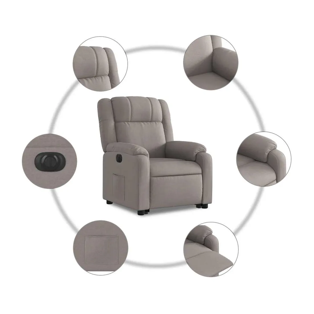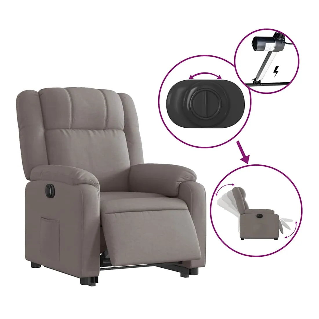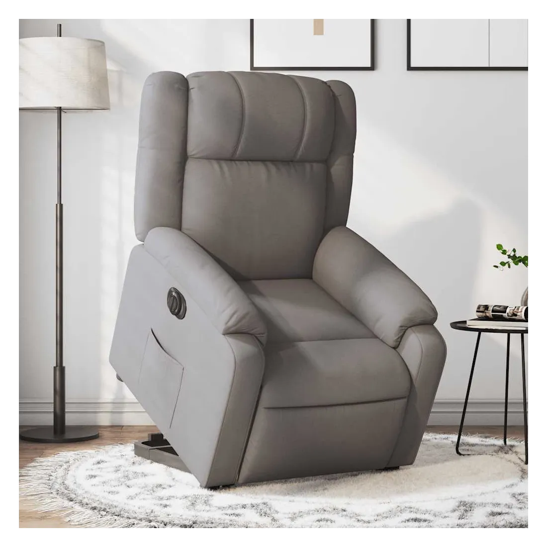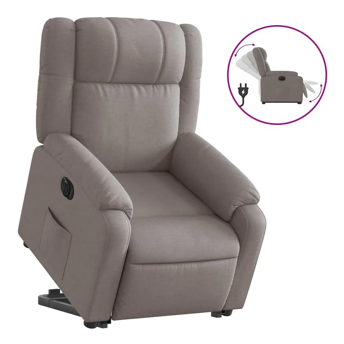 Asseyez-vous et détendez-vous dans ce fauteuil inclinable électrique très confortable ! Fonction de levage électrique : ce fauteuil inclinable pour personnes âgées est équipé d'un moteur électrique pour la fonction de levage. Grâce à la fonction qui pousse toute la chaise vers le haut, vous pouvez facilement vous tenir debout sans stresser votre dos et vos genoux en appuyant simplement sur le bouton.Fonction d'inclinaison électrique : ce fauteuil inclinable est également équipé d'un moteur électrique qui permet de régler automatiquement le repose-pied et le dossier dans n'importe quelle position, selon votre confort, en appuyant simplement sur le bouton situé sur le côté du fauteuil. Cette fonction permet une inclinaison maximale de 135 degrés. En outre, le dossier peut revenir automatiquement à sa position d'origine par une simple pression sur le bouton.Expérience d'assise confortable : le siège, le dossier et les larges accoudoirs bien rembourrés recouverts de tissu procurent une sensation confortable et chaleureuse, vous permettant de vous sentir enveloppé lorsque vous êtes assis. Le tissu présente un aspect simple et épuré et est respirant et durable.Poche latérale pratique : ce fauteuil est doté d'une poche latérale pour vous permettre de garder vos objets essentiels à portée de main.Cadre solide et stable : le cadre en bois et en métal offre une structure solide et une grande stabilité. Ce fauteuil inclinable est confortable et durable.