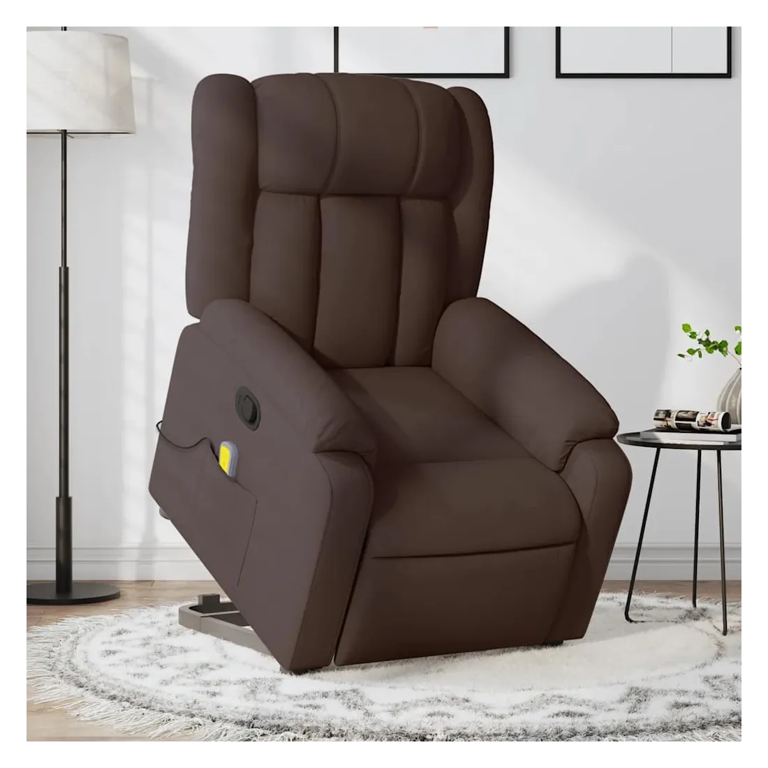 Asseyez-vous et détendez-vous dans ce fauteuil inclinable de massage très confortable ! Fonction de levage électrique : ce fauteuil inclinable pour personnes âgées est équipé d'un moteur électrique pour la fonction de levage. Grâce à la fonction qui pousse toute la chaise vers le haut, vous pouvez facilement vous tenir debout sans stresser votre dos et vos genoux en appuyant simplement sur le bouton. Fonction d'inclinaison manuelle : ce fauteuil inclinable est doté d'une poignée du côté droit. Vous pouvez régler manuellement le repose-pieds et le dossier dans n'importe quelle position selon votre confort en tirant simplement sur la poignée. Cette fonction permet une inclinaison maximale de 135 degrés. De plus, le dossier peut revenir rapidement à sa position d'origine en tirant simplement sur la poignée. Fonction de vibration : les 6 points de massage vous permettent de faire l'expérience d'un massage mieux ciblé. De plus, la télécommande incluse vous permet de choisir différents programmes de massage. La fonction de massage est alimentée par le connecteur USB qui nécessite une source d'alimentation USB certifiée de 5 V (non fournie). Expérience d'assise confortable : le siège, le dossier et les larges accoudoirs bien rembourrés recouverts de tissu procurent une sensation confortable et chaleureuse, vous permettant de vous sentir enveloppé lorsque vous êtes assis. Le tissu présente un aspect simple et épuré et est respirant et durable. Poche latérale pratique : ce fauteuil est doté d'une poche latérale pour ranger votre télécommande ou garder vos objets essentiels à portée de main. Cadre solide et stable : le cadre en bois et en métal offre une structure solide et une grande stabilité. Ce fauteuil inclinable est confortable et durable.