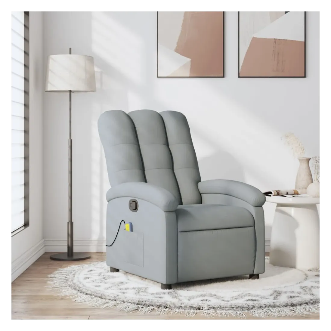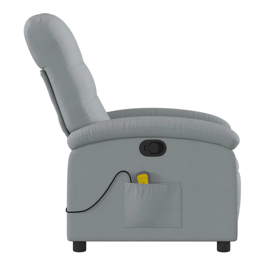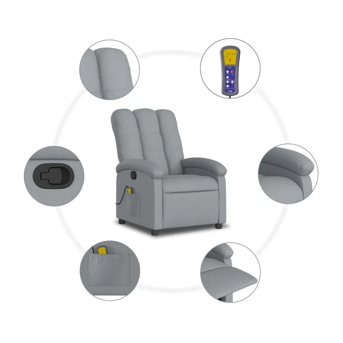 Asseyez-vous et détendez-vous dans ce fauteuil inclinable de massage très confortable ! Fonction d'inclinaison manuelle : ce fauteuil inclinable est doté d'une poignée du côté droit. Vous pouvez régler manuellement le repose-pieds et le dossier dans n'importe quelle position selon votre confort en tirant simplement sur la poignée. Cette fonction permet une inclinaison maximale de 135 degrés. De plus, le dossier peut revenir rapidement à sa position d'origine en tirant simplement sur la poignée.Fonction de vibration : les 6 points de massage vous permettent de faire l'expérience d'un massage mieux ciblé. De plus, la télécommande incluse vous permet de choisir différents programmes de massage. La fonction de massage est alimentée par le connecteur USB, mais la source d'alimentation USB 5V certifiée n'est pas incluse.Expérience d'assise confortable : le siège, le dossier et les larges accoudoirs bien rembourrés recouverts de tissu procurent une sensation confortable et chaleureuse, vous permettant de vous sentir enveloppé lorsque vous êtes assis. Le tissu présente un aspect simple et épuré et est respirant et durable.Poche latérale pratique : ce fauteuil est doté d'une poche latérale pour ranger votre télécommande ou garder vos objets essentiels à portée de main.Cadre solide et stable : le cadre en bois et en métal offre une structure solide et une grande stabilité. Ce fauteuil inclinable est confortable et durable.