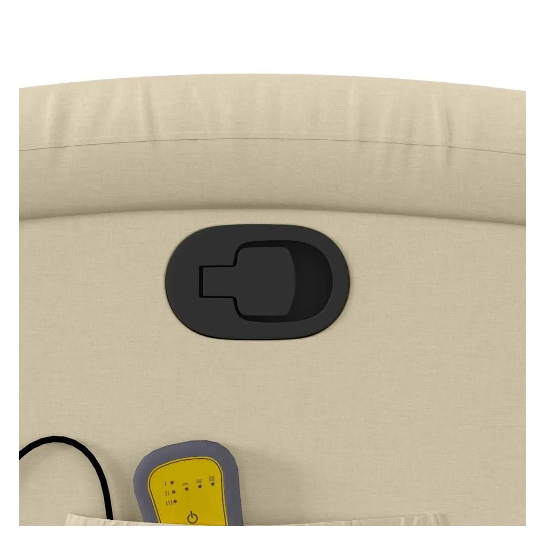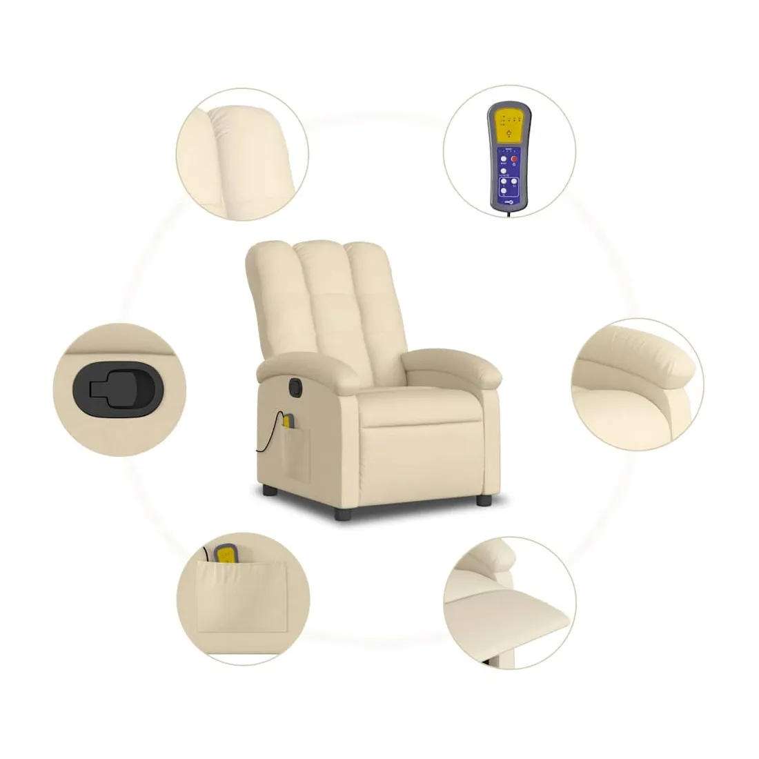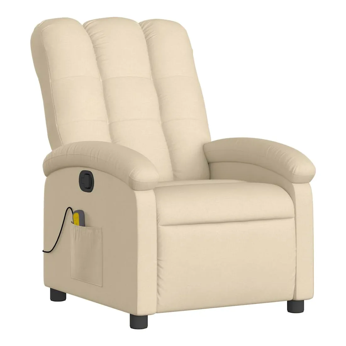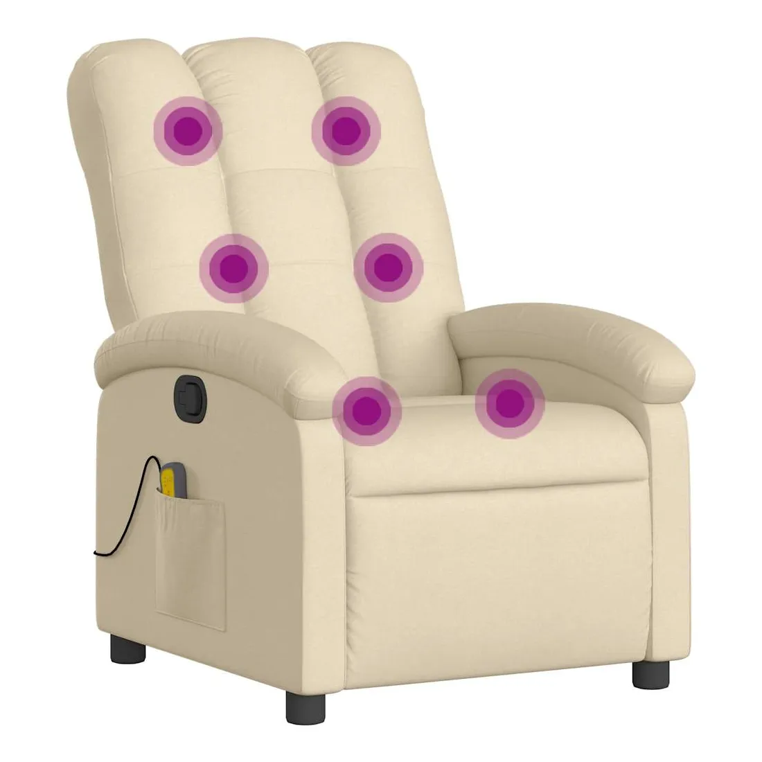 Asseyez-vous et détendez-vous dans ce fauteuil inclinable de massage très confortable ! Fonction d'inclinaison manuelle : ce fauteuil inclinable est doté d'une poignée du côté droit. Vous pouvez régler manuellement le repose-pieds et le dossier dans n'importe quelle position selon votre confort en tirant simplement sur la poignée. Cette fonction permet une inclinaison maximale de 135 degrés. De plus, le dossier peut revenir rapidement à sa position d'origine en tirant simplement sur la poignée.Fonction de vibration : les 6 points de massage vous permettent de faire l'expérience d'un massage mieux ciblé. De plus, la télécommande incluse vous permet de choisir différents programmes de massage. La fonction de massage est alimentée par le connecteur USB, mais la source d'alimentation USB 5V certifiée n'est pas incluse.Expérience d'assise confortable : le siège, le dossier et les larges accoudoirs bien rembourrés recouverts de tissu procurent une sensation confortable et chaleureuse, vous permettant de vous sentir enveloppé lorsque vous êtes assis. Le tissu présente un aspect simple et épuré et est respirant et durable.Poche latérale pratique : ce fauteuil est doté d'une poche latérale pour ranger votre télécommande ou garder vos objets essentiels à portée de main.Cadre solide et stable : le cadre en bois et en métal offre une structure solide et une grande stabilité. Ce fauteuil inclinable est confortable et durable.
