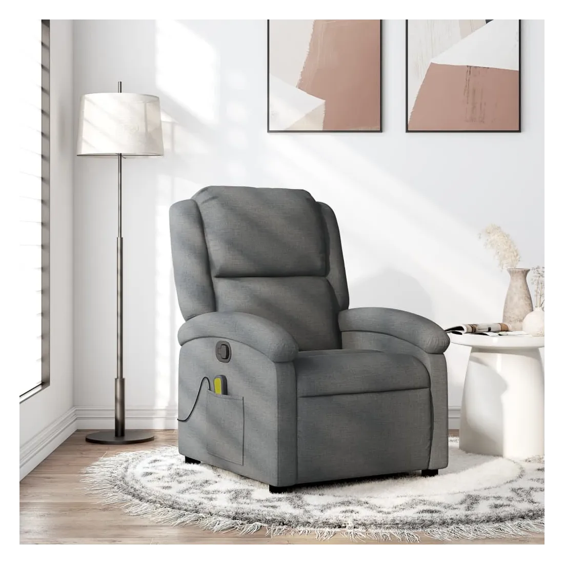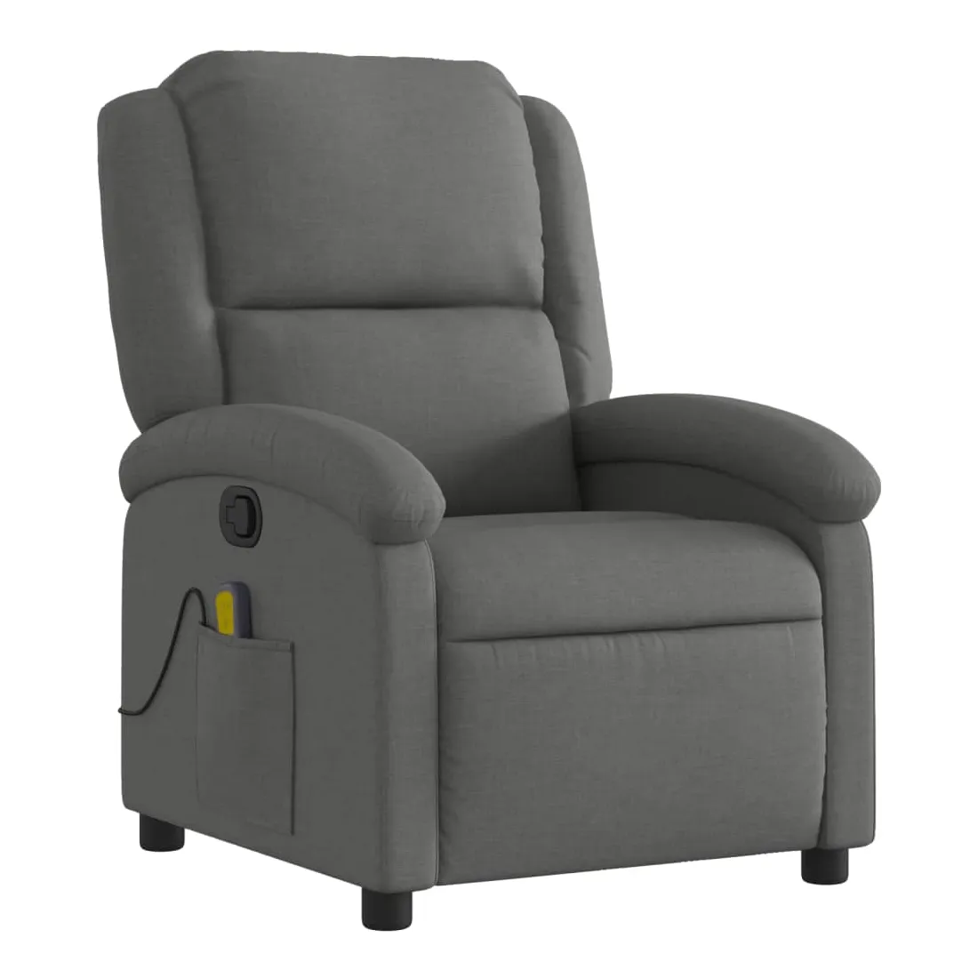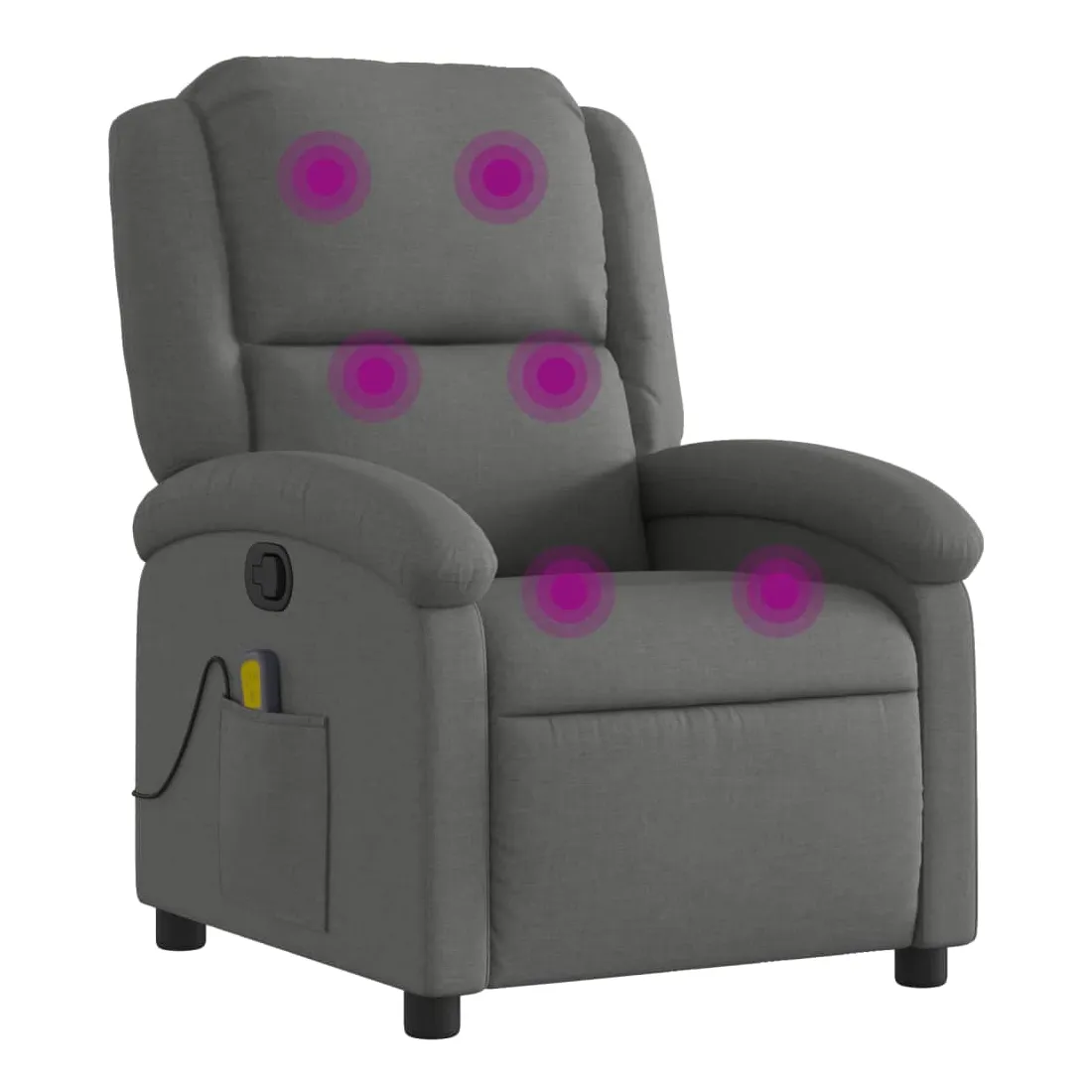 Asseyez-vous et laissez-vous aller dans ce fauteuil inclinable massant très confortable ! Fonction d'inclinaison manuelle : Ce fauteuil inclinable est doté d'un bouton sur le côté droit. Vous pouvez régler manuellement le repose-pieds et le dossier dans n'importe quelle position selon votre confort en tirant simplement sur la poignée. Cette fonction permet une inclinaison maximale de 135 degrés. De plus, le dossier peut revenir rapidement à sa position initiale en tirant facilement sur la poignée.Fonction de vibration : Les 6 points de massage vous permettent de bénéficier d'un massage mieux ciblé. De plus, la télécommande incluse vous permet de choisir différents programmes de massage. La fonction de massage est alimentée par le connecteur USB, mais la source d'alimentation USB 5 V certifiée n'est pas incluse.Expérience d'assise confortable : Le siège, le dossier et les larges accoudoirs recouverts de tissu, au rembourrage épais, procurent une sensation de confort et de chaleur, vous donnant l'impression d'être bien assis. Le tissu, au look simple et épuré, est respirant et résistant.Poche latérale pratique : Ce fauteuil est doté d'une poche latérale pour votre télécommande ou pour garder vos objets essentiels à portée de main.Cadre solide et stable : Le cadre en bois et en métal offre une structure solide et stable. Ce fauteuil inclinable est confortable et résistant.