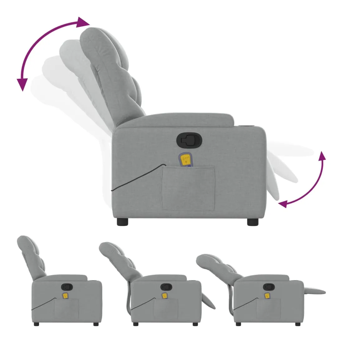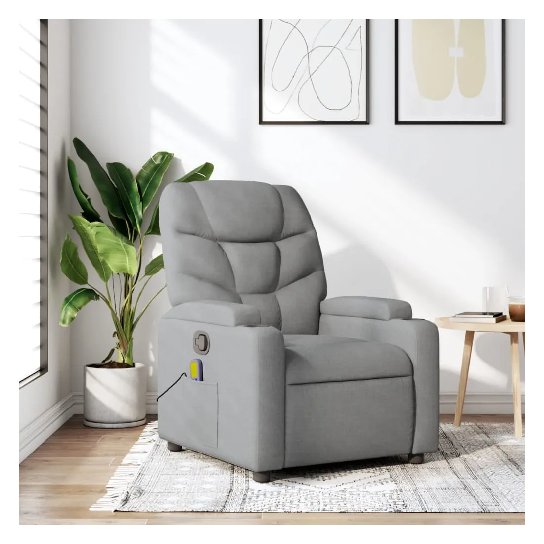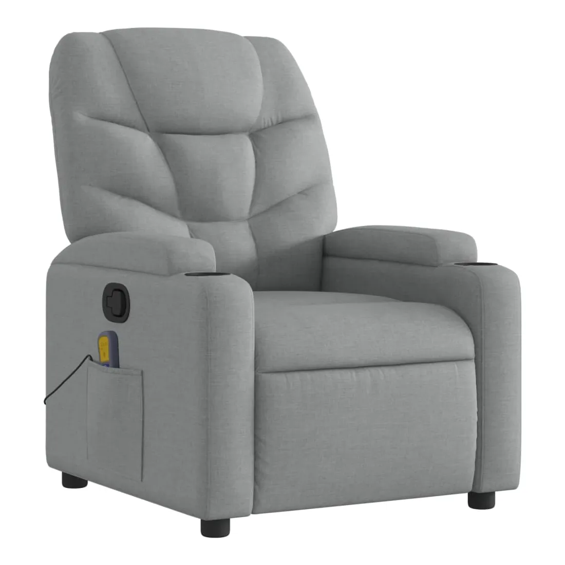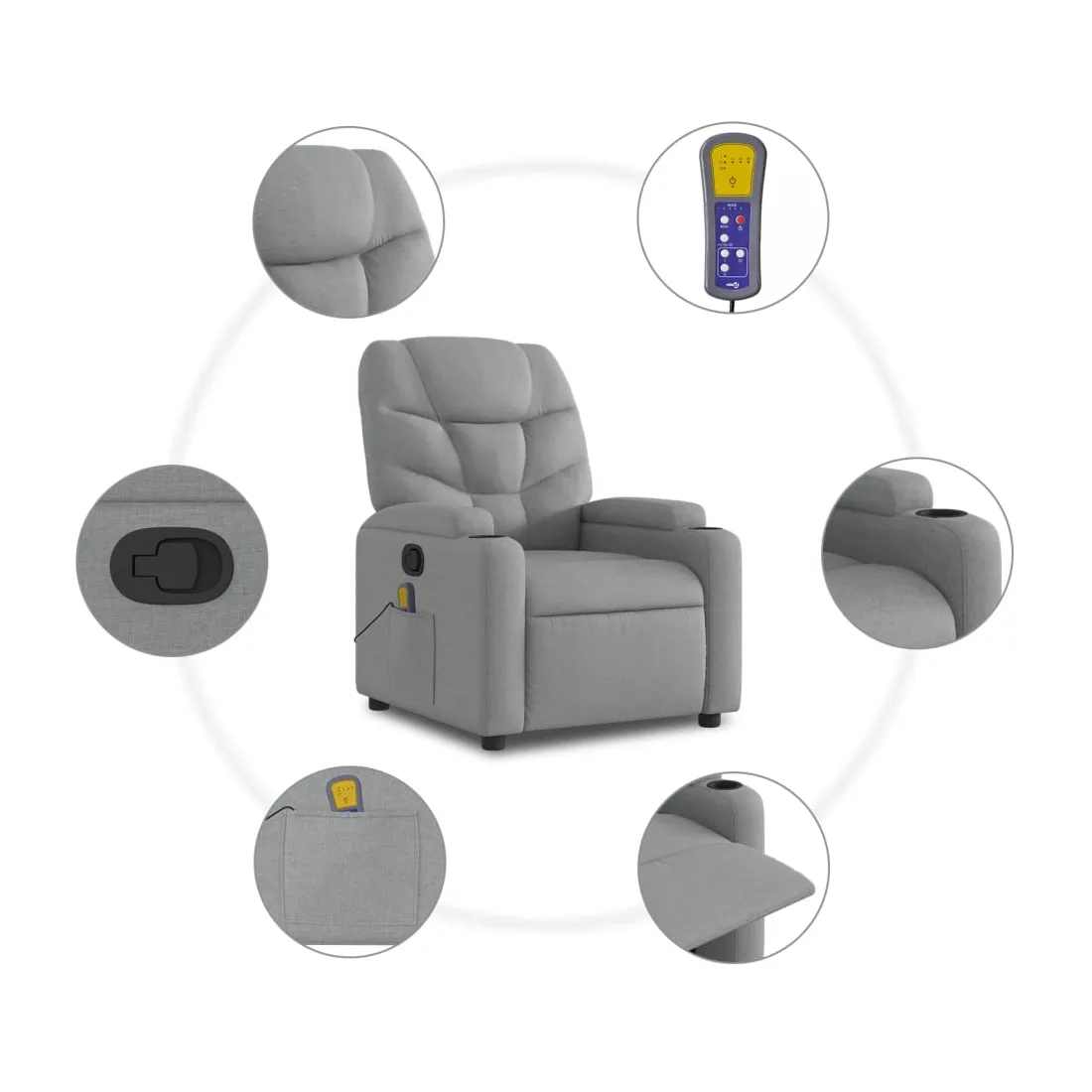 Asseyez-vous et détendez-vous dans ce fauteuil inclinable de massage très confortable ! Fonction d'inclinaison manuelle : ce fauteuil inclinable est doté d'une poignée du côté droit. Vous pouvez régler manuellement le repose-pieds et le dossier dans n'importe quelle position selon votre confort en tirant simplement sur la poignée. Cette fonction permet une inclinaison maximale de 135 degrés. De plus, le dossier peut revenir rapidement à sa position d'origine en tirant simplement sur la poignée.Fonction de vibration : les 6 points de massage vous permettent de faire l'expérience d'un massage mieux ciblé. De plus, la télécommande incluse vous permet de choisir différents programmes de massage. La fonction de massage est alimentée par le connecteur USB, mais la source d'alimentation USB 5V certifiée n'est pas incluse.Expérience d'assise confortable : le siège, le dossier et les larges accoudoirs bien rembourrés recouverts de tissu procurent une sensation confortable et chaleureuse, vous permettant de vous sentir enveloppé lorsque vous êtes assis. Le tissu présente un aspect simple et épuré et est respirant et durable.Porte-gobelets et poche latérale pratiques : ce fauteuil dispose de deux porte-gobelets pratiques pour vos boissons et d'une poche latérale pour votre télécommande ou pour garder vos objets essentiels à portée de main.Cadre solide et stable : le cadre en bois et en métal offre une structure solide et une grande stabilité. Ce fauteuil inclinable est confortable et durable.