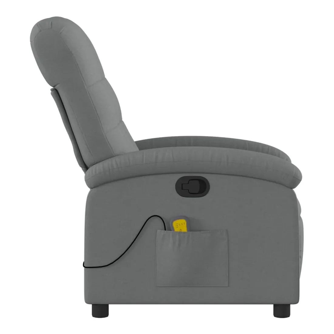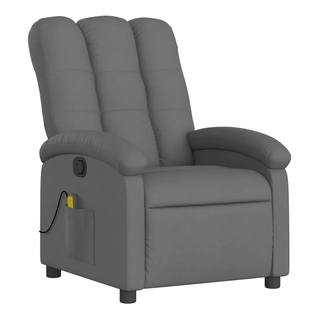 Asseyez-vous et détendez-vous dans ce fauteuil inclinable de massage très confortable ! Fonction d'inclinaison manuelle : ce fauteuil inclinable est doté d'une poignée du côté droit. Vous pouvez régler manuellement le repose-pieds et le dossier dans n'importe quelle position selon votre confort en tirant simplement sur la poignée. Cette fonction permet une inclinaison maximale de 135 degrés. De plus, le dossier peut revenir rapidement à sa position d'origine en tirant simplement sur la poignée.Fonction de vibration : les 6 points de massage vous permettent de faire l'expérience d'un massage mieux ciblé. De plus, la télécommande incluse vous permet de choisir différents programmes de massage. La fonction de massage est alimentée par le connecteur USB, mais la source d'alimentation USB 5V certifiée n'est pas incluse.Expérience d'assise confortable : le siège, le dossier et les larges accoudoirs bien rembourrés recouverts de tissu procurent une sensation confortable et chaleureuse, vous permettant de vous sentir enveloppé lorsque vous êtes assis. Le tissu présente un aspect simple et épuré et est respirant et durable.Poche latérale pratique : ce fauteuil est doté d'une poche latérale pour ranger votre télécommande ou garder vos objets essentiels à portée de main.Cadre solide et stable : le cadre en bois et en métal offre une structure solide et une grande stabilité. Ce fauteuil inclinable est confortable et durable.