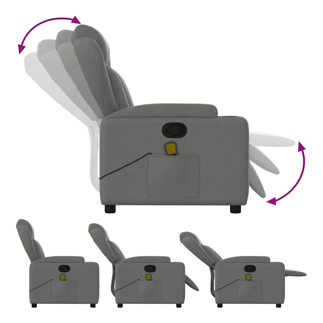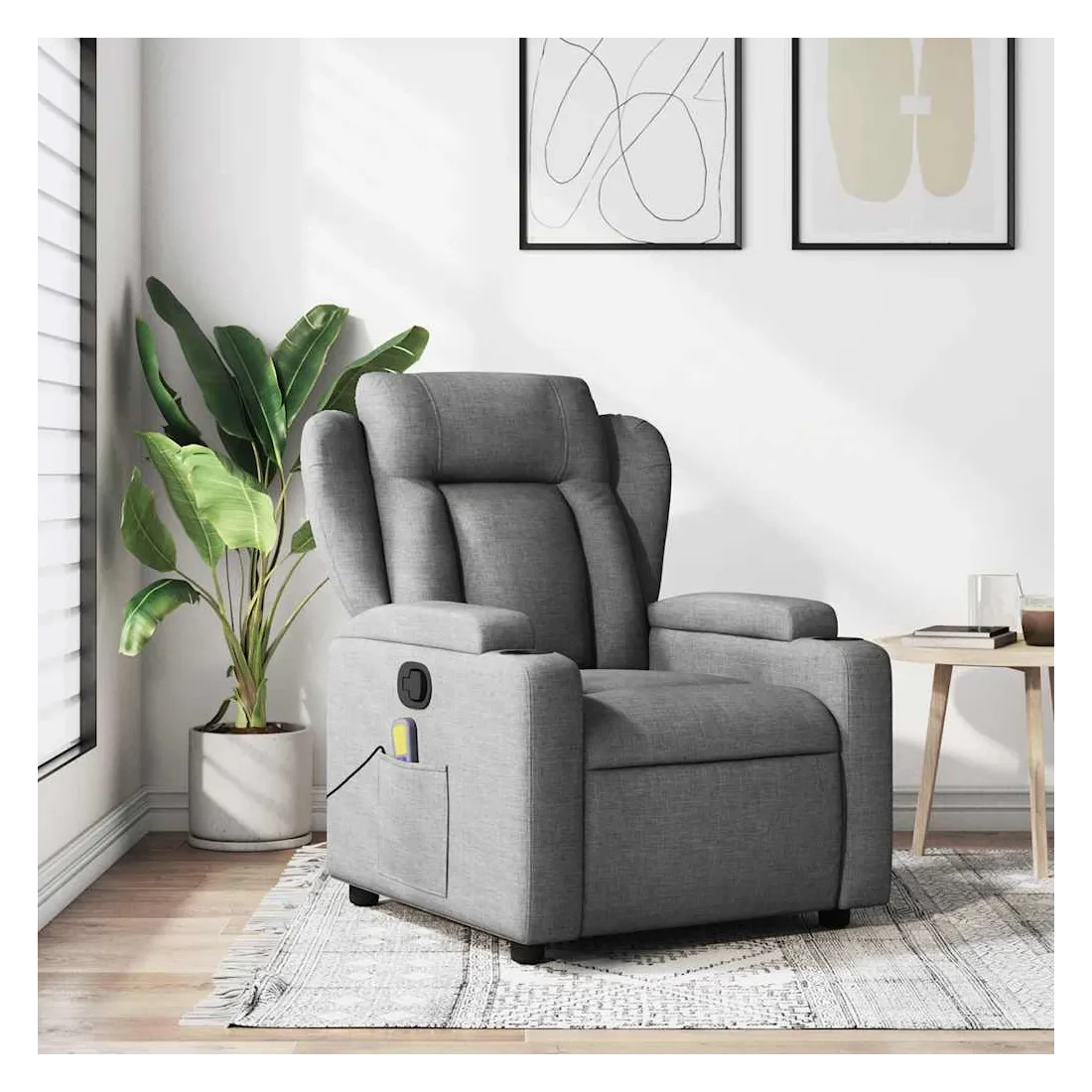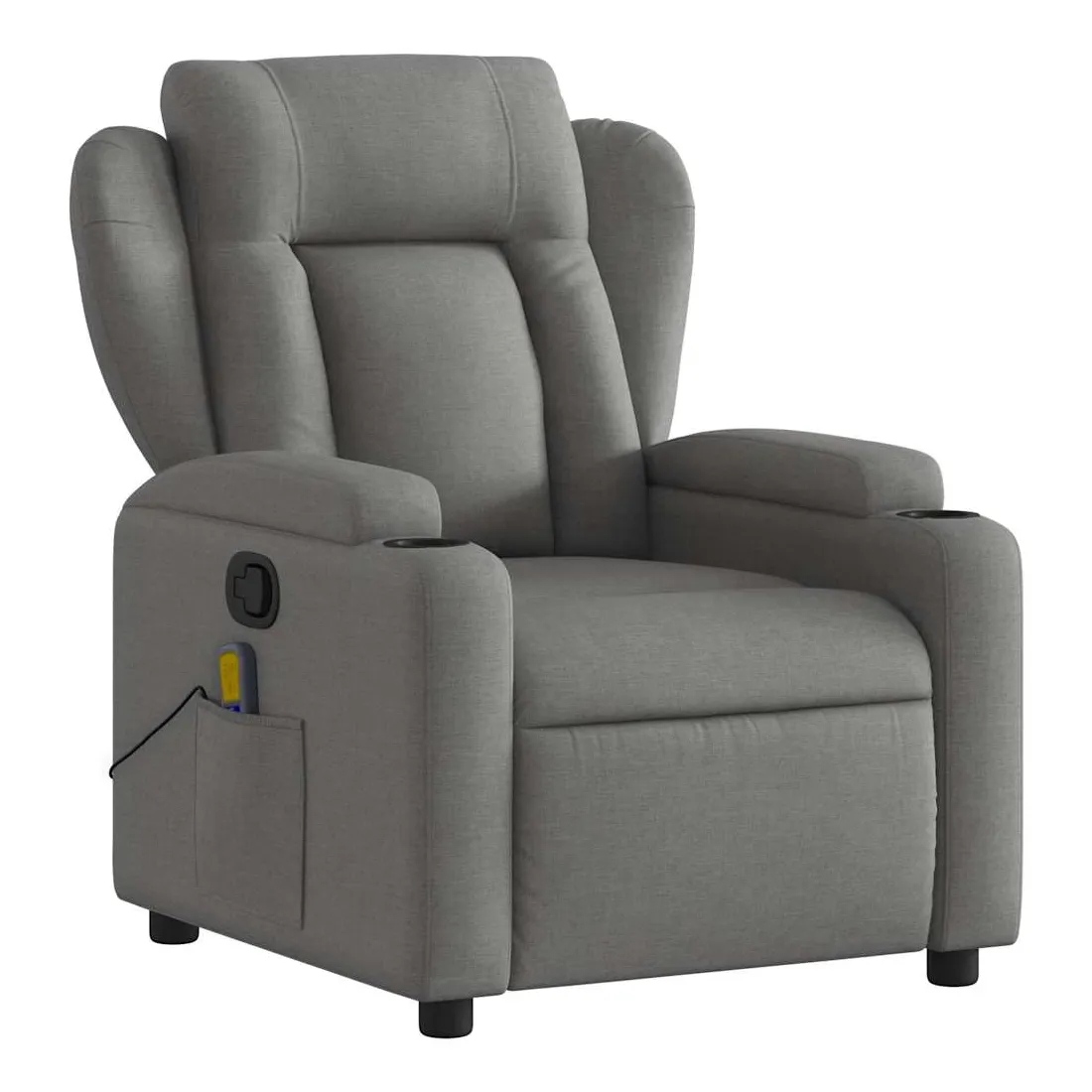 Asseyez-vous et détendez-vous dans ce fauteuil inclinable de massage très confortable ! Fonction d'inclinaison manuelle : ce fauteuil inclinable est doté d'une poignée du côté droit. Vous pouvez régler manuellement le repose-pieds et le dossier dans n'importe quelle position selon votre confort en tirant simplement sur la poignée. Cette fonction permet une inclinaison maximale de 135 degrés. De plus, le dossier peut revenir rapidement à sa position d'origine en tirant simplement sur la poignée.Fonction de vibration : les 6 points de massage vous permettent de faire l'expérience d'un massage mieux ciblé. De plus, la télécommande incluse vous permet de choisir différents programmes de massage. La fonction de massage est alimentée par le connecteur USB, mais la source d'alimentation USB 5V certifiée n'est pas incluse.Expérience d'assise confortable : le siège, le dossier et les larges accoudoirs bien rembourrés recouverts de tissu procurent une sensation confortable et chaleureuse, vous permettant de vous sentir enveloppé lorsque vous êtes assis. Le tissu présente un aspect simple et épuré et est respirant et durable.Porte-gobelets et poche latérale pratiques : ce fauteuil dispose de deux porte-gobelets pratiques pour vos boissons et d'une poche latérale pour votre télécommande ou pour garder vos objets essentiels à portée de main.Cadre solide et stable : le cadre en bois et en métal offre une structure solide et une grande stabilité. Ce fauteuil inclinable est confortable et durable.