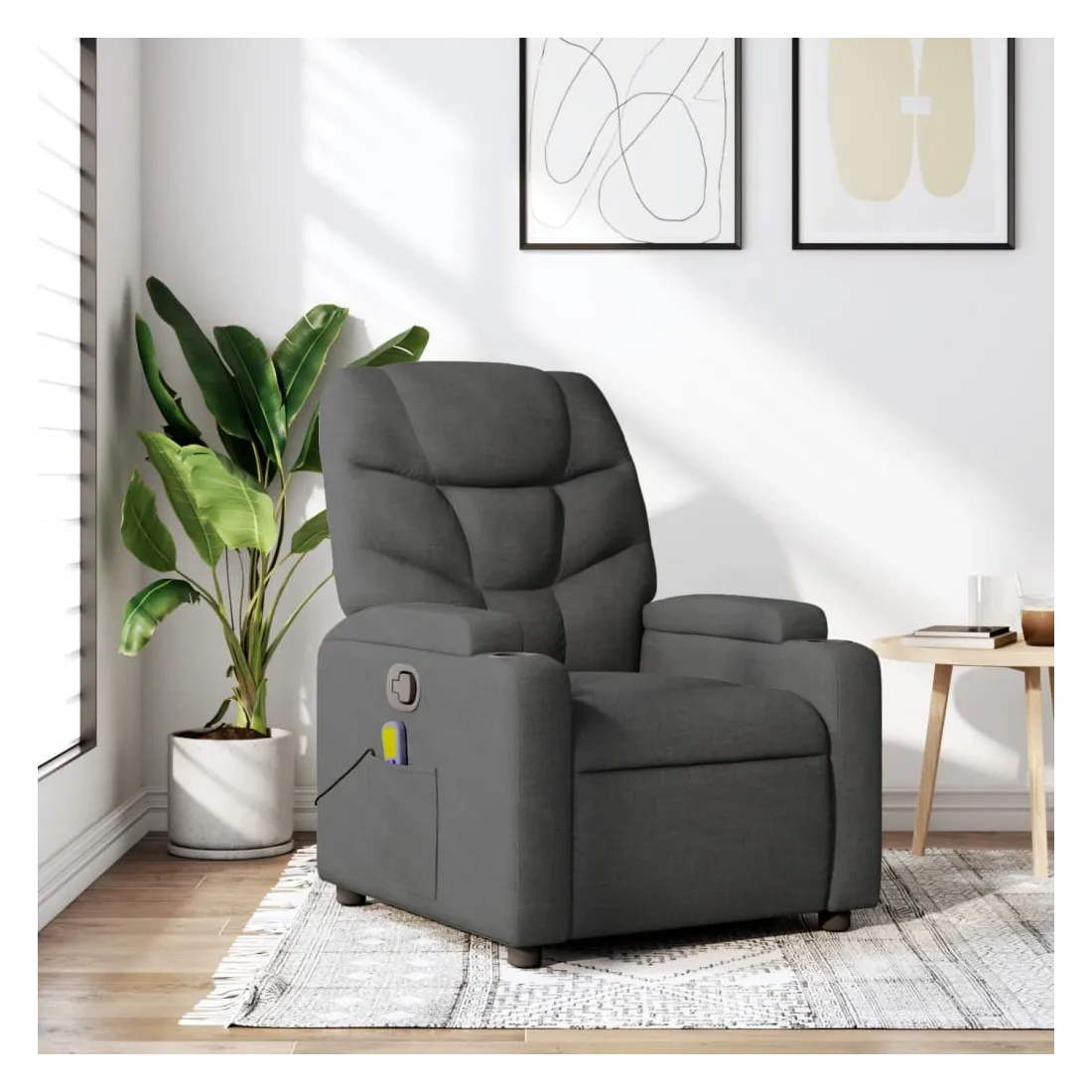 Asseyez-vous et détendez-vous dans ce fauteuil inclinable de massage très confortable ! Fonction d'inclinaison manuelle : ce fauteuil inclinable est doté d'une poignée du côté droit. Vous pouvez régler manuellement le repose-pieds et le dossier dans n'importe quelle position selon votre confort en tirant simplement sur la poignée. Cette fonction permet une inclinaison maximale de 135 degrés. De plus, le dossier peut revenir rapidement à sa position d'origine en tirant simplement sur la poignée.Fonction de vibration : les 6 points de massage vous permettent de faire l'expérience d'un massage mieux ciblé. De plus, la télécommande incluse vous permet de choisir différents programmes de massage. La fonction de massage est alimentée par le connecteur USB, mais la source d'alimentation USB 5V certifiée n'est pas incluse.Expérience d'assise confortable : le siège, le dossier et les larges accoudoirs bien rembourrés recouverts de tissu procurent une sensation confortable et chaleureuse, vous permettant de vous sentir enveloppé lorsque vous êtes assis. Le tissu présente un aspect simple et épuré et est respirant et durable.Porte-gobelets et poche latérale pratiques : ce fauteuil dispose de deux porte-gobelets pratiques pour vos boissons et d'une poche latérale pour votre télécommande ou pour garder vos objets essentiels à portée de main.Cadre solide et stable : le cadre en bois et en métal offre une structure solide et une grande stabilité. Ce fauteuil inclinable est confortable et durable.