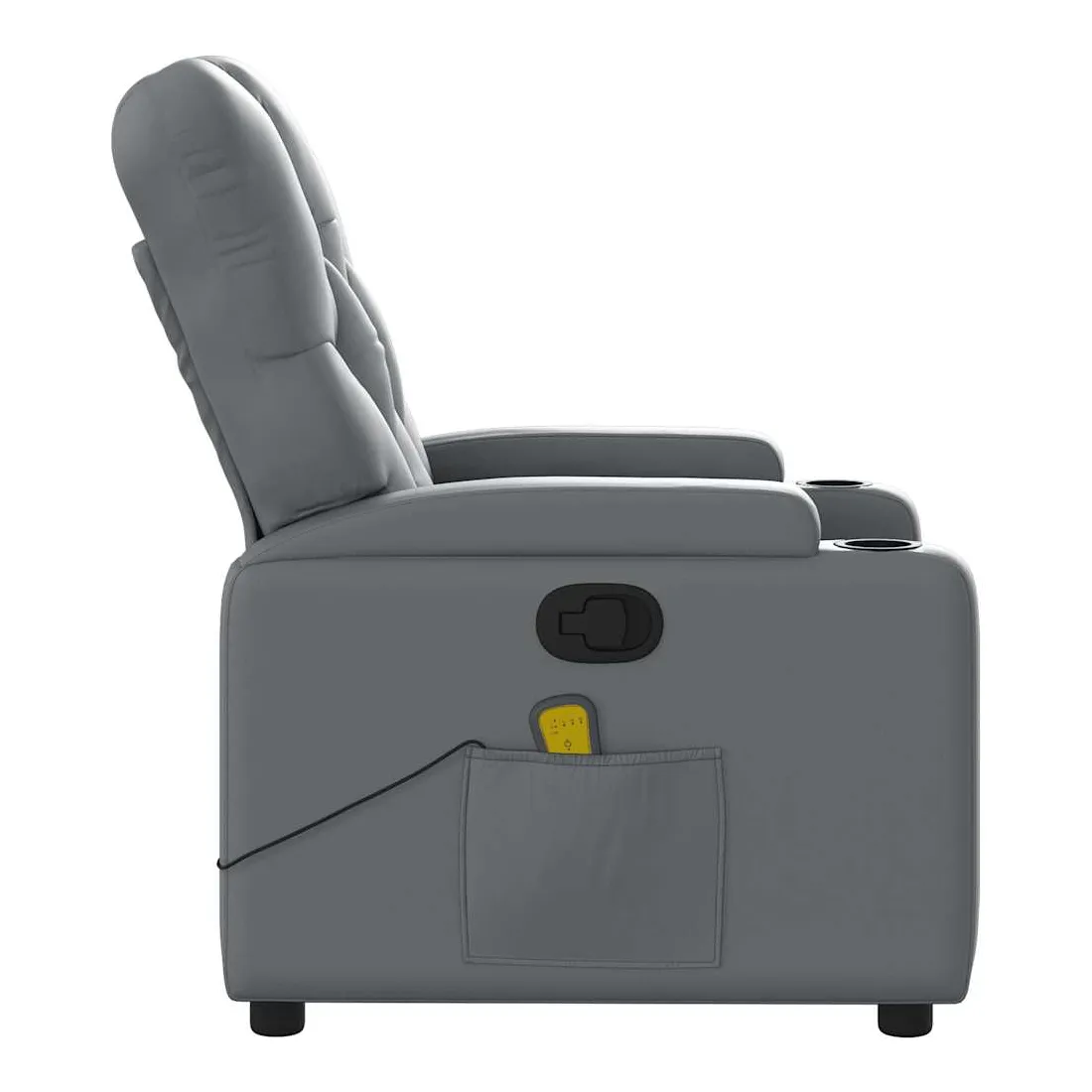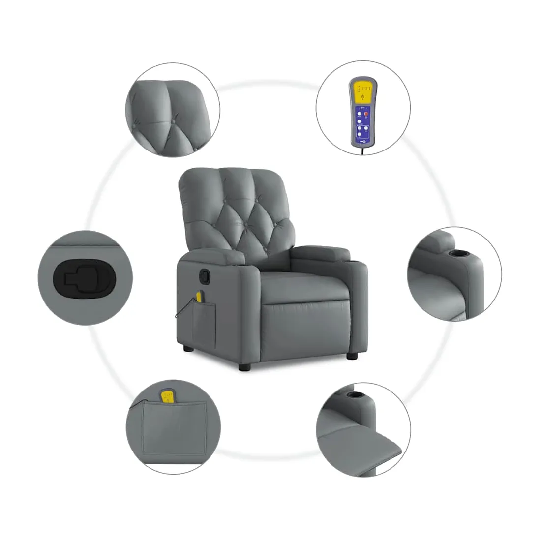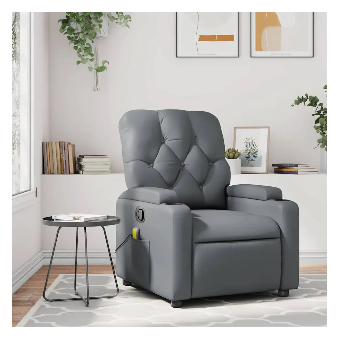 Asseyez-vous et détendez-vous dans ce fauteuil inclinable de massage très confortable ! Fonction d'inclinaison manuelle : ce fauteuil inclinable est doté d'une poignée du côté droit. Vous pouvez régler manuellement le repose-pieds et le dossier dans n'importe quelle position selon votre confort en tirant simplement sur la poignée. Cette fonction permet une inclinaison maximale de 135 degrés. De plus, le dossier peut revenir rapidement à sa position d'origine en tirant simplement sur la poignée.Fonction de vibration : les 6 points de massage vous permettent de faire l'expérience d'un massage mieux ciblé. De plus, la télécommande incluse vous permet de choisir différents programmes de massage. La fonction de massage est alimentée par le connecteur USB, mais la source d'alimentation USB 5V certifiée n'est pas incluse.Expérience de siège confortable : le siège, le dossier et les larges accoudoirs rembourrés épais recouverts de similicuir procurent une sensation confortable, vous faisant vous sentir enlacé lorsque vous êtes assis. Le similicuir est un matériau très résistant. Il est résistant aux taches, ce qui le rend facile à nettoyer avec un chiffon humide. La surface lisse donne également un aspect luxueux et la beauté du cuir véritable.Porte-gobelets et poche latérale pratiques : ce fauteuil dispose de deux porte-gobelets pratiques pour vos boissons et d'une poche latérale pour votre télécommande ou pour garder vos objets essentiels à portée de main.Cadre solide et stable : le cadre en bois et en métal offre une structure solide et une grande stabilité. Ce fauteuil inclinable est confortable et durable.