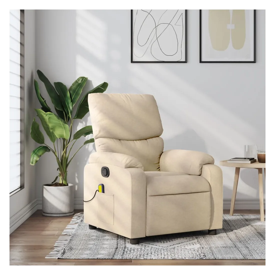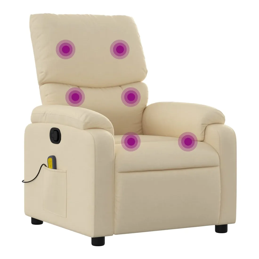 Asseyez-vous et détendez-vous dans ce fauteuil inclinable de massage très confortable ! Fonction d'inclinaison manuelle : ce fauteuil inclinable est doté d'une poignée du côté droit. Vous pouvez régler manuellement le repose-pieds et le dossier dans n'importe quelle position selon votre confort en tirant simplement sur la poignée. Cette fonction permet une inclinaison maximale de 135 degrés. De plus, le dossier peut revenir rapidement à sa position d'origine en tirant simplement sur la poignée.Fonction de vibration : les 6 points de massage vous permettent de faire l'expérience d'un massage mieux ciblé. De plus, la télécommande incluse vous permet de choisir différents programmes de massage. La fonction de massage est alimentée par le connecteur USB, mais la source d'alimentation USB 5V certifiée n'est pas incluse.Expérience d'assise confortable : le siège, le dossier et les larges accoudoirs bien rembourrés recouverts de tissu procurent une sensation confortable et chaleureuse, vous permettant de vous sentir enveloppé lorsque vous êtes assis. Le tissu présente un aspect simple et épuré et est respirant et durable.Poche latérale pratique : ce fauteuil est doté d'une poche latérale pour ranger votre télécommande ou garder vos objets essentiels à portée de main.Cadre solide et stable : le cadre en bois et en métal offre une structure solide et une grande stabilité. Ce fauteuil inclinable est confortable et durable.
