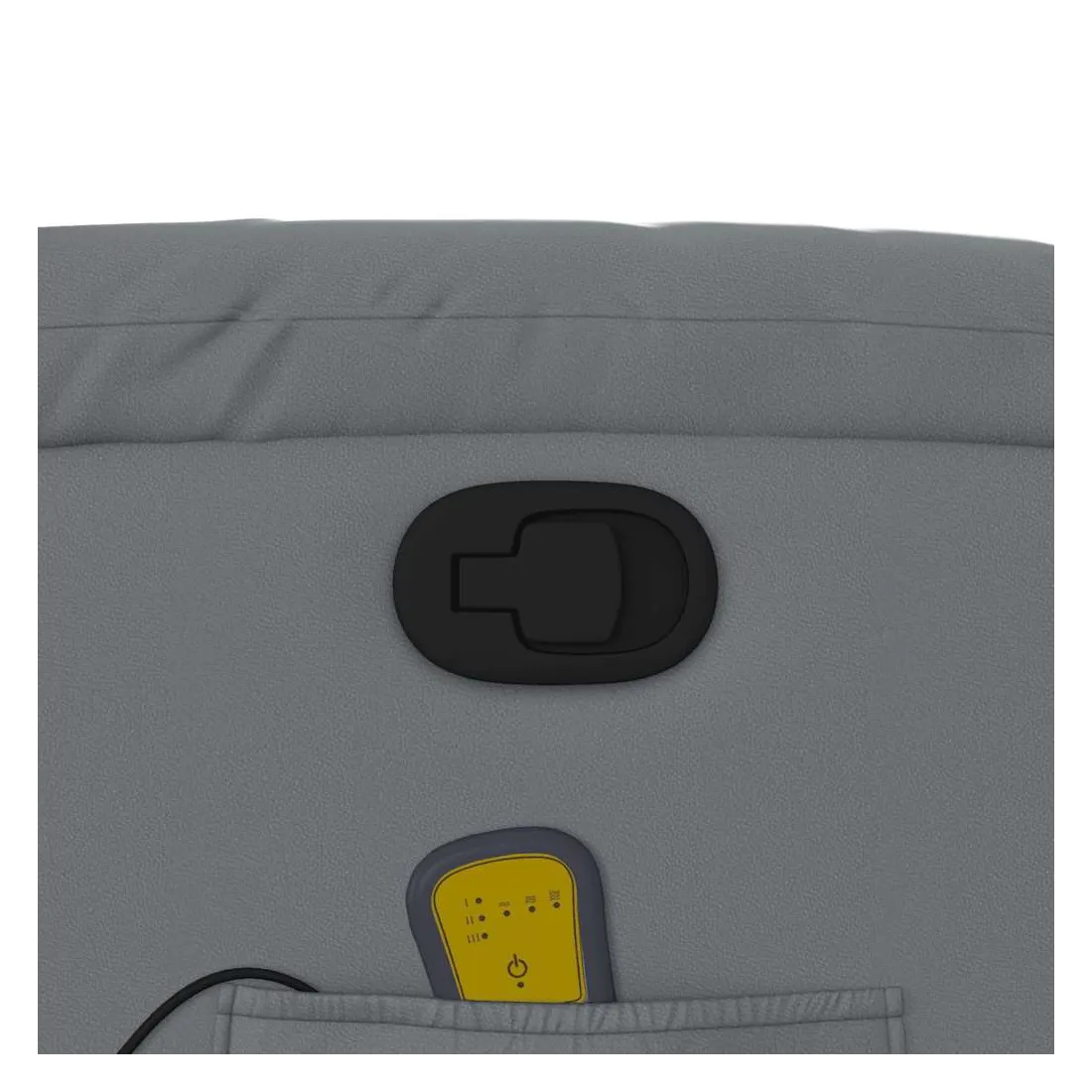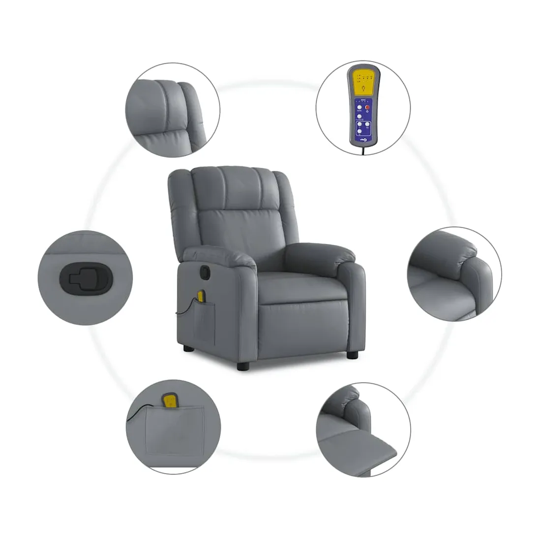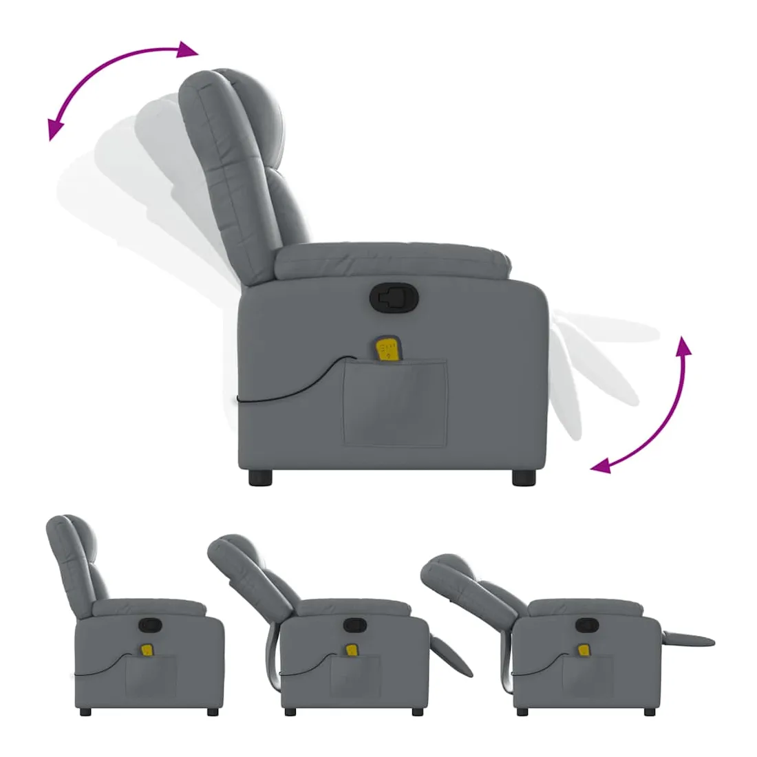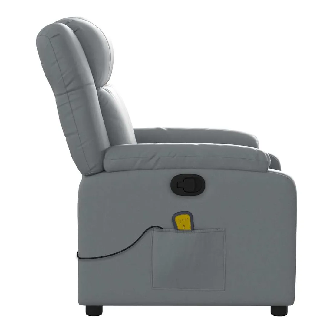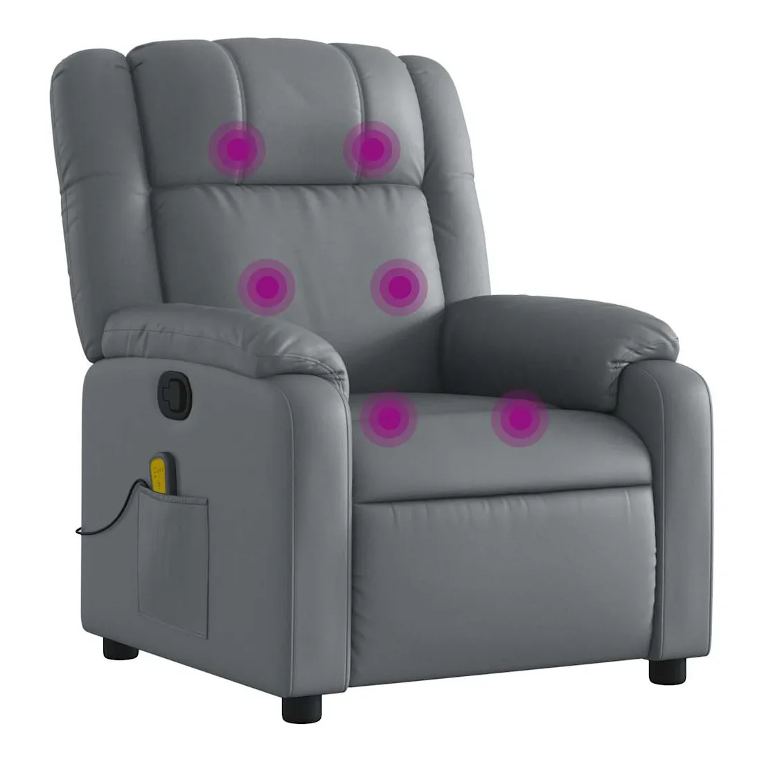 Asseyez-vous et détendez-vous dans ce fauteuil inclinable de massage très confortable ! Fonction d'inclinaison manuelle : ce fauteuil inclinable est doté d'une poignée du côté droit. Vous pouvez régler manuellement le repose-pieds et le dossier dans n'importe quelle position selon votre confort en tirant simplement sur la poignée. Cette fonction permet une inclinaison maximale de 135 degrés. De plus, le dossier peut revenir rapidement à sa position d'origine en tirant simplement sur la poignée.Fonction de vibration : les 6 points de massage vous permettent de faire l'expérience d'un massage mieux ciblé. De plus, la télécommande incluse vous permet de choisir différents programmes de massage. La fonction de massage est alimentée par le connecteur USB, mais la source d'alimentation USB 5V certifiée n'est pas incluse.Expérience de siège confortable : le siège, le dossier et les larges accoudoirs rembourrés épais recouverts de similicuir procurent une sensation confortable, vous faisant vous sentir enlacé lorsque vous êtes assis. Le similicuir est un matériau très résistant. Il est résistant aux taches, ce qui le rend facile à nettoyer avec un chiffon humide. La surface lisse donne également un aspect luxueux et la beauté du cuir véritable.Poche latérale pratique : ce fauteuil est doté d'une poche latérale pour ranger votre télécommande ou garder vos objets essentiels à portée de main.Cadre solide et stable : le cadre en bois et en métal offre une structure solide et une grande stabilité. Ce fauteuil inclinable est confortable et durable.