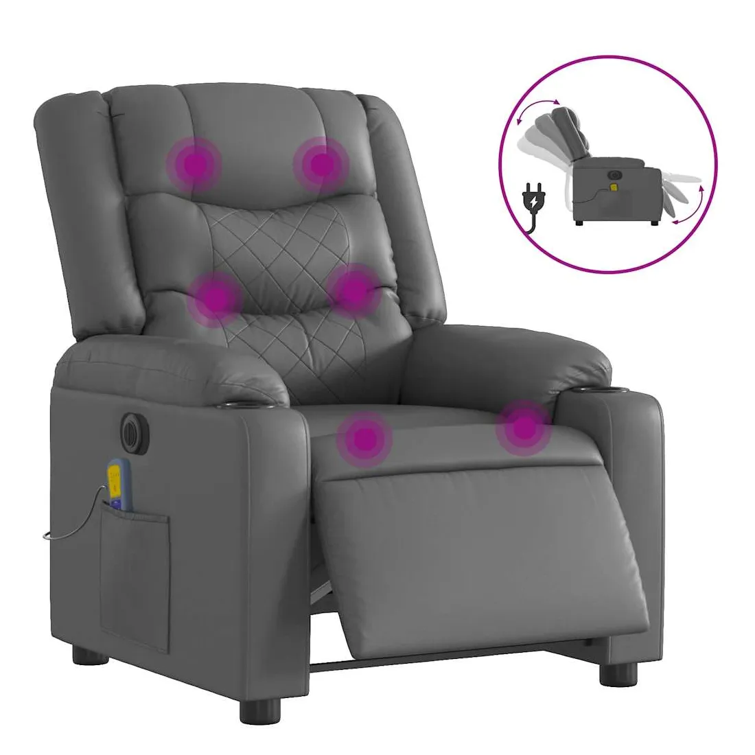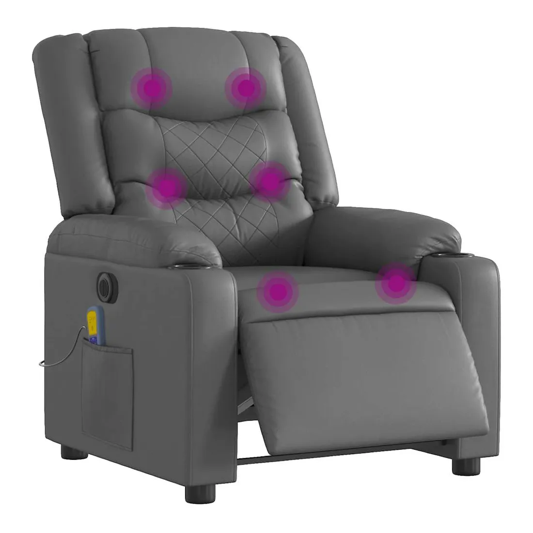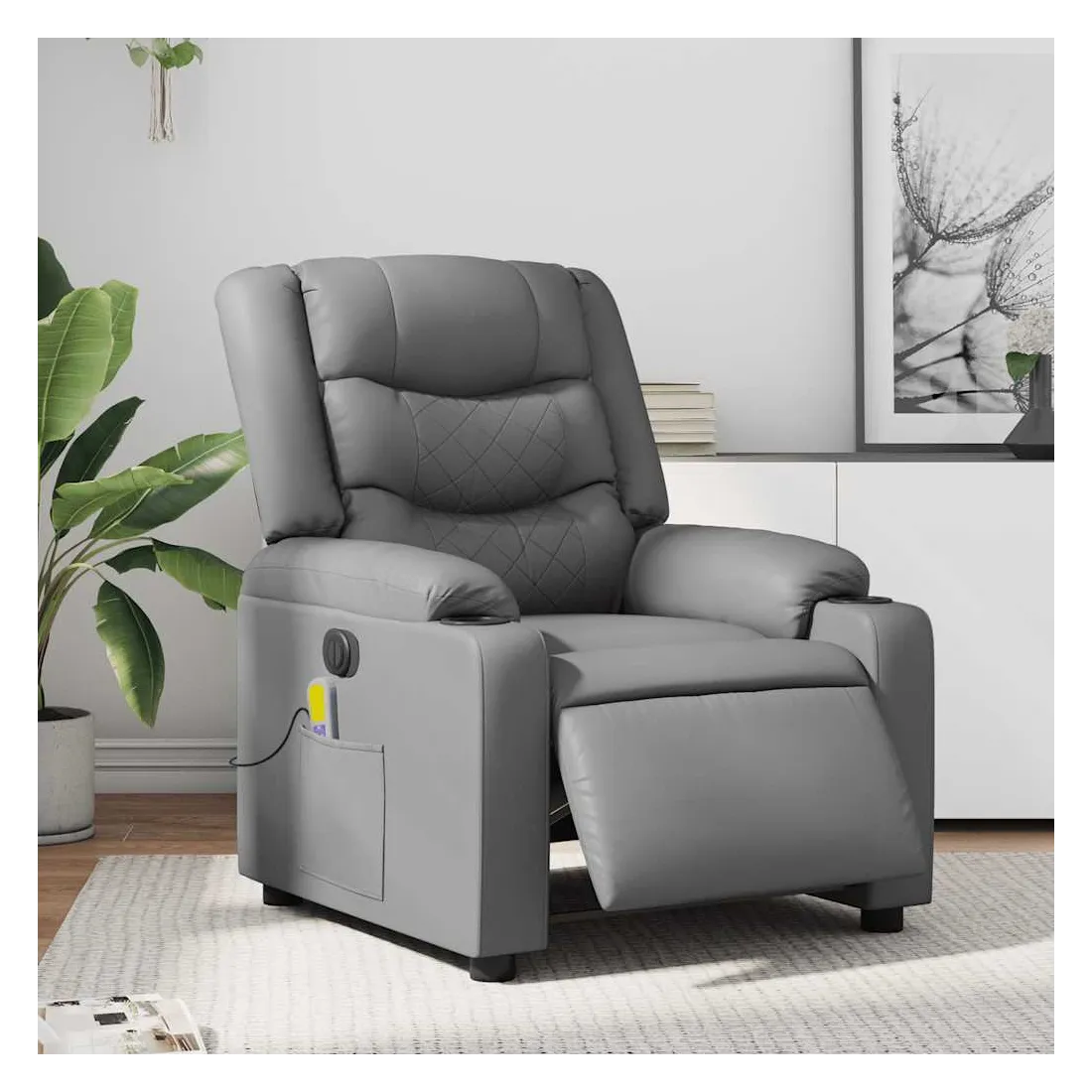 Asseyez-vous et détendez-vous dans ce fauteuil inclinable de massage électrique très confortable ! Fonction d'inclinaison électrique : ce fauteuil inclinable est équipé d'un moteur électrique qui permet de régler automatiquement le repose-pied et le dossier dans n'importe quelle position, selon votre confort, en appuyant simplement sur le bouton situé sur le côté du fauteuil. Cette fonction permet une inclinaison maximale de 135 degrés. En outre, le dossier peut revenir automatiquement à sa position d'origine par une simple pression sur le bouton.Fonction de vibration : les 6 points de massage vous permettent de faire l'expérience d'un massage mieux ciblé. De plus, la télécommande incluse vous permet de choisir différents programmes de massage. La fonction de massage est alimentée par le connecteur USB qui nécessite une source d'alimentation USB certifiée de 5 V (non fournie).Expérience de siège confortable : le siège, le dossier et les larges accoudoirs rembourrés épais recouverts de similicuir procurent une sensation confortable, vous faisant vous sentir enlacé lorsque vous êtes assis. Le similicuir est un matériau très résistant. Il est résistant aux taches, ce qui le rend facile à nettoyer avec un chiffon humide. La surface lisse donne également un aspect luxueux et la beauté du cuir véritable.Poche latérale pratique : ce fauteuil est doté d'une poche latérale pour ranger votre télécommande ou garder vos objets essentiels à portée de main.Cadre solide et stable : le cadre en bois et en métal offre une structure solide et une grande stabilité. Ce fauteuil inclinable est confortable et durable.