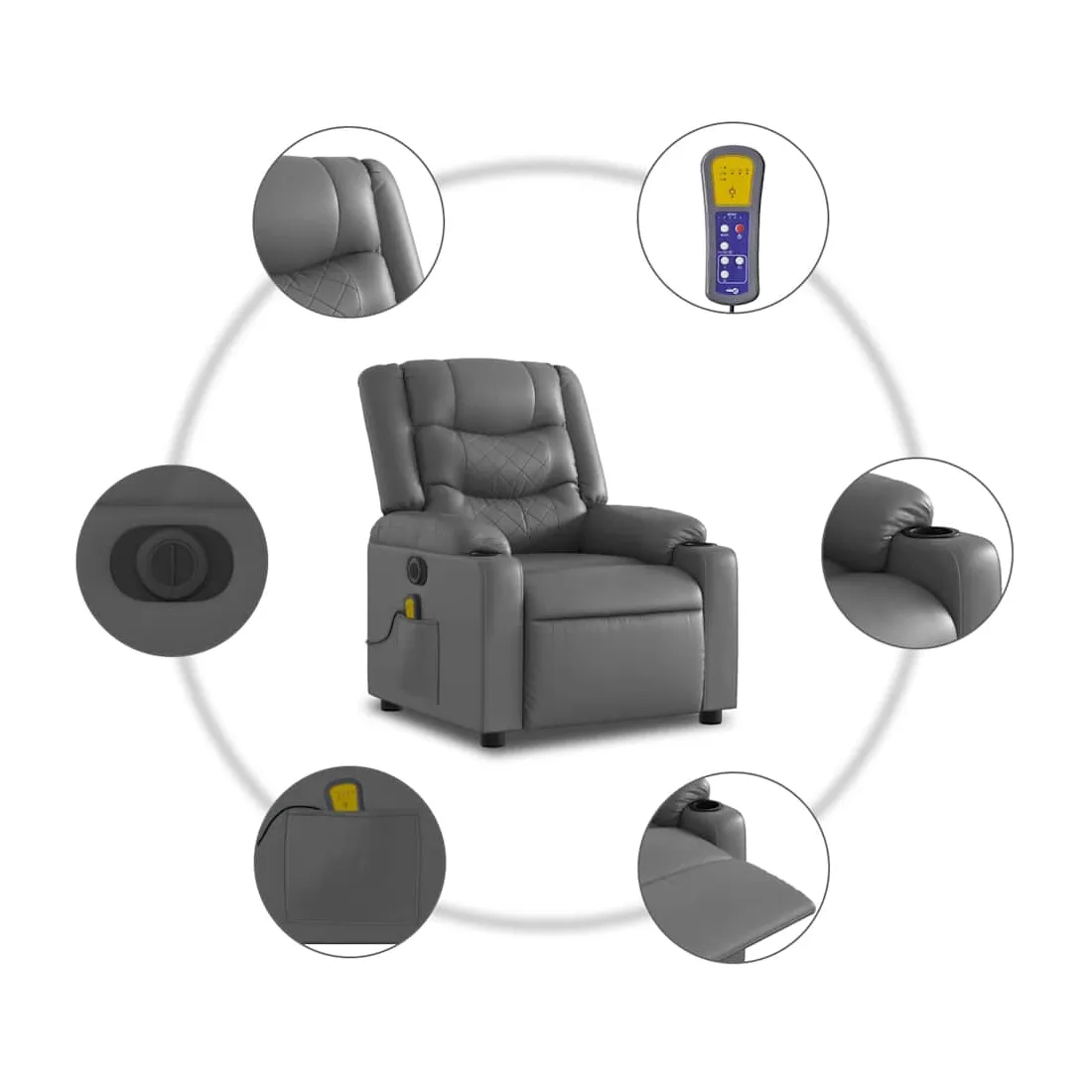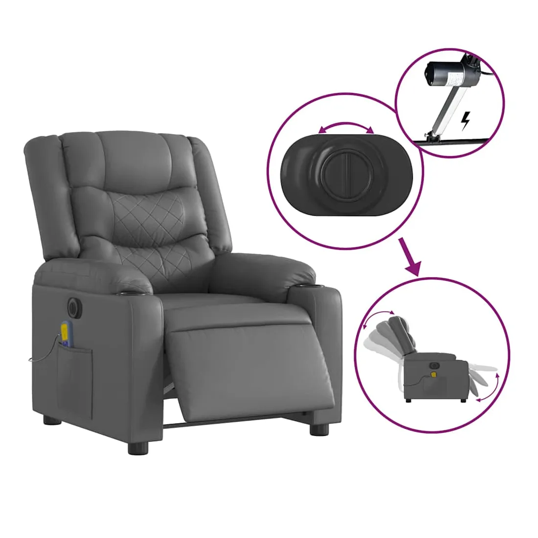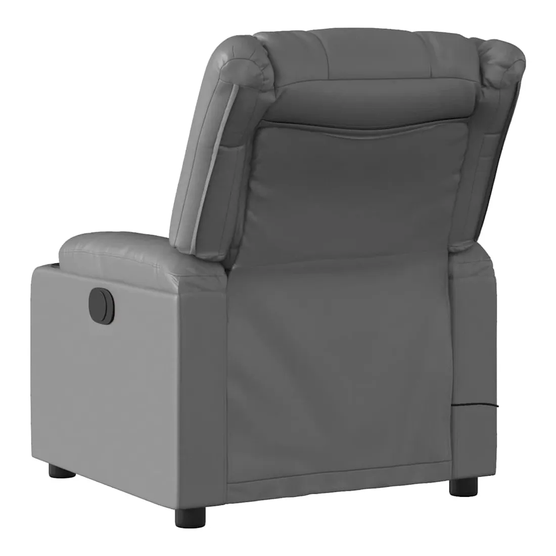 Asseyez-vous et détendez-vous dans ce fauteuil inclinable de massage électrique très confortable ! Fonction d'inclinaison électrique : ce fauteuil inclinable est équipé d'un moteur électrique qui permet de régler automatiquement le repose-pied et le dossier dans n'importe quelle position, selon votre confort, en appuyant simplement sur le bouton situé sur le côté du fauteuil. Cette fonction permet une inclinaison maximale de 135 degrés. En outre, le dossier peut revenir automatiquement à sa position d'origine par une simple pression sur le bouton.Fonction de vibration : les 6 points de massage vous permettent de faire l'expérience d'un massage mieux ciblé. De plus, la télécommande incluse vous permet de choisir différents programmes de massage. La fonction de massage est alimentée par le connecteur USB qui nécessite une source d'alimentation USB certifiée de 5 V (non fournie).Expérience de siège confortable : le siège, le dossier et les larges accoudoirs rembourrés épais recouverts de similicuir procurent une sensation confortable, vous faisant vous sentir enlacé lorsque vous êtes assis. Le similicuir est un matériau très résistant. Il est résistant aux taches, ce qui le rend facile à nettoyer avec un chiffon humide. La surface lisse donne également un aspect luxueux et la beauté du cuir véritable.Poche latérale pratique : ce fauteuil est doté d'une poche latérale pour ranger votre télécommande ou garder vos objets essentiels à portée de main.Cadre solide et stable : le cadre en bois et en métal offre une structure solide et une grande stabilité. Ce fauteuil inclinable est confortable et durable.