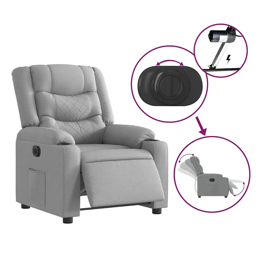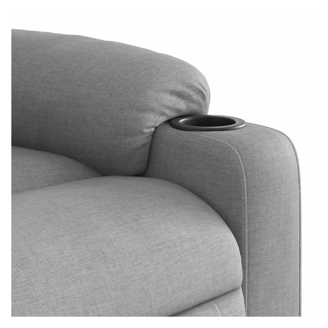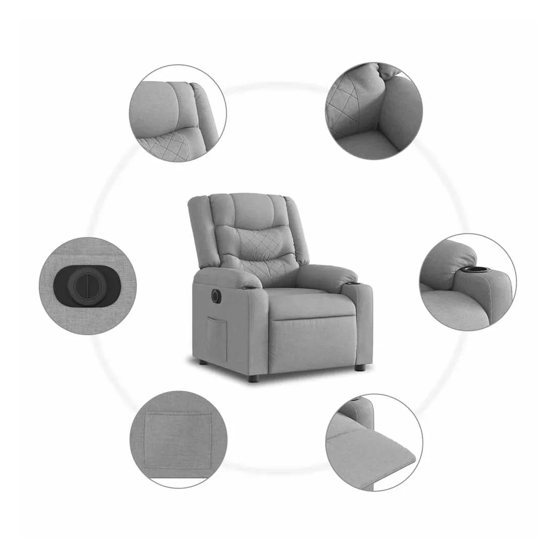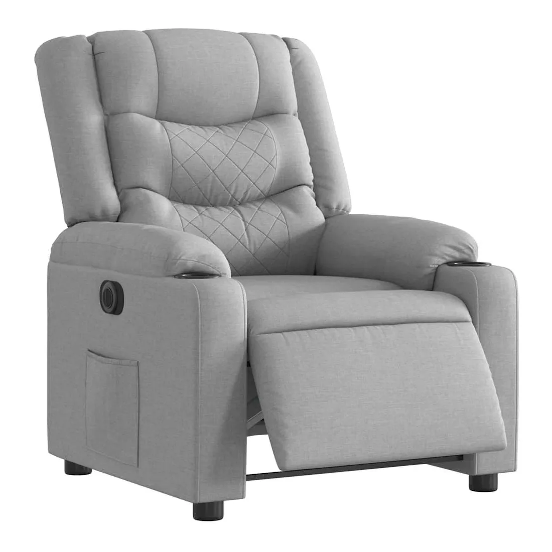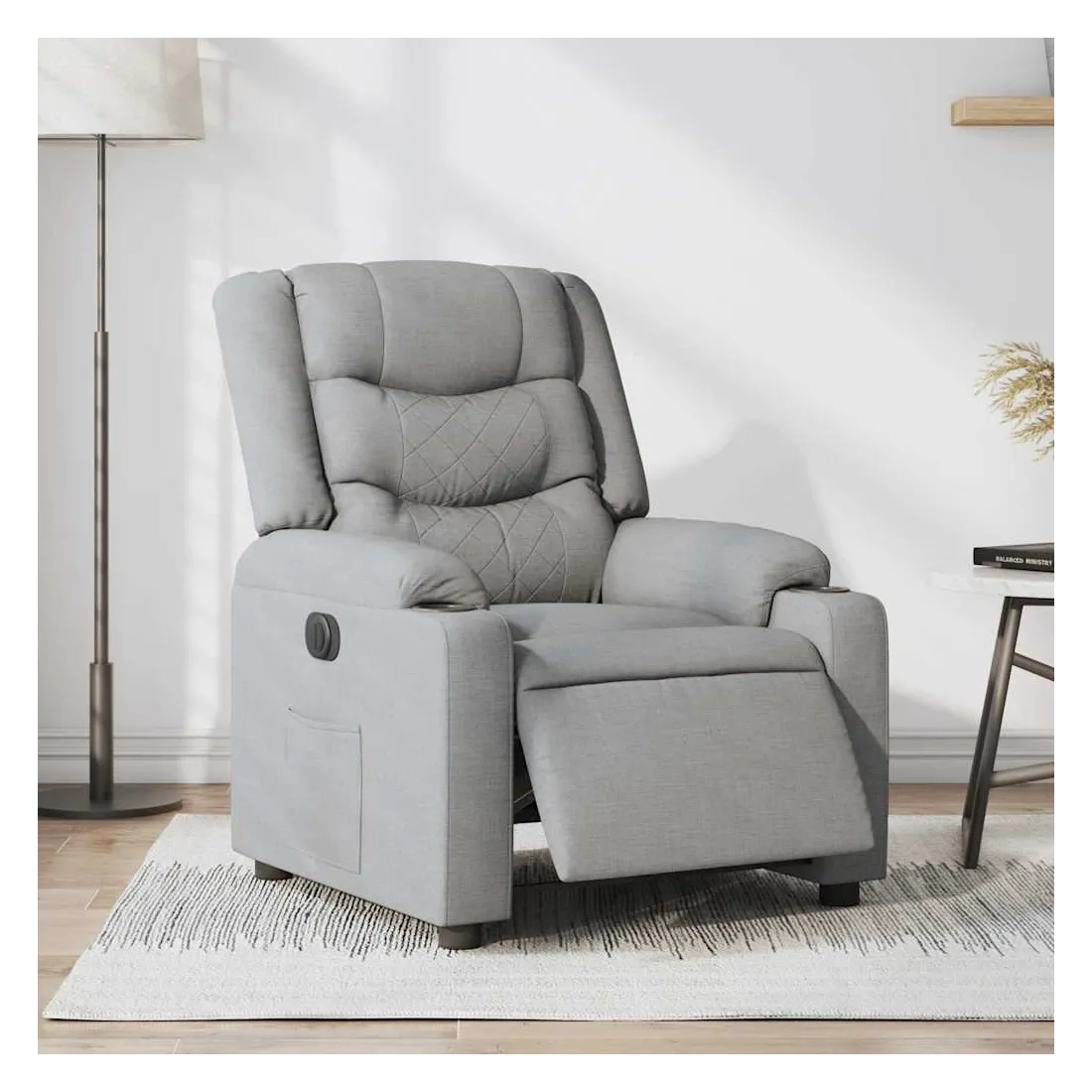 Asseyez-vous et détendez-vous dans ce fauteuil inclinable électrique très confortable ! Fonction d'inclinaison électrique : ce fauteuil inclinable est équipé d'un moteur électrique qui permet de régler automatiquement le repose-pied et le dossier dans n'importe quelle position, selon votre confort, en appuyant simplement sur le bouton situé sur le côté du fauteuil. Cette fonction permet une inclinaison maximale de 135 degrés. En outre, le dossier peut revenir automatiquement à sa position d'origine par une simple pression sur le bouton.Expérience d'assise confortable : le siège, le dossier et les larges accoudoirs bien rembourrés recouverts de tissu procurent une sensation confortable et chaleureuse, vous permettant de vous sentir enveloppé lorsque vous êtes assis. Le tissu présente un aspect simple et épuré et est respirant et durable.Poche latérale pratique : ce fauteuil est doté d'une poche latérale pour vous permettre de garder vos objets essentiels à portée de main.Cadre solide et stable : le cadre en bois et en métal offre une structure solide et une grande stabilité. Ce fauteuil inclinable est confortable et durable.
