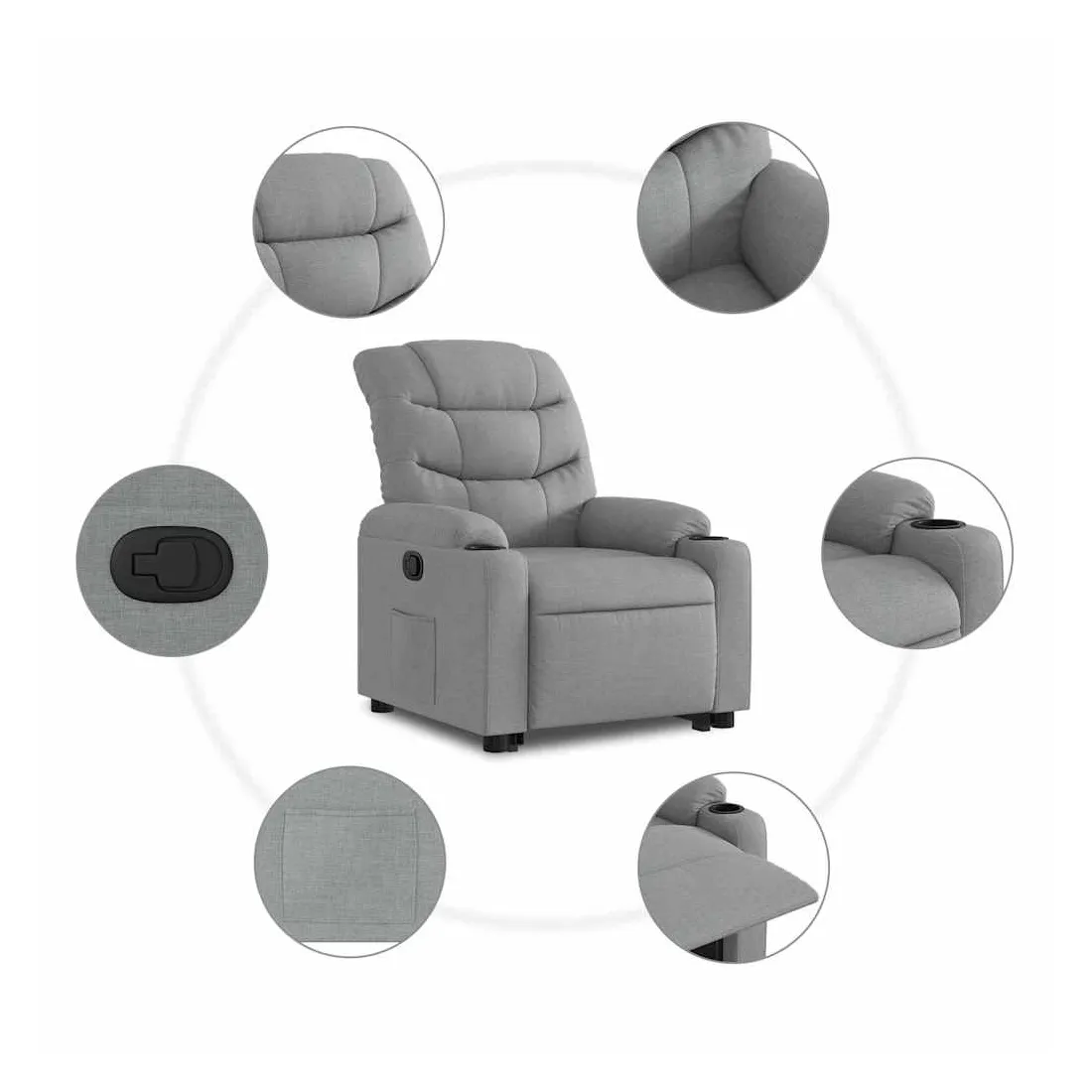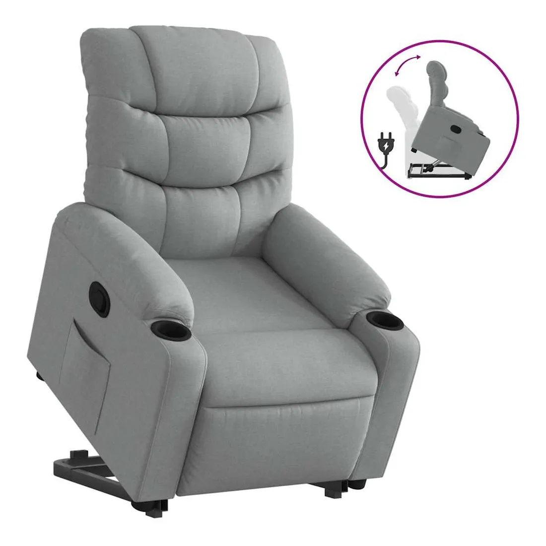 Asseyez-vous et détendez-vous dans ce fauteuil inclinable très confortable ! Fonction de levage électrique : ce fauteuil inclinable pour personnes âgées est équipé d'un moteur électrique pour la fonction de levage. Grâce à la fonction qui pousse toute la chaise vers le haut, vous pouvez facilement vous tenir debout sans stresser votre dos et vos genoux en appuyant simplement sur le bouton.Fonction d'inclinaison manuelle : ce fauteuil inclinable est doté d'une poignée du côté droit. Vous pouvez régler manuellement le repose-pieds et le dossier dans n'importe quelle position selon votre confort en tirant simplement sur la poignée. Cette fonction permet une inclinaison maximale de 135 degrés. De plus, le dossier peut revenir rapidement à sa position d'origine en tirant simplement sur la poignée.Expérience d'assise confortable : le siège, le dossier et les larges accoudoirs bien rembourrés recouverts de tissu procurent une sensation confortable et chaleureuse, vous permettant de vous sentir enveloppé lorsque vous êtes assis. Le tissu présente un aspect simple et épuré et est respirant et durable.Poche latérale pratique : ce fauteuil est doté d'une poche latérale pour vous permettre de garder vos objets essentiels à portée de main.Cadre solide et stable : le cadre en bois et en métal offre une structure solide et une grande stabilité. Ce fauteuil inclinable est confortable et durable.
