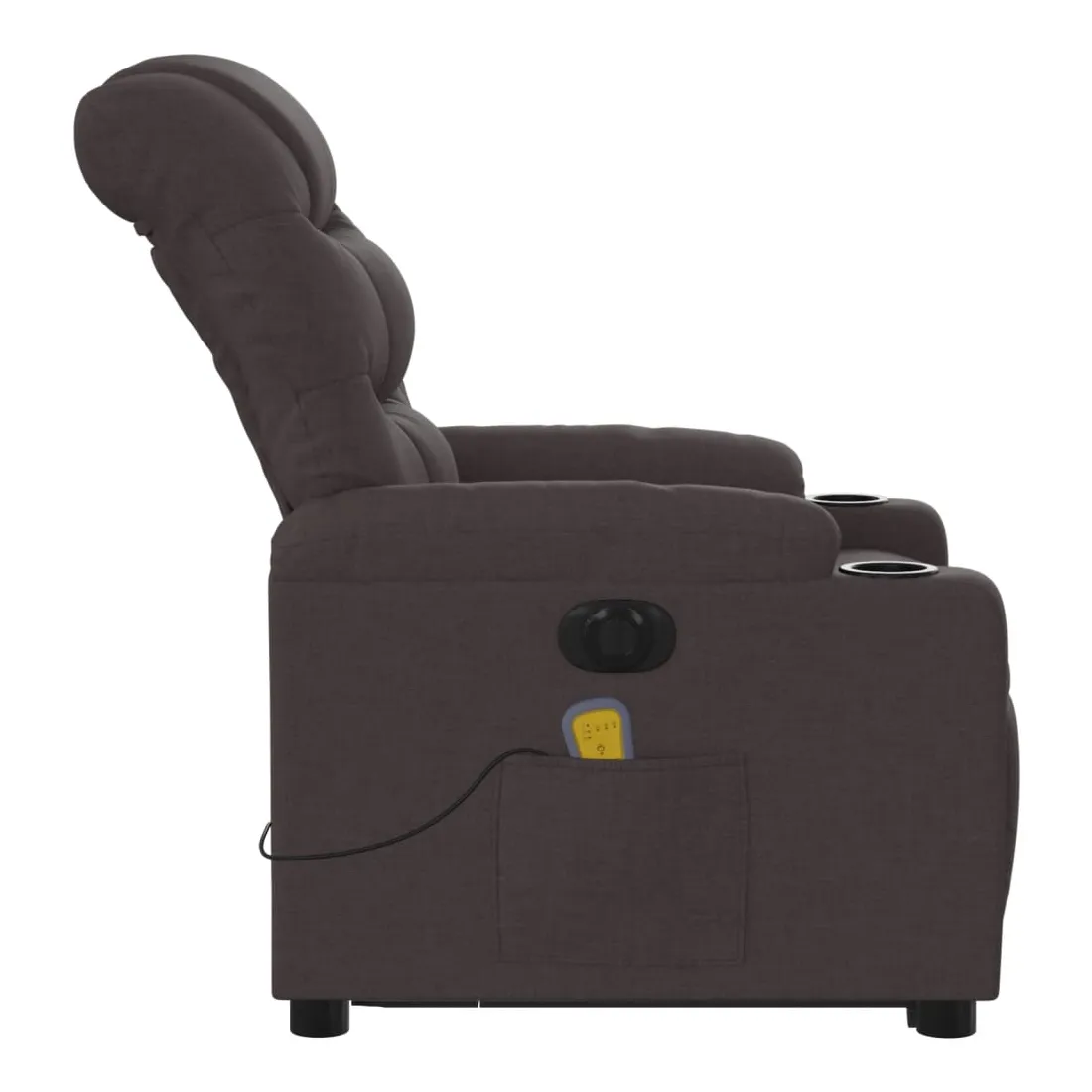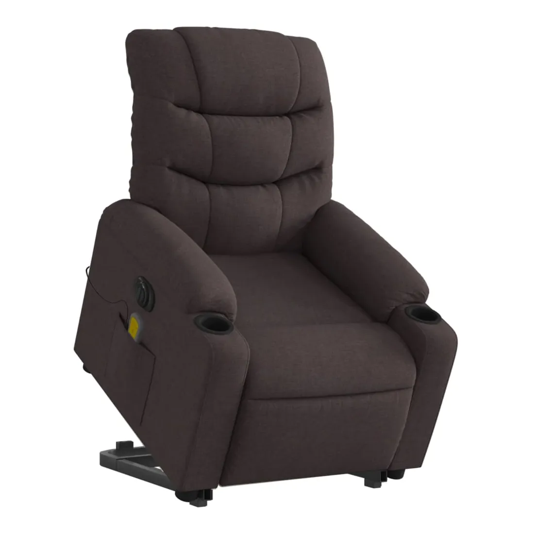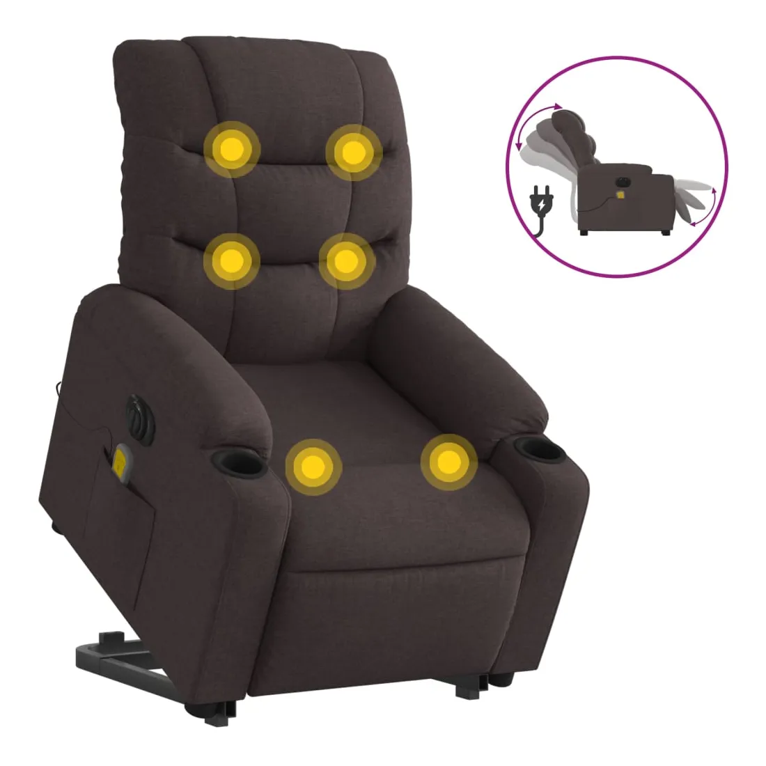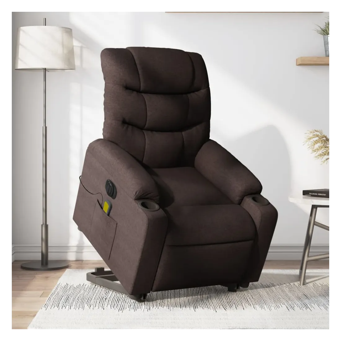 Asseyez-vous et détendez-vous dans ce fauteuil inclinable de massage électrique très confortable ! Fonction de levage électrique : ce fauteuil inclinable pour personnes âgées est équipé d'un moteur électrique pour la fonction de levage. Grâce à la fonction qui pousse toute la chaise vers le haut, vous pouvez facilement vous tenir debout sans stresser votre dos et vos genoux en appuyant simplement sur le bouton.Fonction d'inclinaison électrique : ce fauteuil inclinable est également équipé d'un moteur électrique qui permet de régler automatiquement le repose-pied et le dossier dans n'importe quelle position, selon votre confort, en appuyant simplement sur le bouton situé sur le côté du fauteuil. Cette fonction permet une inclinaison maximale de 135 degrés. En outre, le dossier peut revenir automatiquement à sa position d'origine par une simple pression sur le bouton.Fonction de vibration : les 6 points de massage vous permettent de faire l'expérience d'un massage mieux ciblé. De plus, la télécommande incluse vous permet de choisir différents programmes de massage. La fonction de massage est alimentée par le connecteur USB qui nécessite une source d'alimentation USB certifiée de 5 V (non fournie).Expérience d'assise confortable : le siège, le dossier et les larges accoudoirs bien rembourrés recouverts de tissu procurent une sensation confortable et chaleureuse, vous permettant de vous sentir enveloppé lorsque vous êtes assis. Le tissu présente un aspect simple et épuré et est respirant et durable.Poche latérale pratique : ce fauteuil est doté d'une poche latérale pour ranger votre télécommande ou garder vos objets essentiels à portée de main.Cadre solide et stable : le cadre en bois et en métal offre une structure solide et une grande stabilité. Ce fauteuil inclinable est confortable et durable.